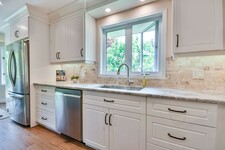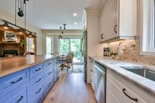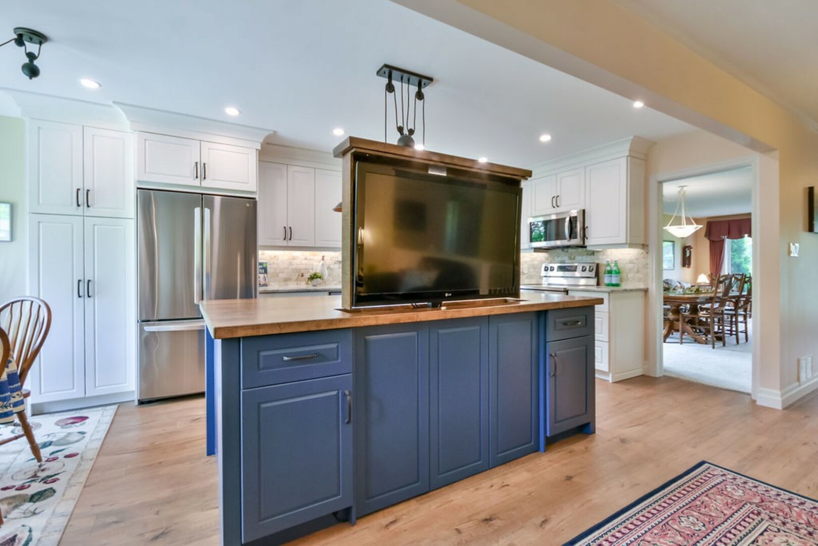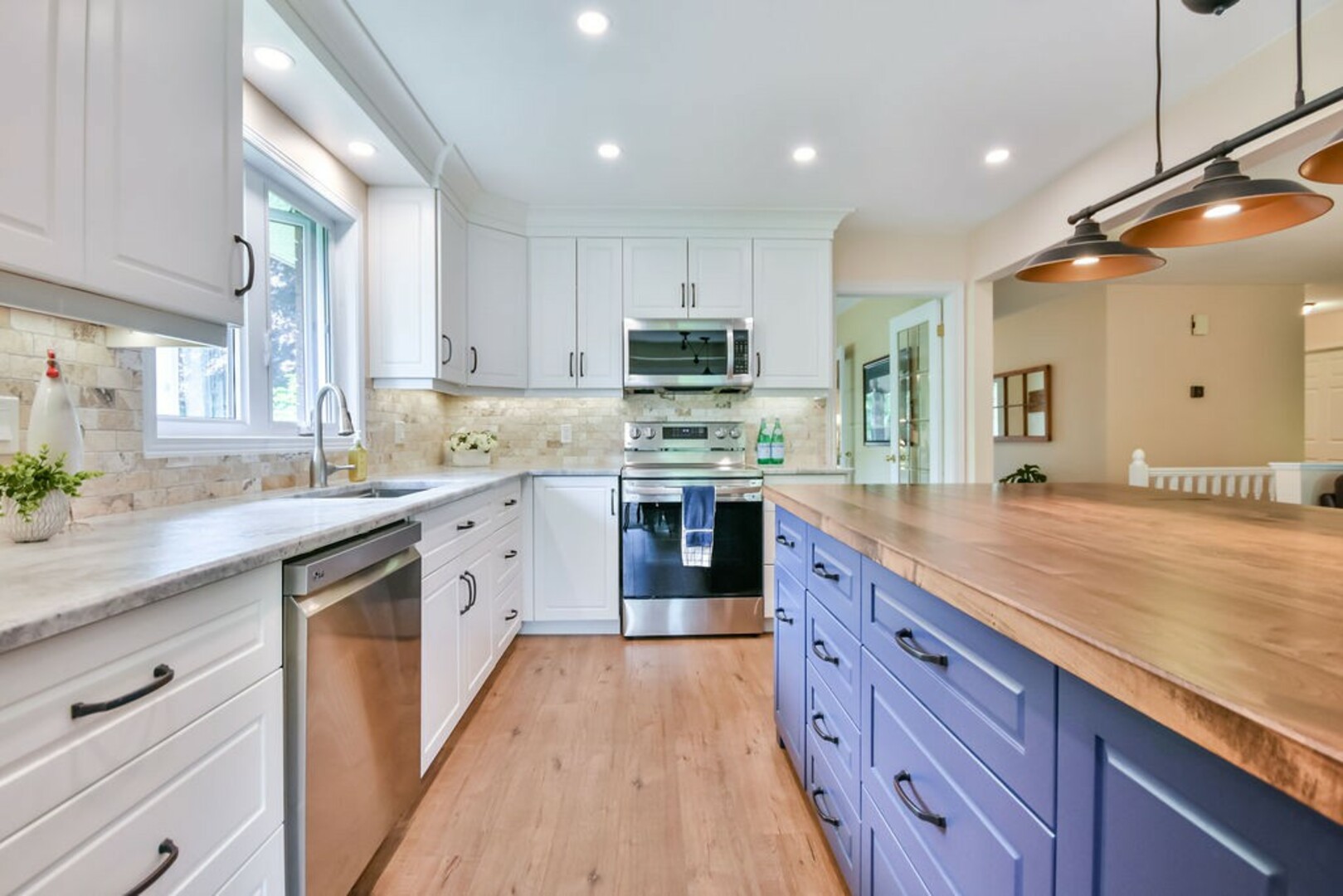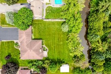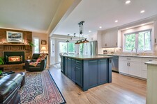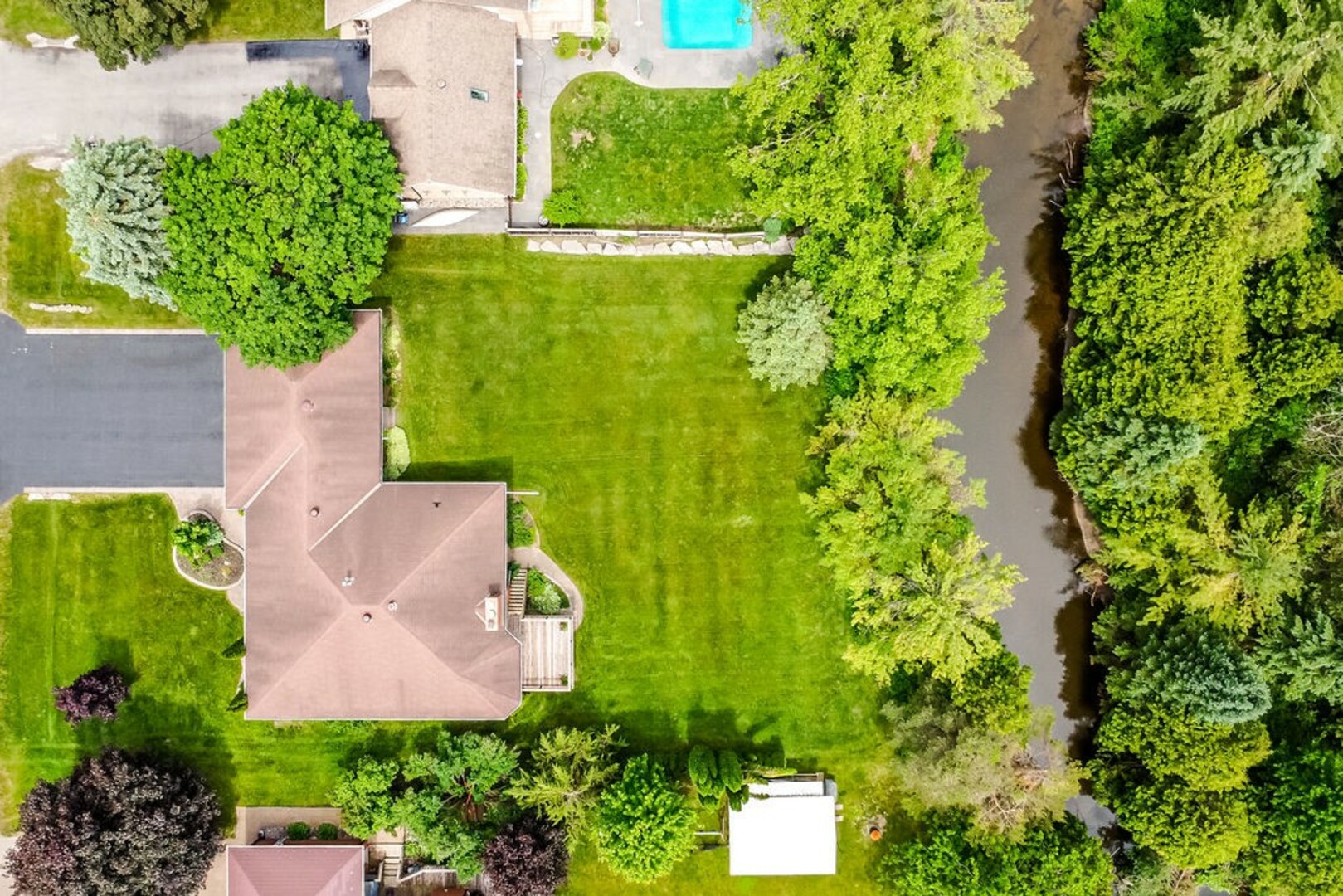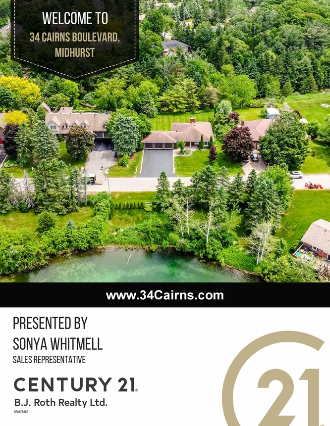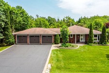 Welcome to coveted Midhurst and this sprawling ranch bungalow with triple garage, set on a premium lot backing onto mature forest & Willow Creek that meanders throughout the village of Midhurst. Over 3300 sq ft of living space on 2 floors, front foyer leads to a large, separate living & dining room, bright great room & eat in kitchen with sliding doors to the large deck with stairs that overlook the private lush backyard. Custom cabinetry in the updated kitchen, complete with Quartz counters, undercounter lighting, stone backsplash, double sink, easy close doors, multitude of pull outs & focal 4 x 8' island made out of wormy maple hardwood, with more great features on both sides. Surprise within the island is a 47' TV, accessed via a remote that lifts the tv from within! Family room with focal, energy efficient Regency woodburning fireplace. Primary bedroom with ensuite, plus 2 other bedrooms, main floor laundry room & Updated main bathroom.