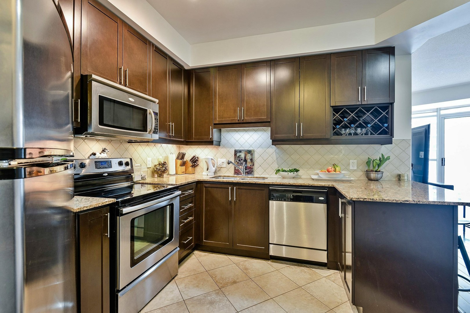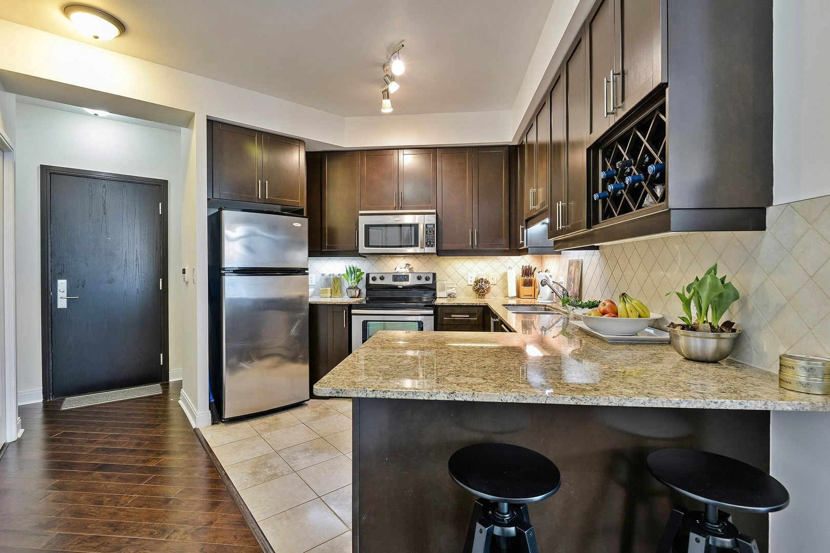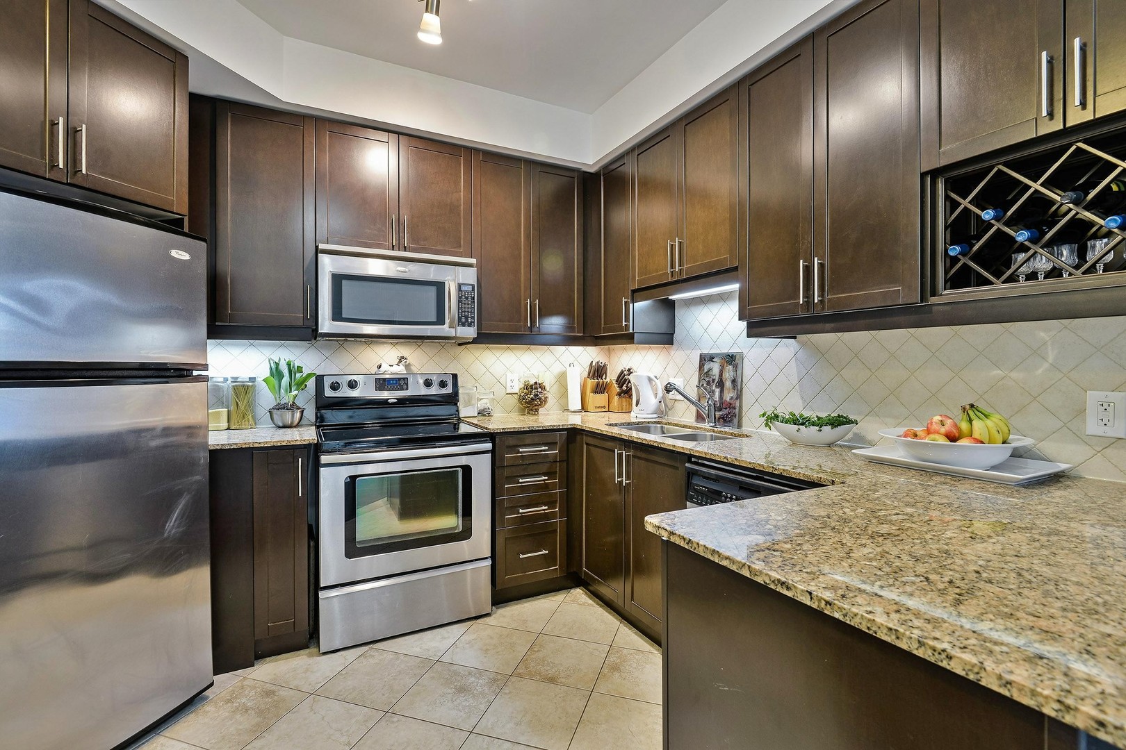 The Kitchen is complete with everything you could want. It boasts tall kitchen cabinets with ample storage as well as a wine lattice. All Stainless Steel appliances including a microwave range, granite counters, double sink, stone backsplash and breakfast bar for quick eats or company while cooking.