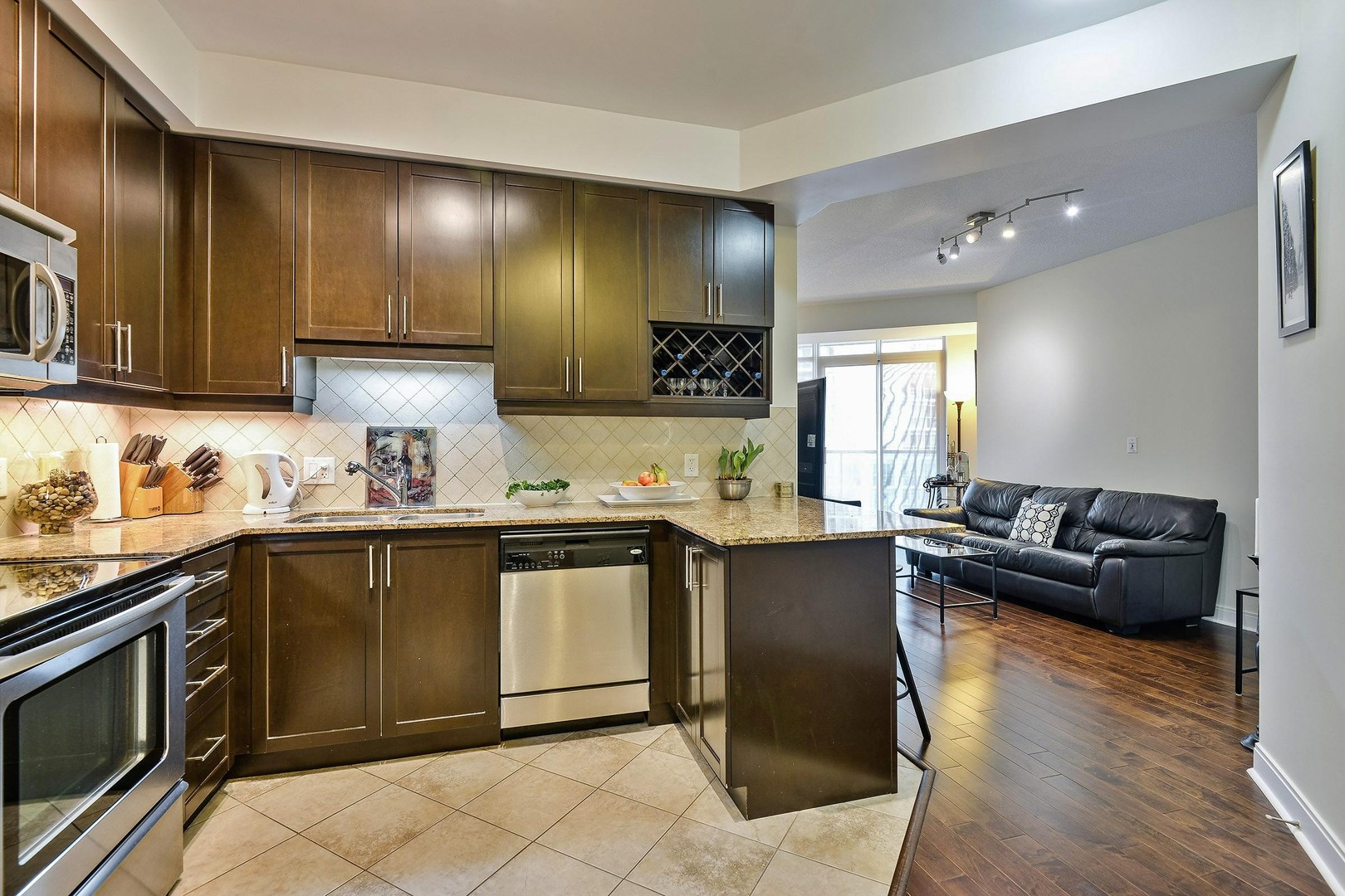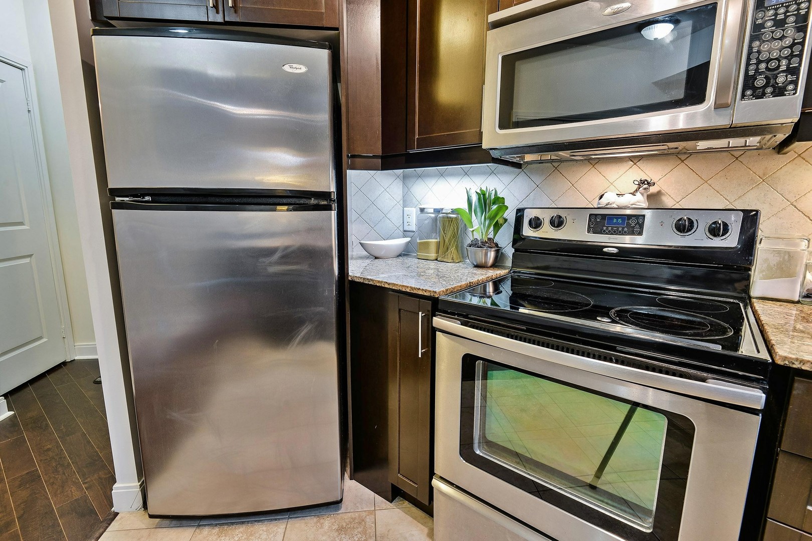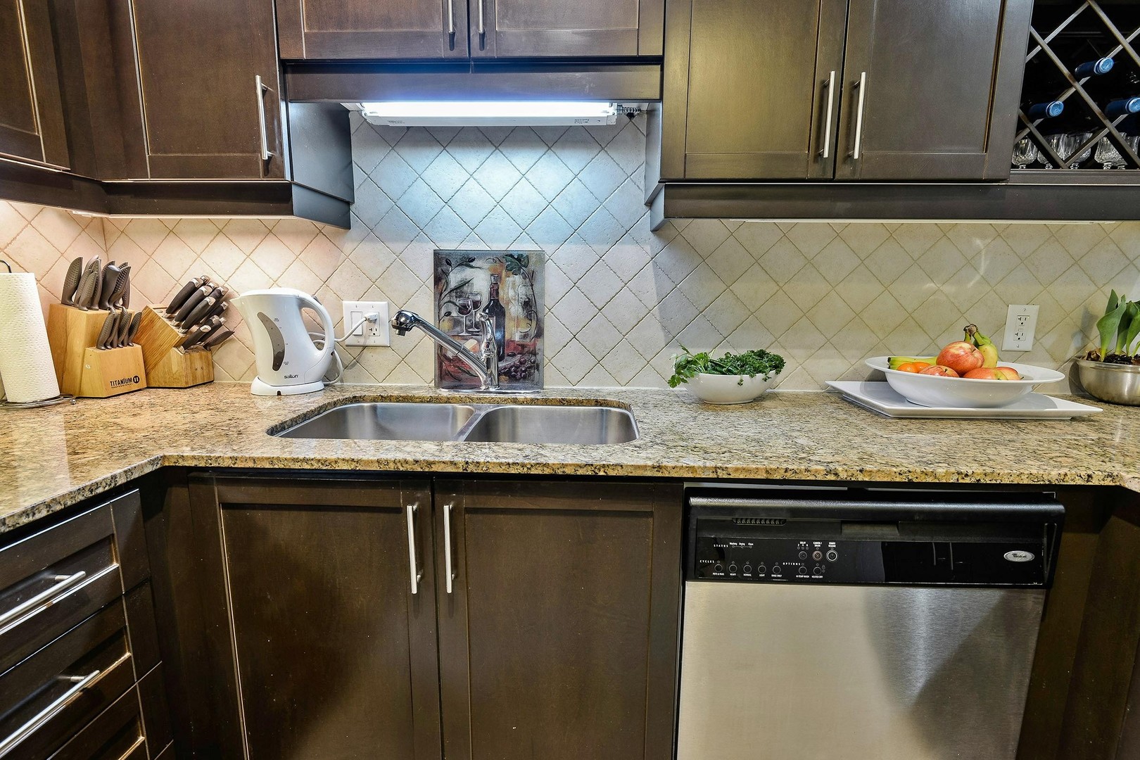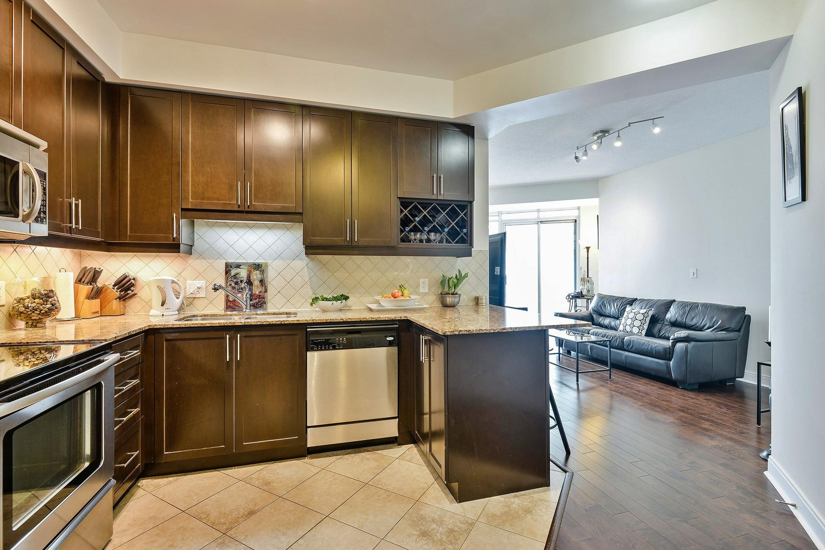 The Kitchen is complete with everything you could want. It boasts tall kitchen cabinets with ample storage as well as a wine lattice. All Stainless Steel appliances including a microwave range, granite counters, double sink, stone backsplash and breakfast bar for quick eats or company while cooking.