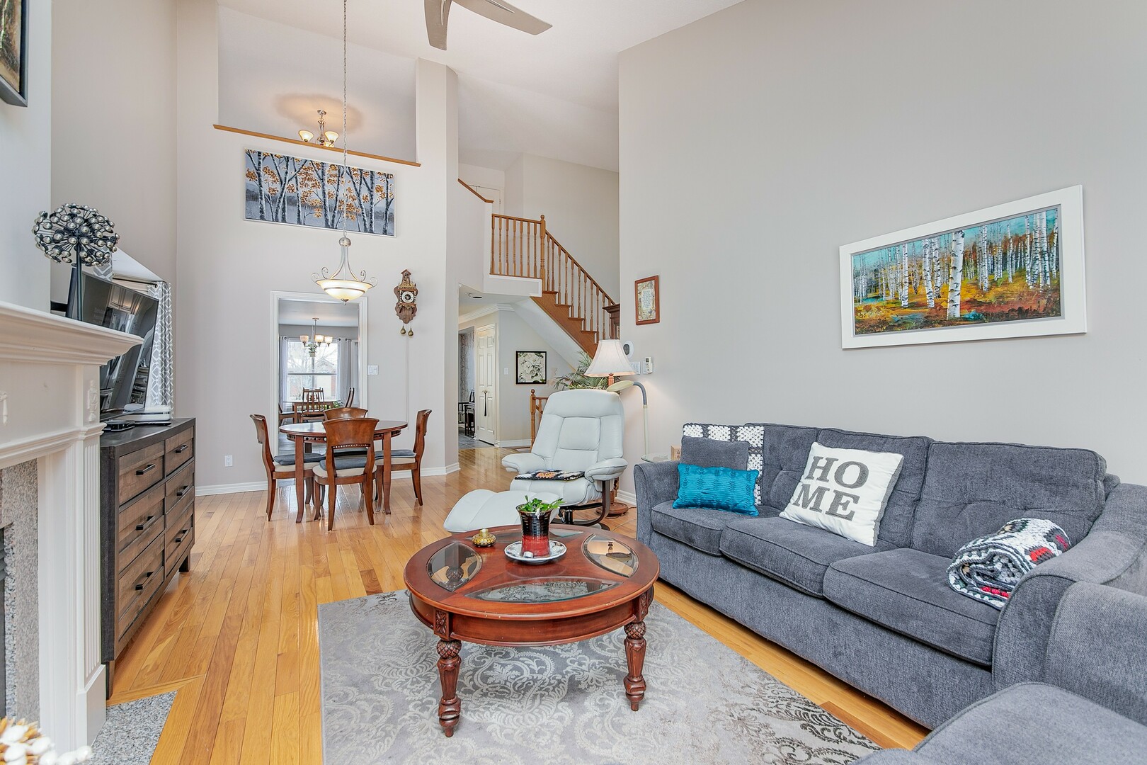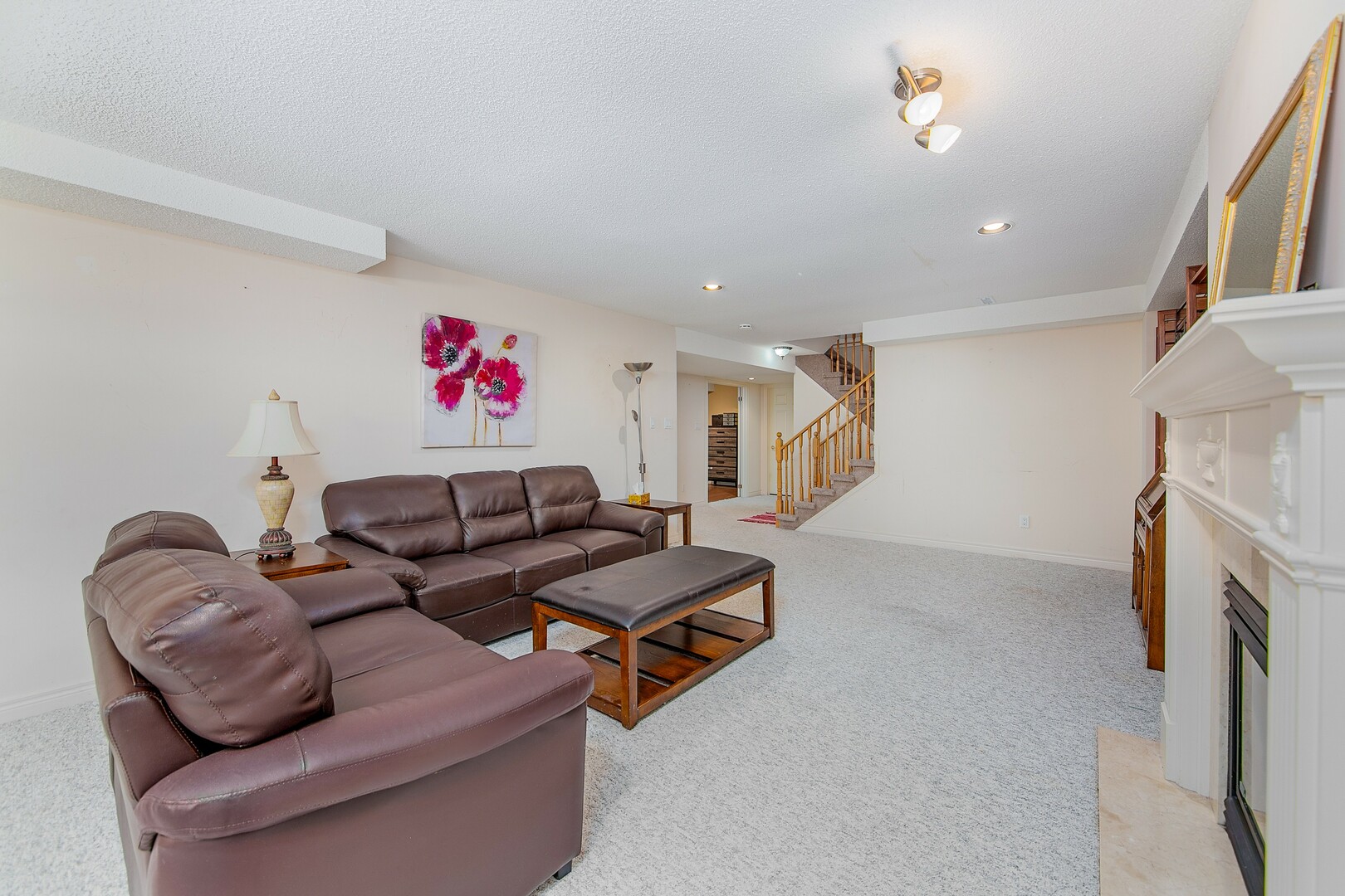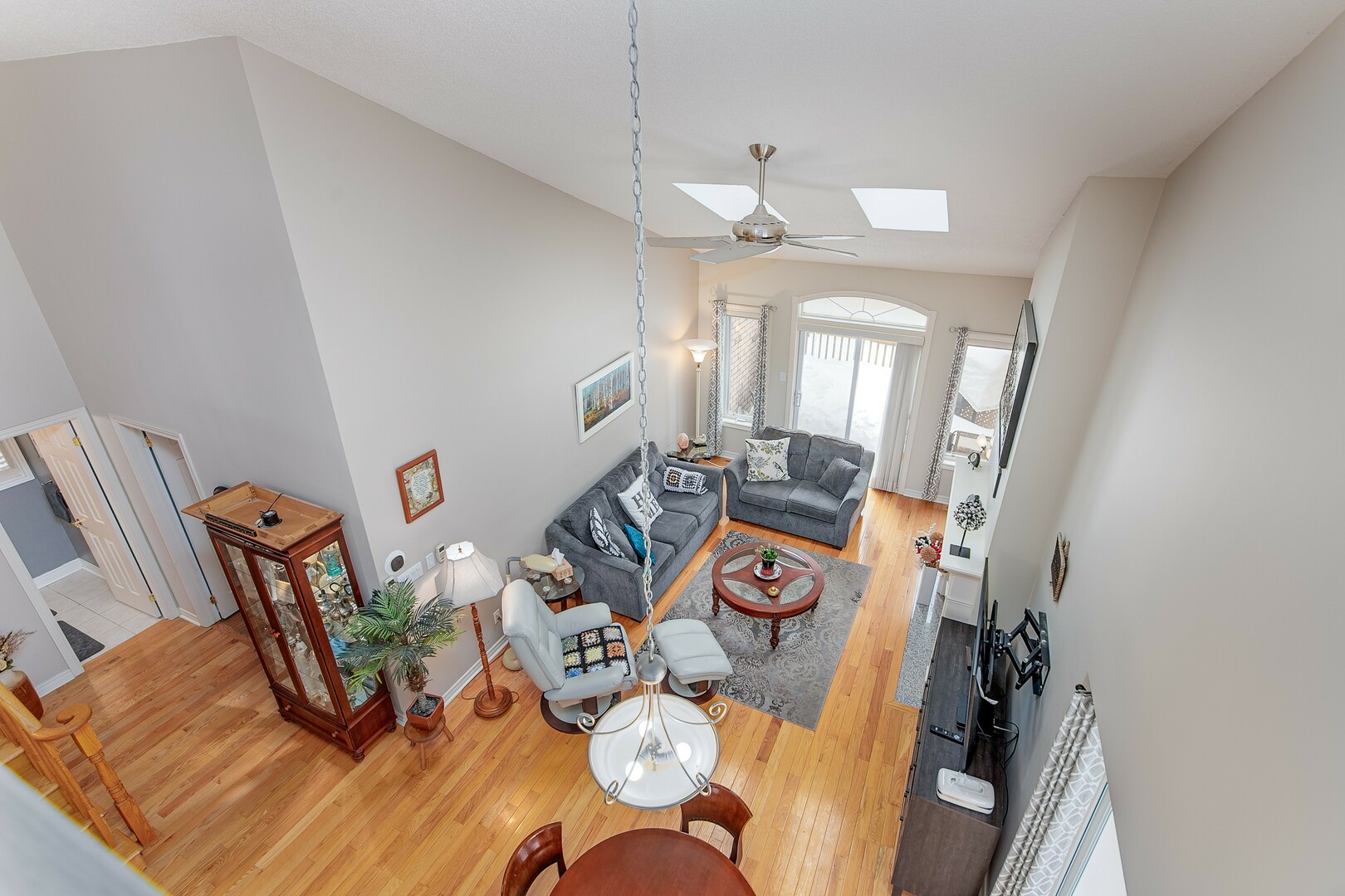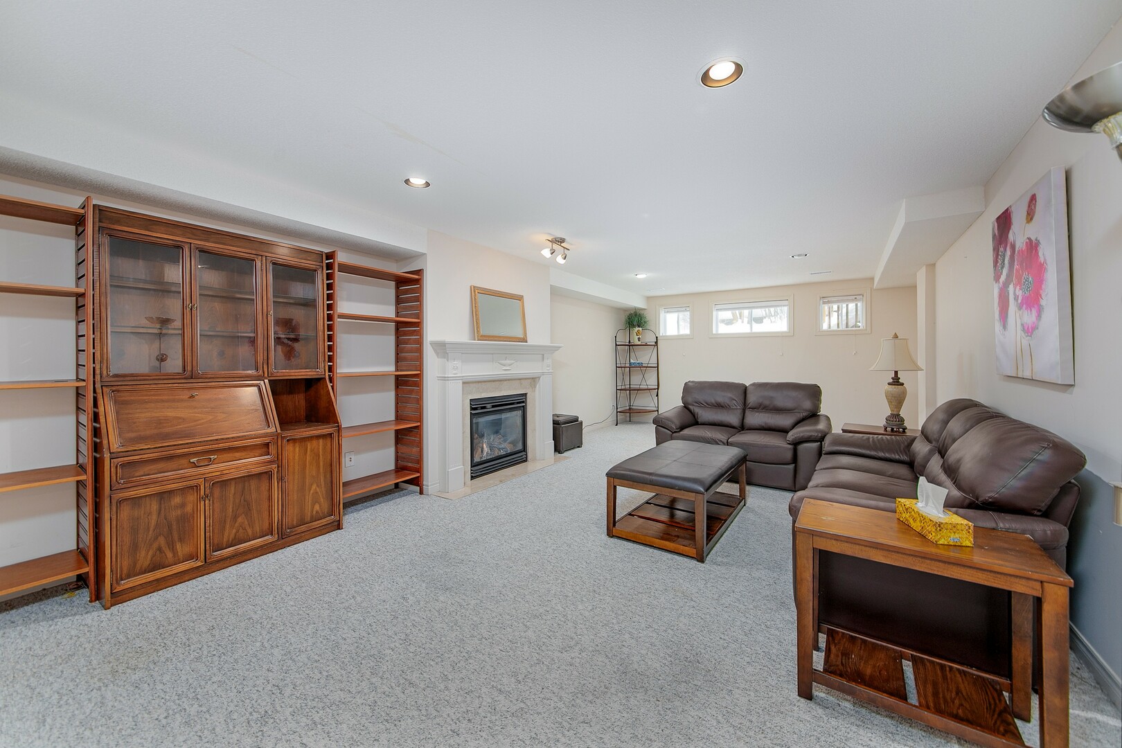 All brick, open concept 3-bedroom Bungaloft with finished basement situated in one of Ontario's premier Golf and Retirement Lifestyle Community, Briar Hill. The Primary Bedroom with a 4 pc., ensuite and walk-in closet is on the main level and boasts a large window for plenty of natural light. The kitchen has a breakfast area at one end and is open to the dining room, which is in turn, open to the Living Room. The Living Room, with cathedral ceilings and sky lights, has a natural gas brick mantel fireplace. There is access to the rear deck, with protected privacy fence by a sliding patio door. The Laundry room is between levels and has cupboards and a laundry sink. The stairs to the Loft have an open mid level landing suitable for a couple of easy-chairs and table or an ideal spot for a computer desk. The loft which has hardwood flooring, closet and an open view of the main level has potential as a 3rd bedroom with a 3pc ensuite bathroom or office/study. The carpeted fully finished lower level adds living space to the home. There is a family room with large above grade windows, natural gas brick mantel fireplace and built in bookshelves. The large bedroom has above grade windows and a large closet. Also, there is 3 piece full bathroom, an office/bonus room with French doors, a utility room with plenty of storage, a cold room and an under the stair case storage room. The driveway and front step are paver stone constructed.
