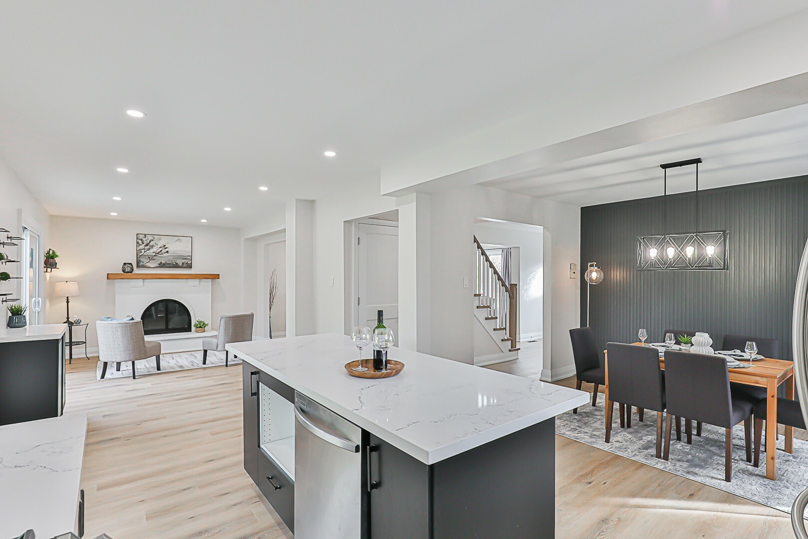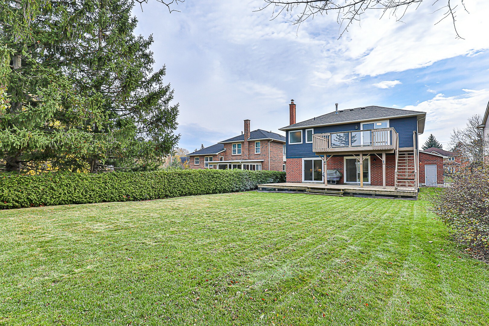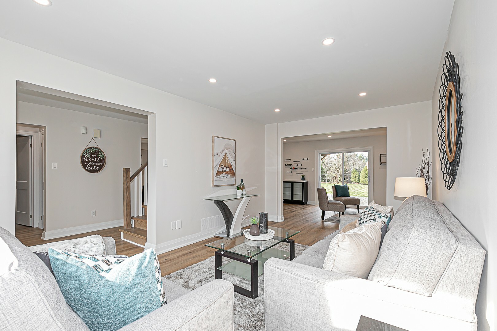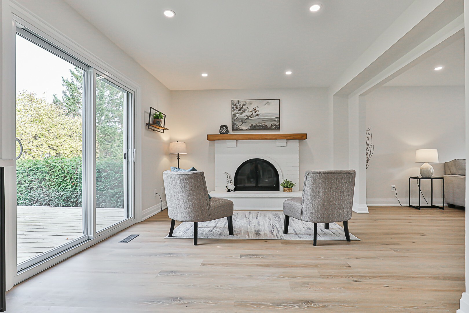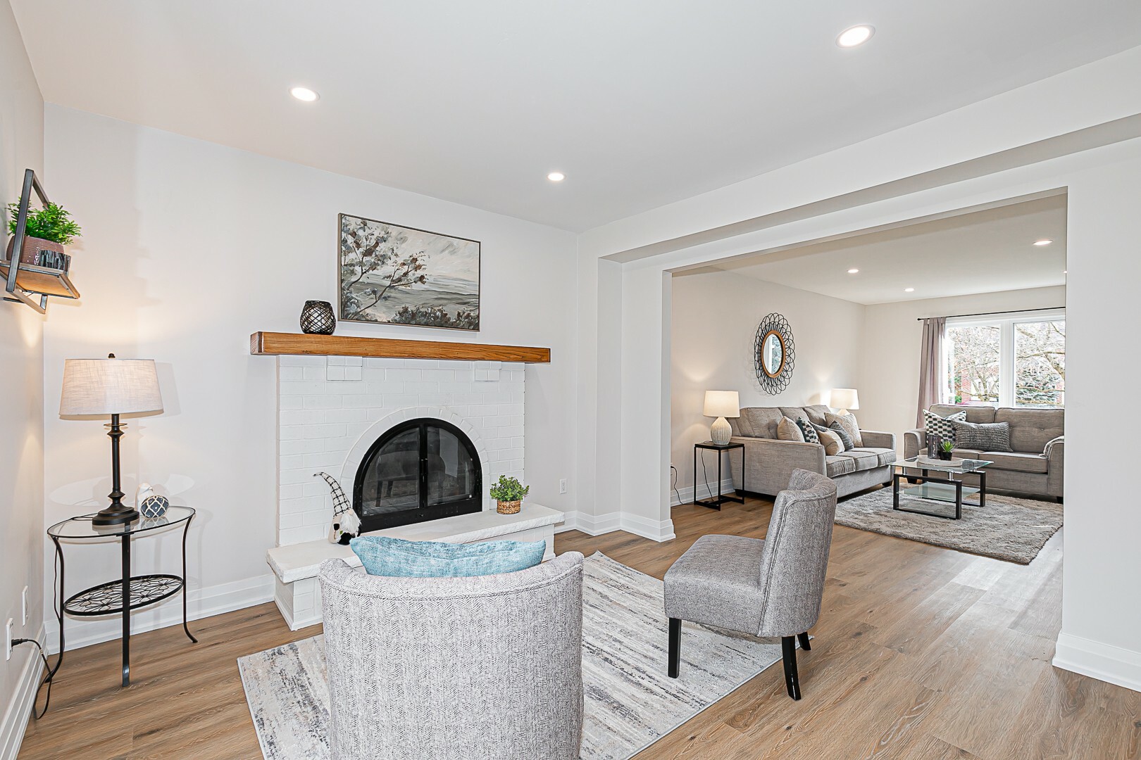 This 4 bedroom family home has been extensively renovated. A pattern concrete walkway leads to the front door. Great open concept layout. The formal Living & Dining Rms are perfect for entertaining. The Family Rm features a fireplace & a walk out to the back deck. The spacious kitchen boasts quartz countertops, custom backsplash, stainless steel appliances, & plenty of cabinets & counter space including an island with a breakfast bar. Primary bedroom has a walk in closet & a luxurious ensuite with a free standing tub & a glass shower. There is another spacious bedroom with a roomy closet & a walk out to the upper deck overlooking the backyard, as well as two additional bedrooms -Plenty of room for a growing family. The finished basement has a fifth bedroom, a 3pc bathroom with a glass shower, an open concept area that could be used as an office or playroom and a generous rec room. The private backyard has a 2 tiered deck & backs onto greenspace with a pond and walking trails.
