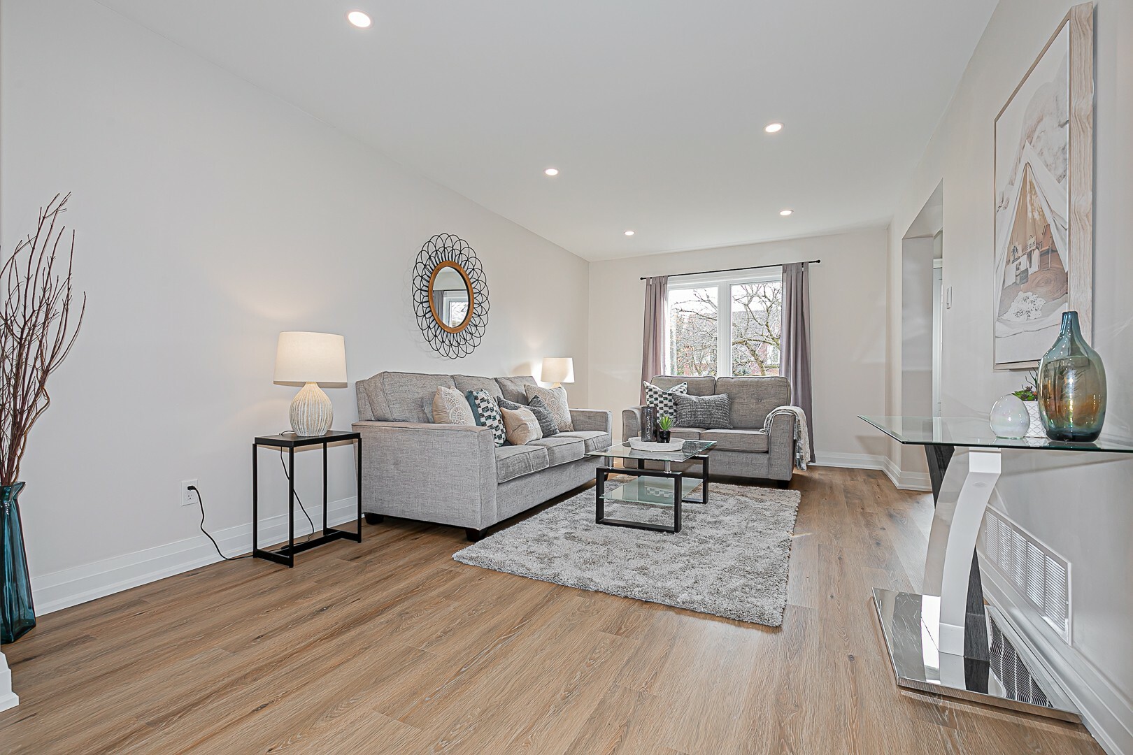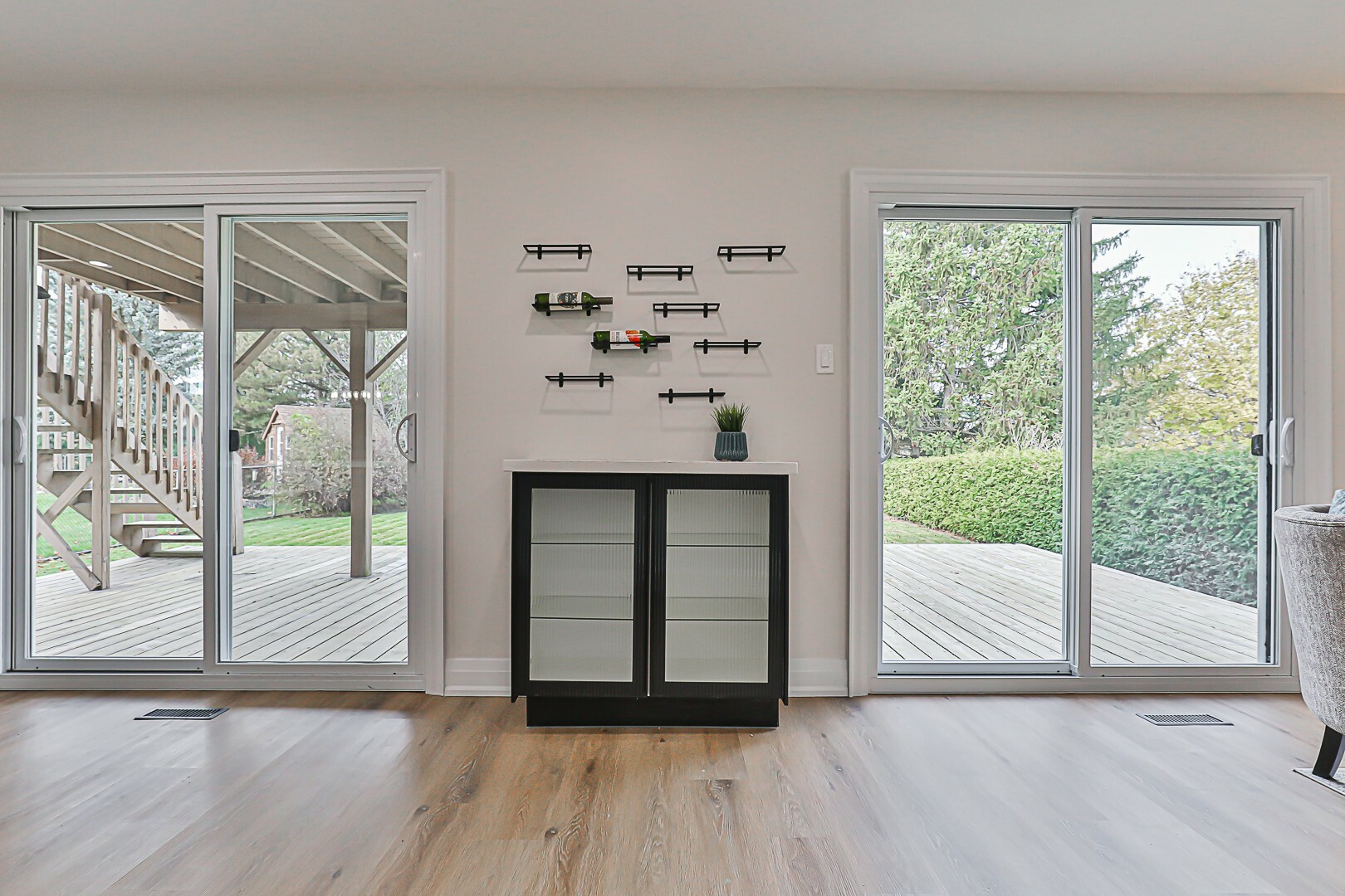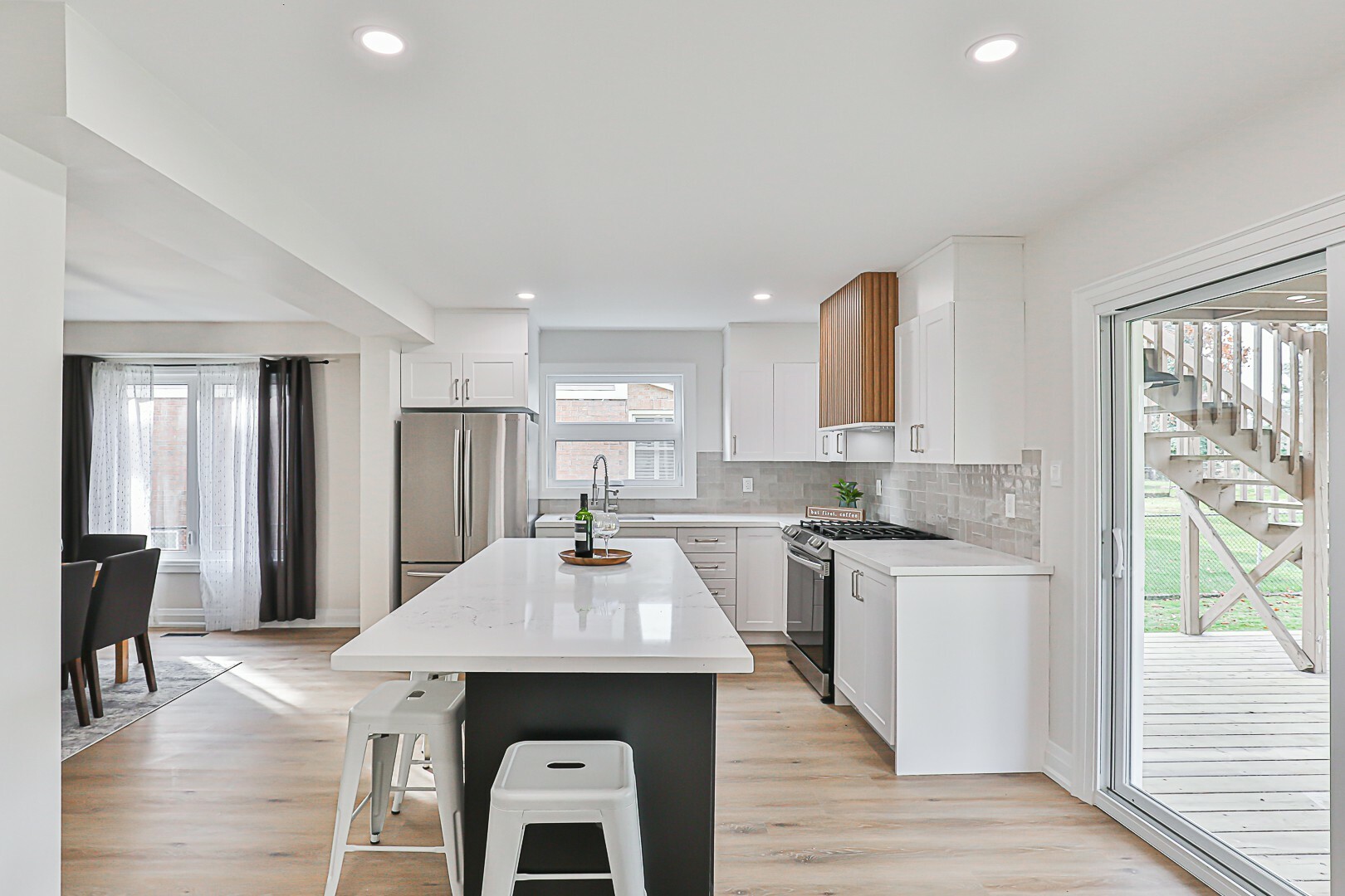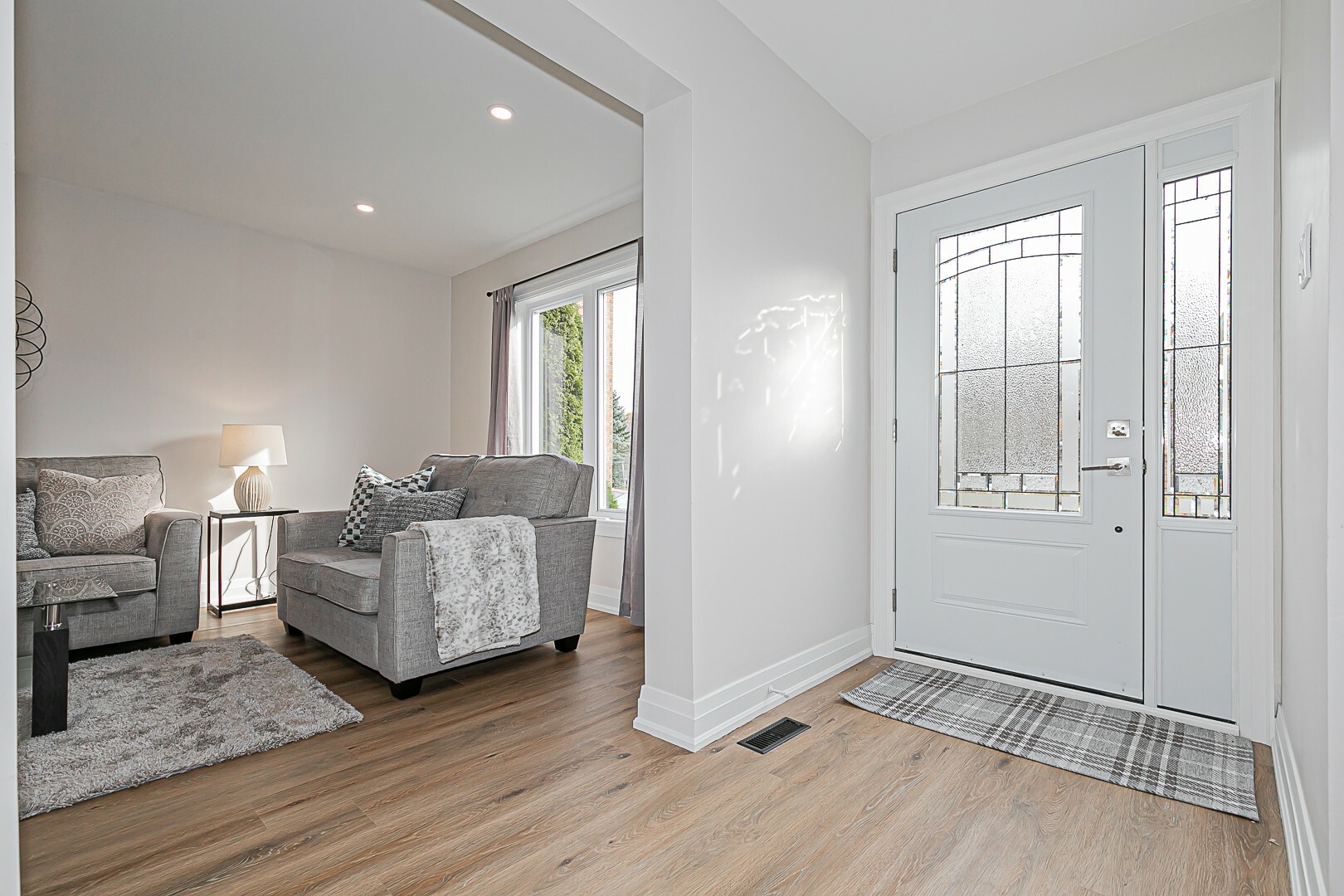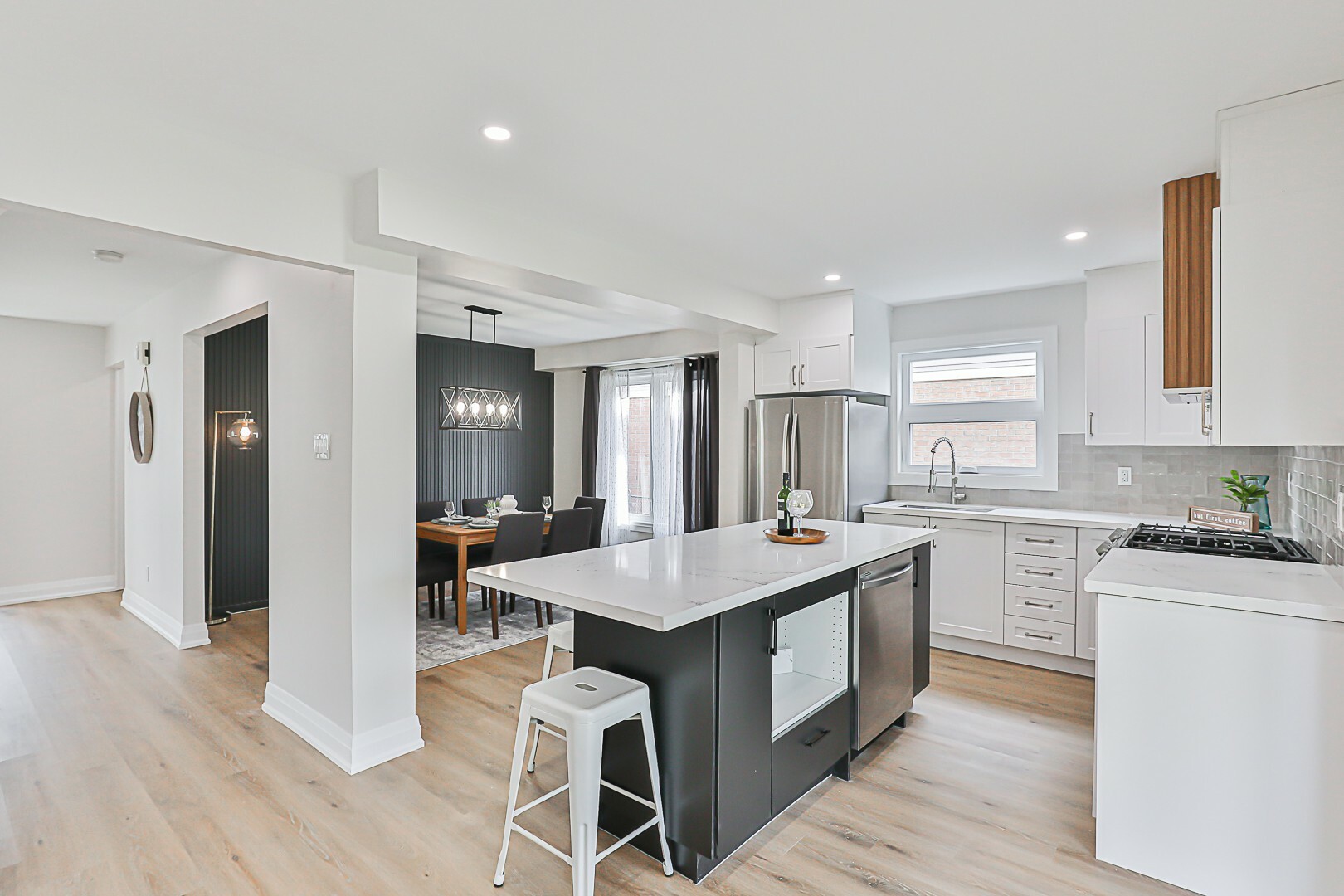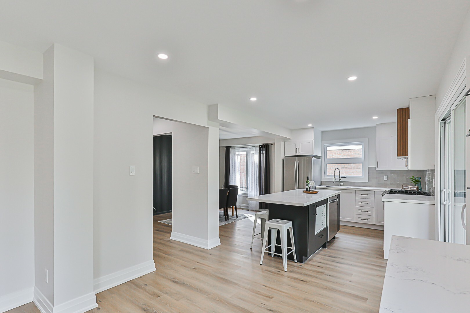 This 4 bedroom family home has been extensively renovated. A pattern concrete walkway leads to the front door. Great open concept layout. The formal Living & Dining Rms are perfect for entertaining. The Family Rm features a fireplace & a walk out to the back deck. The spacious kitchen boasts quartz countertops, custom backsplash, stainless steel appliances, & plenty of cabinets & counter space including an island with a breakfast bar. Primary bedroom has a walk in closet & a luxurious ensuite with a free standing tub & a glass shower. There is another spacious bedroom with a roomy closet & a walk out to the upper deck overlooking the backyard, as well as two additional bedrooms -Plenty of room for a growing family. The finished basement has a fifth bedroom, a 3pc bathroom with a glass shower, an open concept area that could be used as an office or playroom and a generous rec room. The private backyard has a 2 tiered deck & backs onto greenspace with a pond and walking trails.