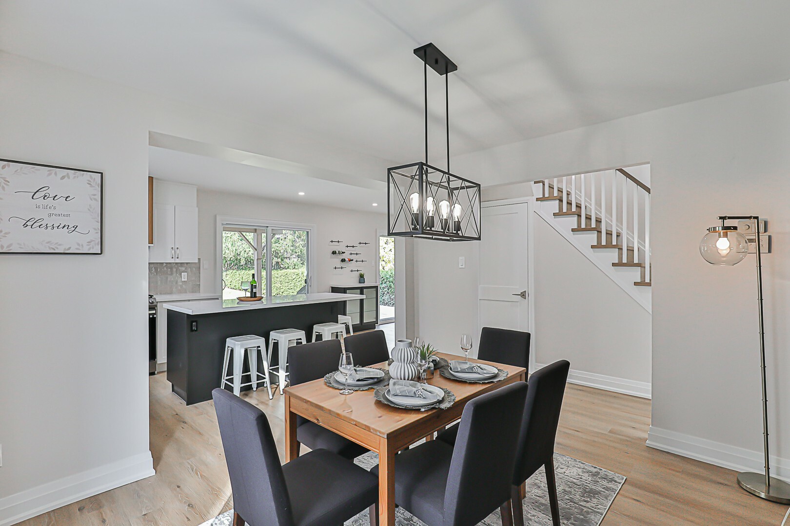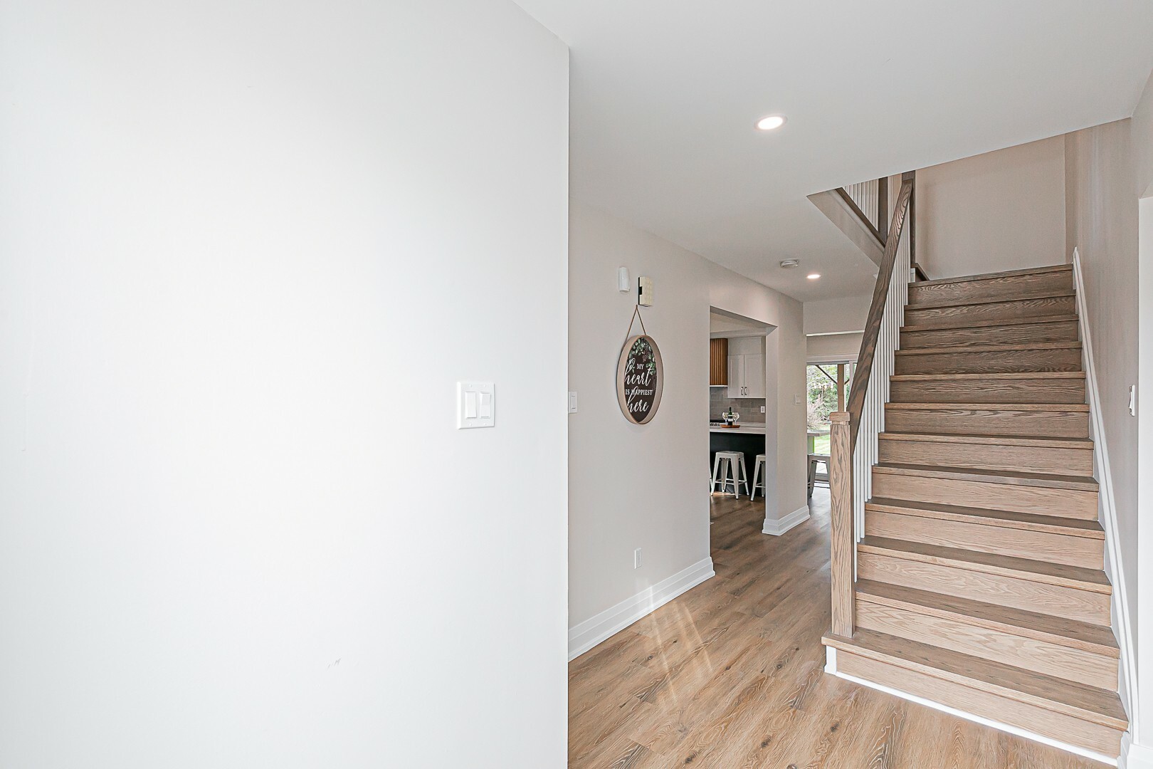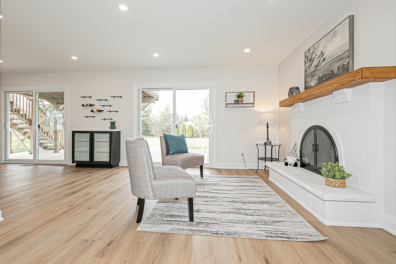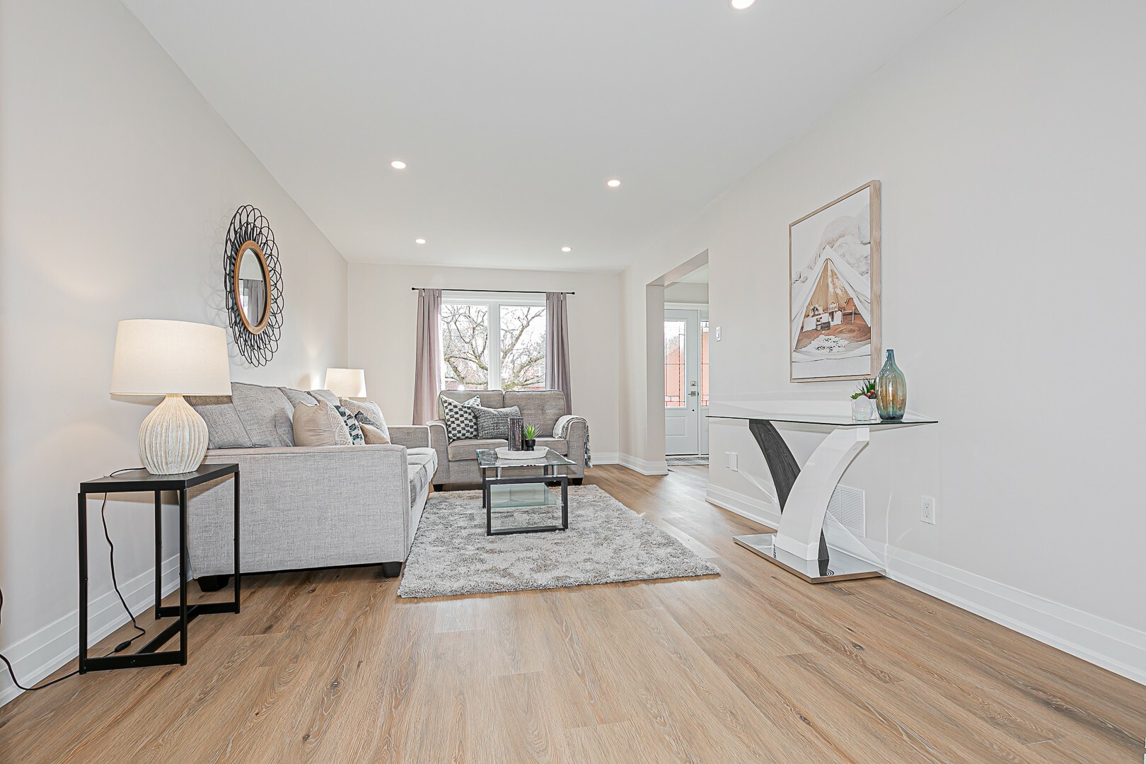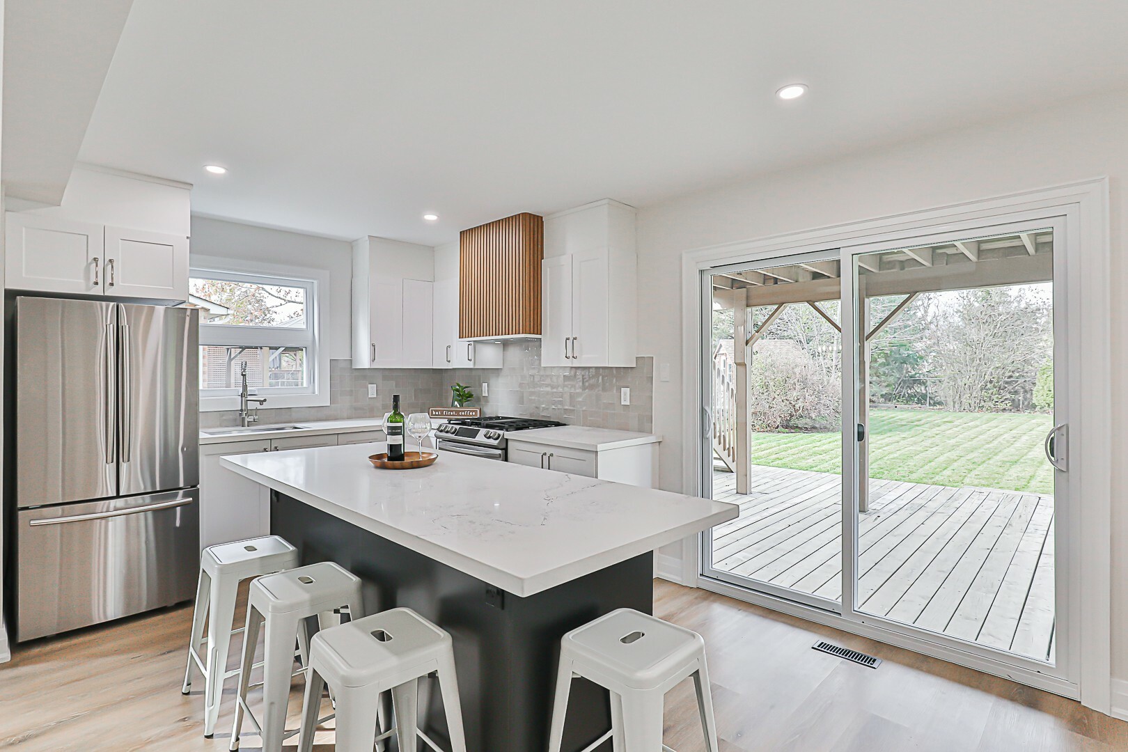 This 4 bedroom family home has been extensively renovated. A pattern concrete walkway leads to the front door. Great open concept layout. The formal Living & Dining Rms are perfect for entertaining. The Family Rm features a fireplace & a walk out to the back deck. The spacious kitchen boasts quartz countertops, custom backsplash, stainless steel appliances, & plenty of cabinets & counter space including an island with a breakfast bar. Primary bedroom has a walk in closet & a luxurious ensuite with a free standing tub & a glass shower. There is another spacious bedroom with a roomy closet & a walk out to the upper deck overlooking the backyard, as well as two additional bedrooms -Plenty of room for a growing family. The finished basement has a fifth bedroom, a 3pc bathroom with a glass shower, an open concept area that could be used as an office or playroom and a generous rec room. The private backyard has a 2 tiered deck & backs onto greenspace with a pond and walking trails.