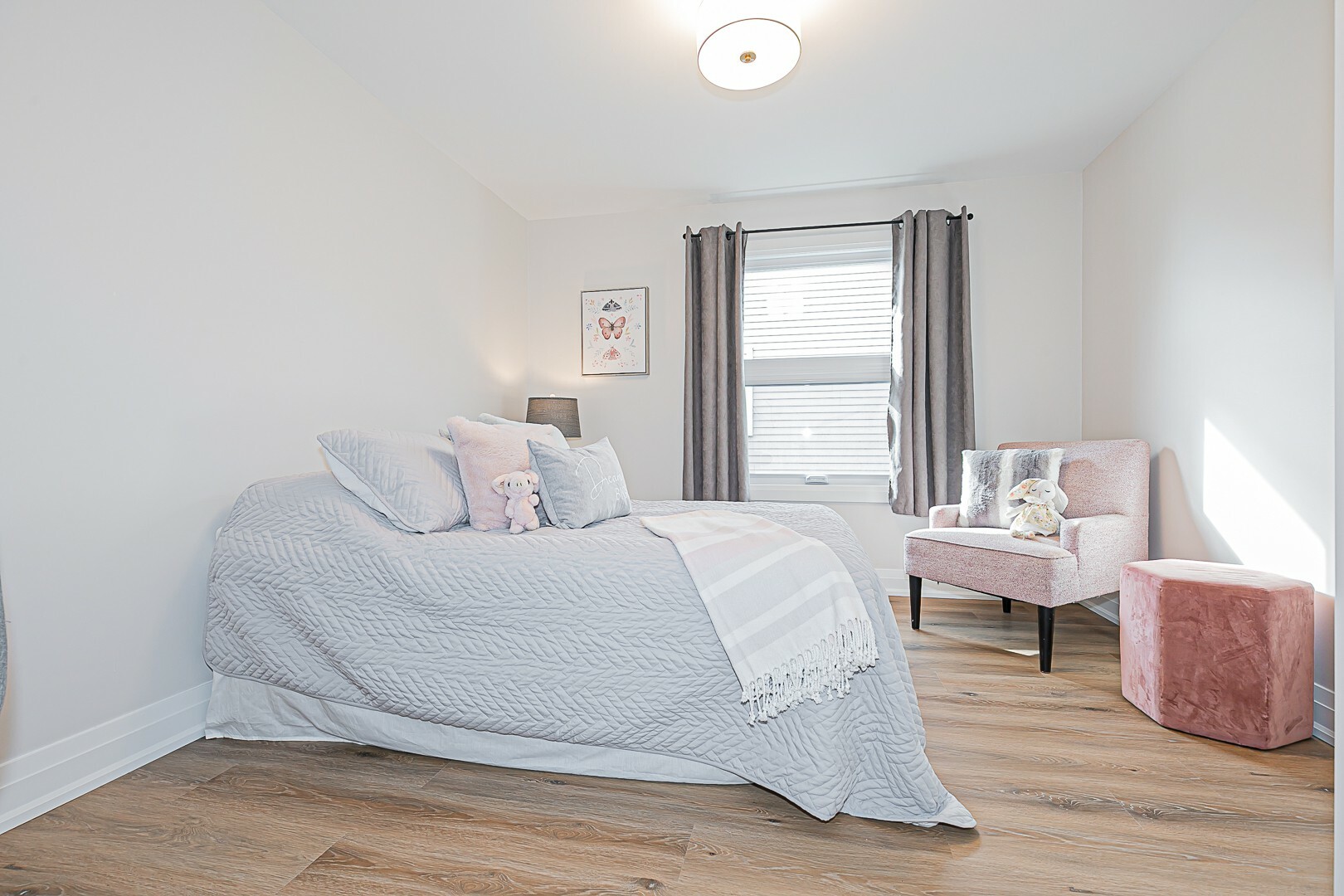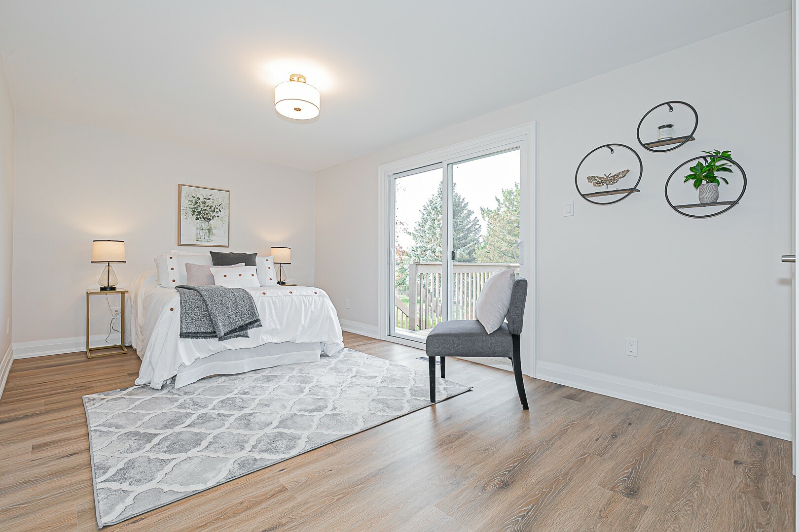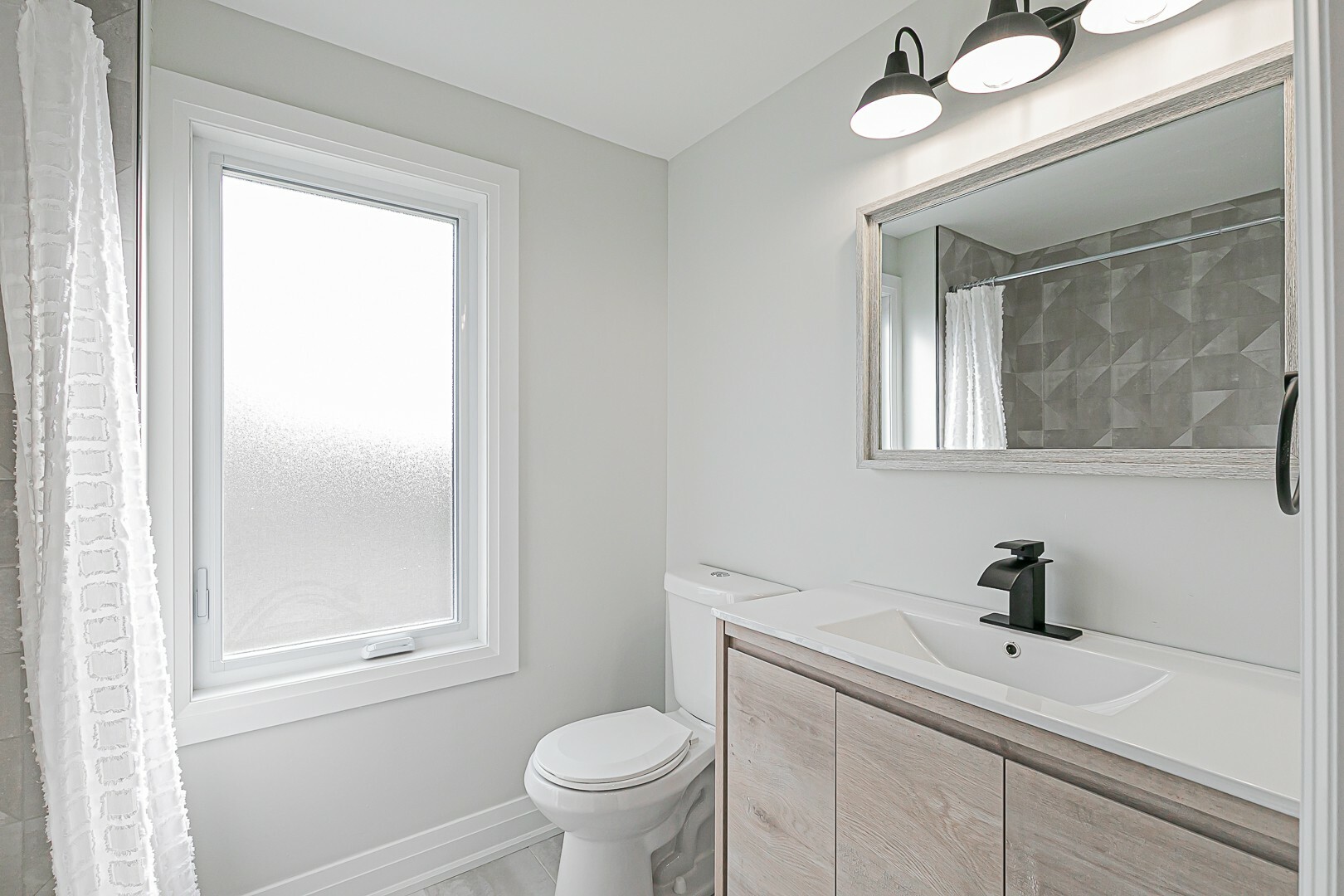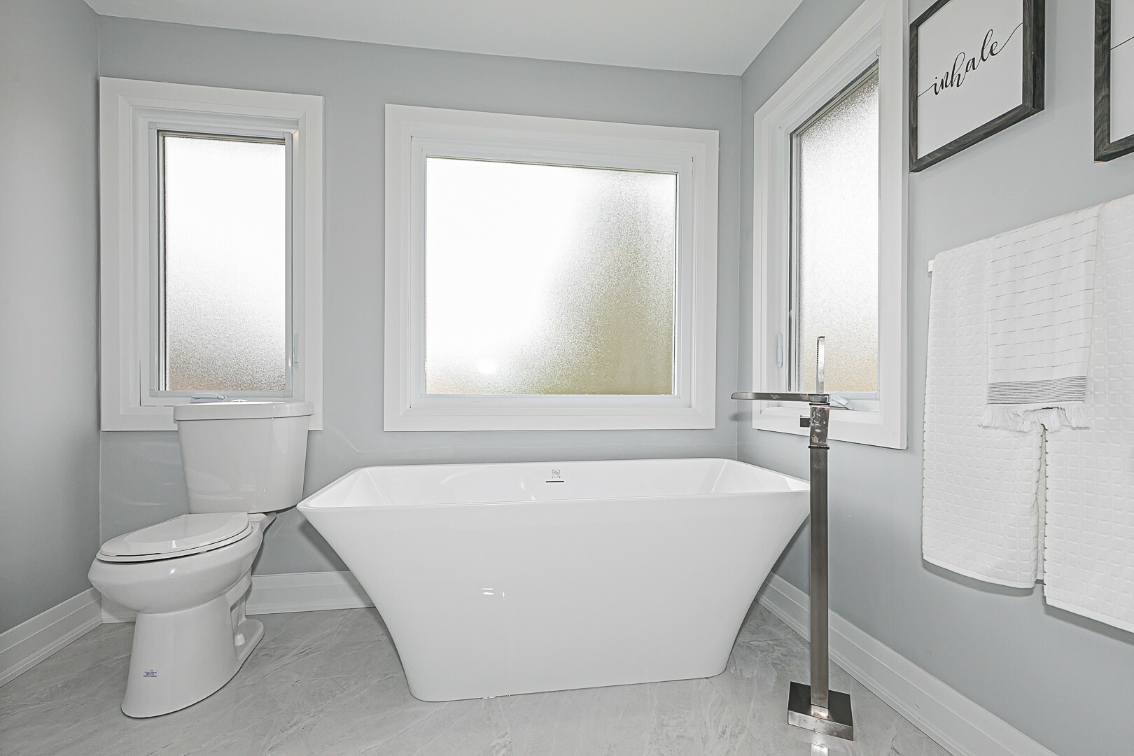 Ascend the staircase to the second floor. The primary bedroom has a walk-in closet and a luxurious ensuite with a double sink vanity, a free standing tub and a glass shower with a rain showerhead and handheld. There is another spacious bedroom with a roomy closet and a walk out to the upper deck overlooking the backyard, as well as two additional bedrooms – Plenty of room for a growing family. A four piece bathroom completes the upper level. Large windows adorn this lovely home.