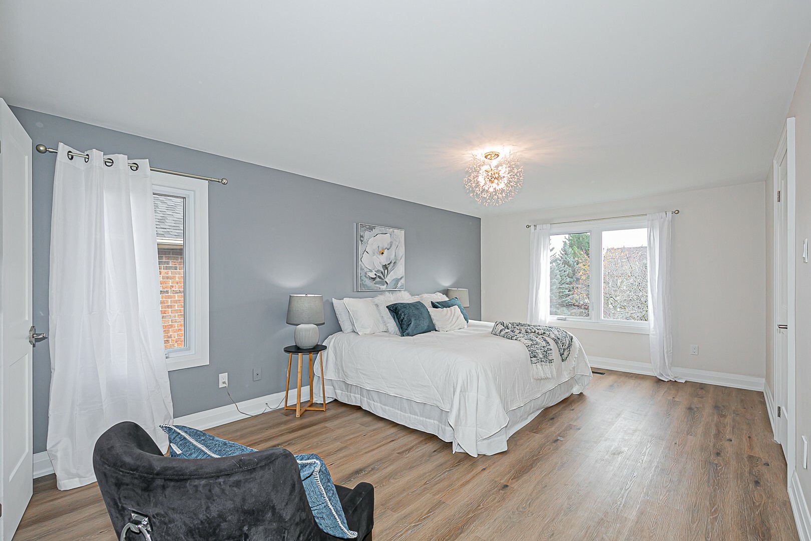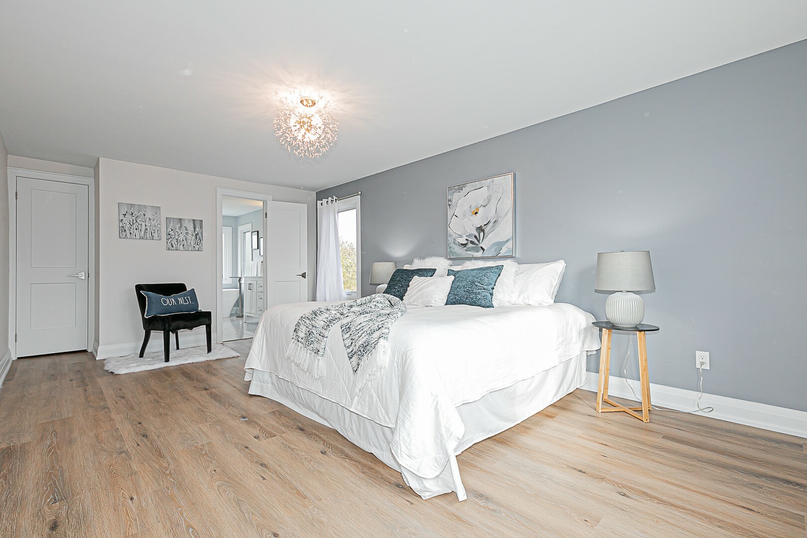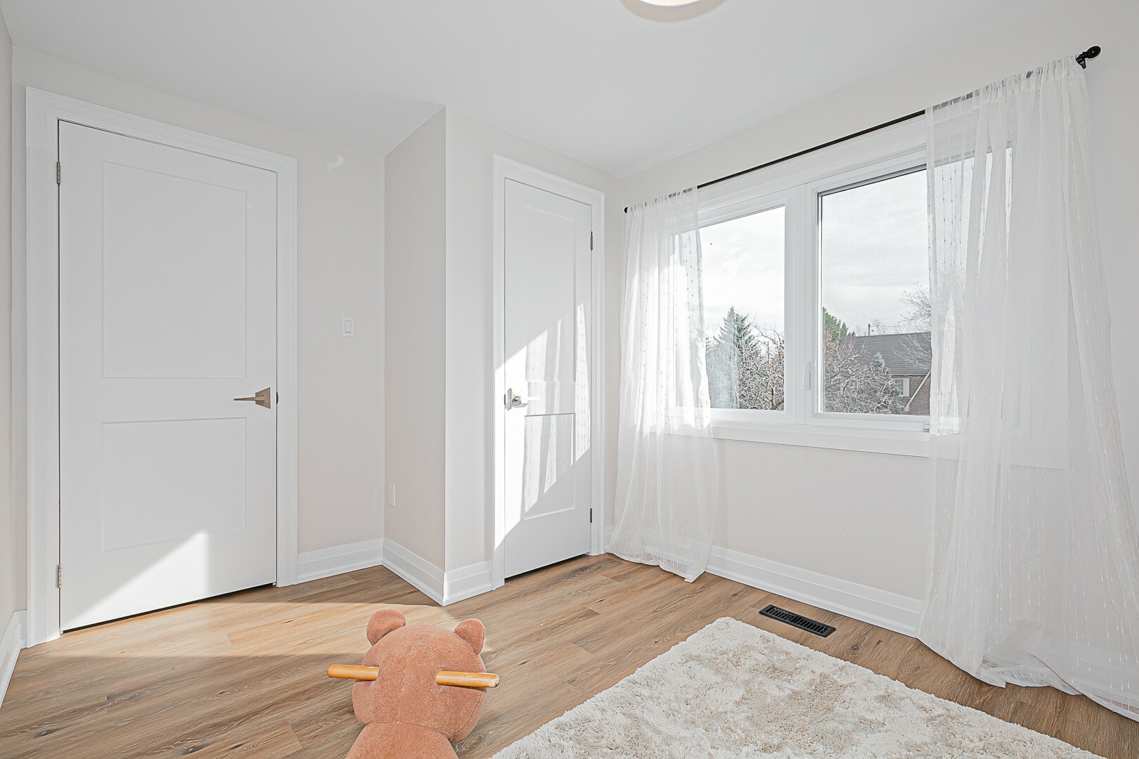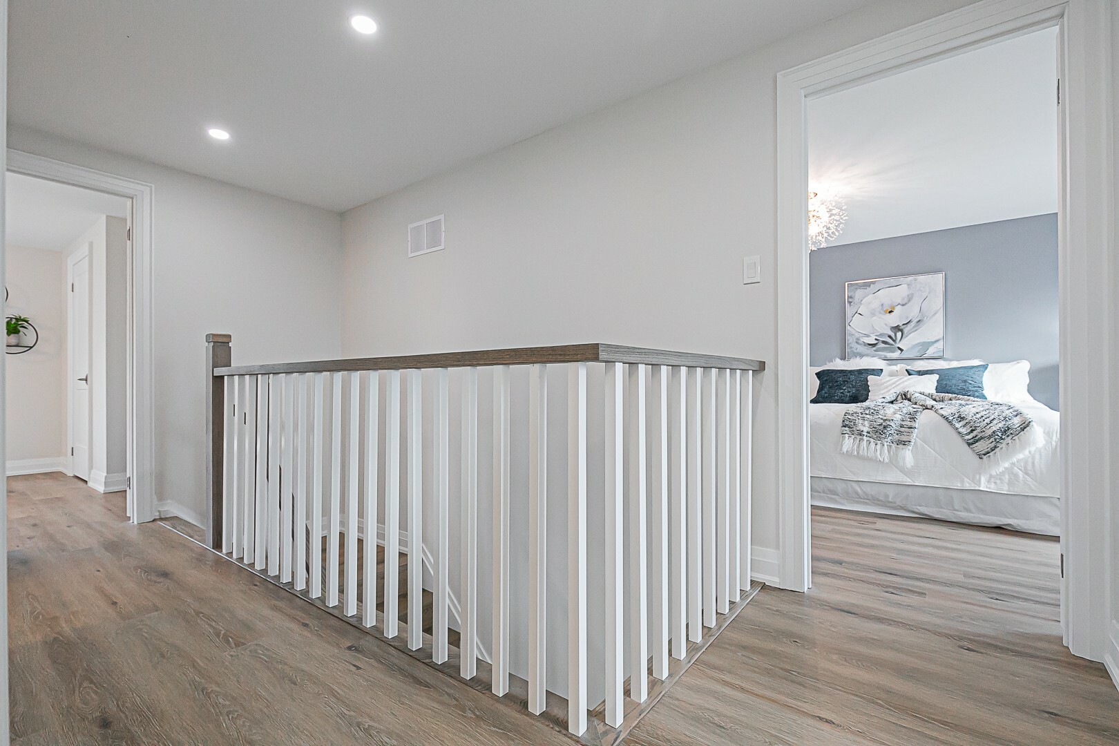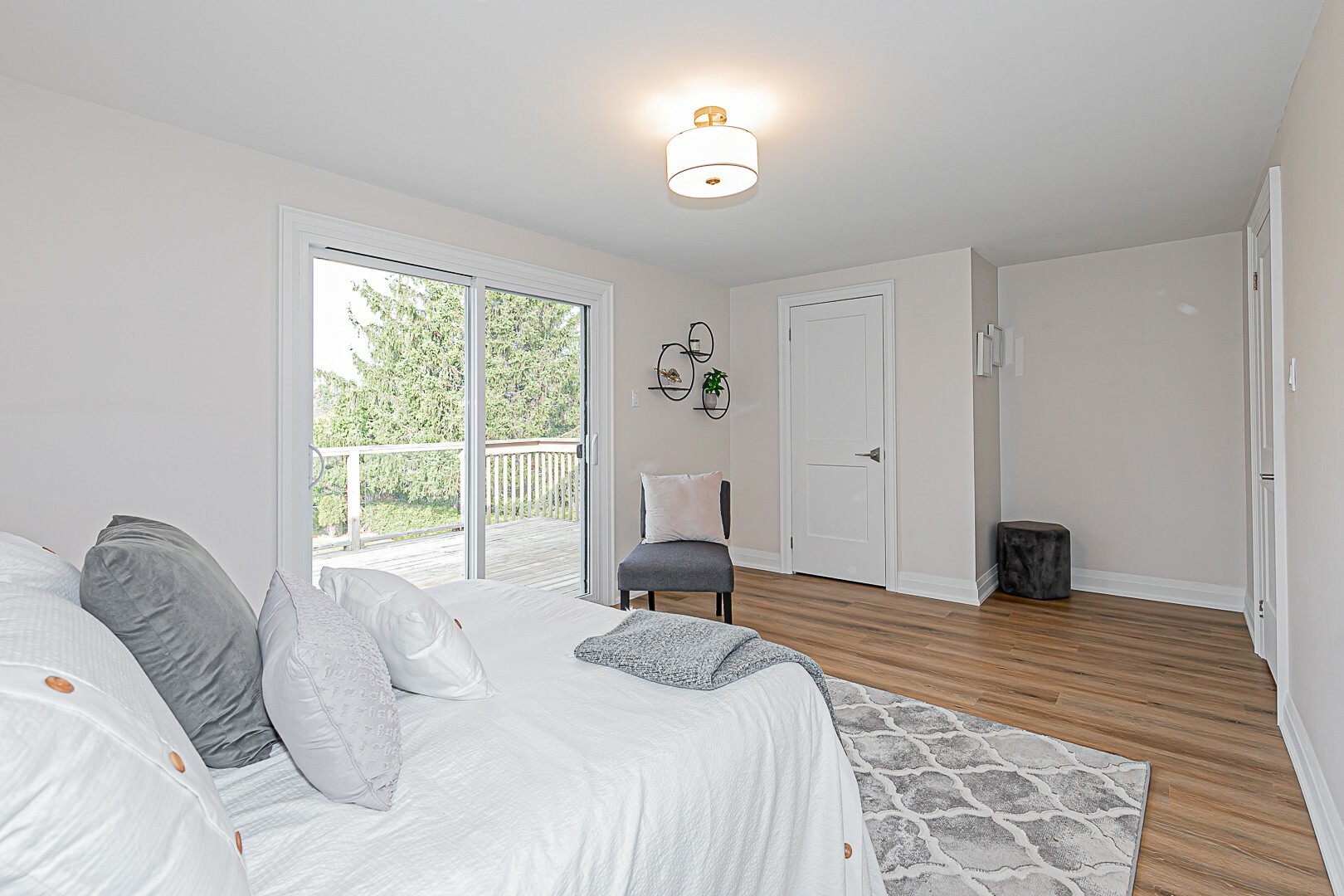 Ascend the staircase to the second floor. The primary bedroom has a walk-in closet and a luxurious ensuite with a double sink vanity, a free standing tub and a glass shower with a rain showerhead and handheld. There is another spacious bedroom with a roomy closet and a walk out to the upper deck overlooking the backyard, as well as two additional bedrooms – Plenty of room for a growing family. A four piece bathroom completes the upper level. Large windows adorn this lovely home.