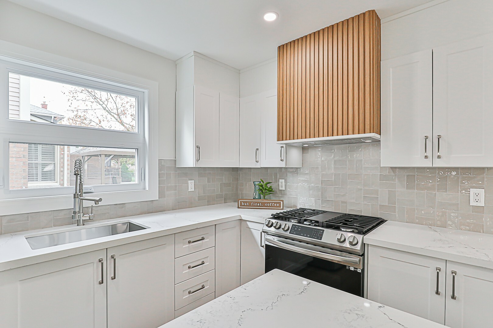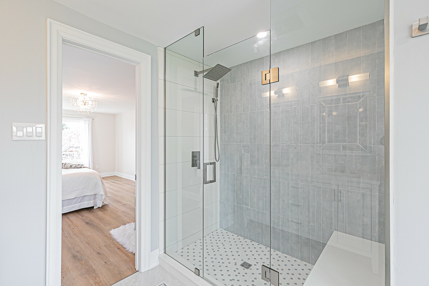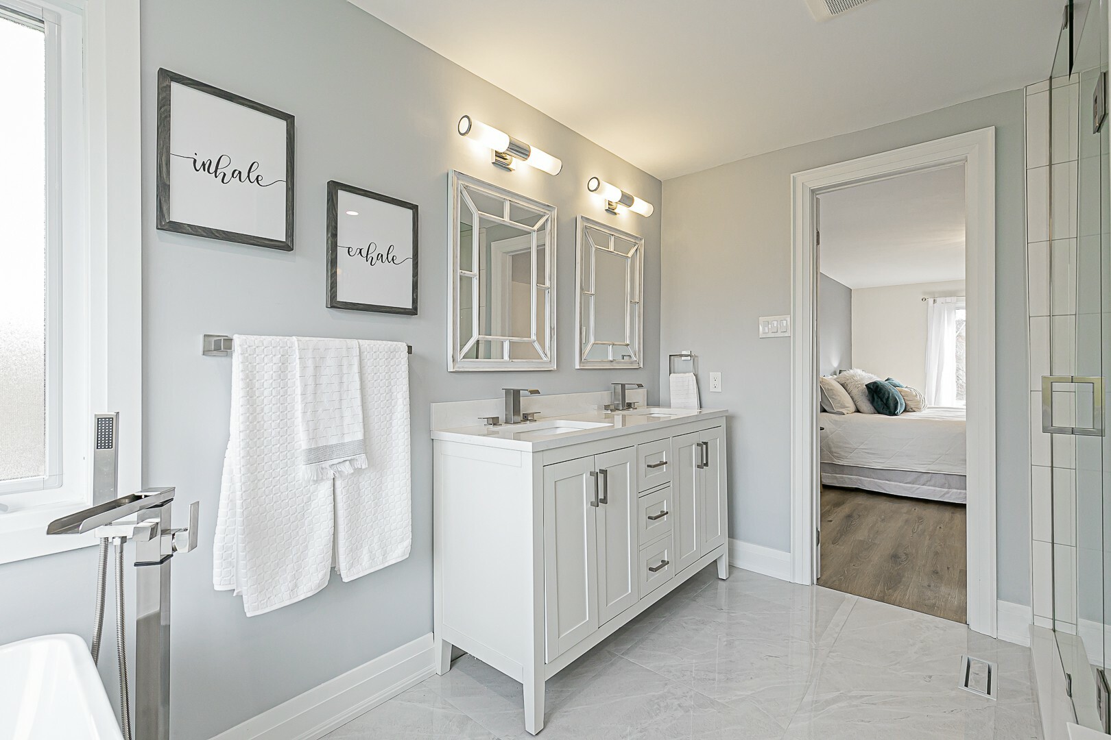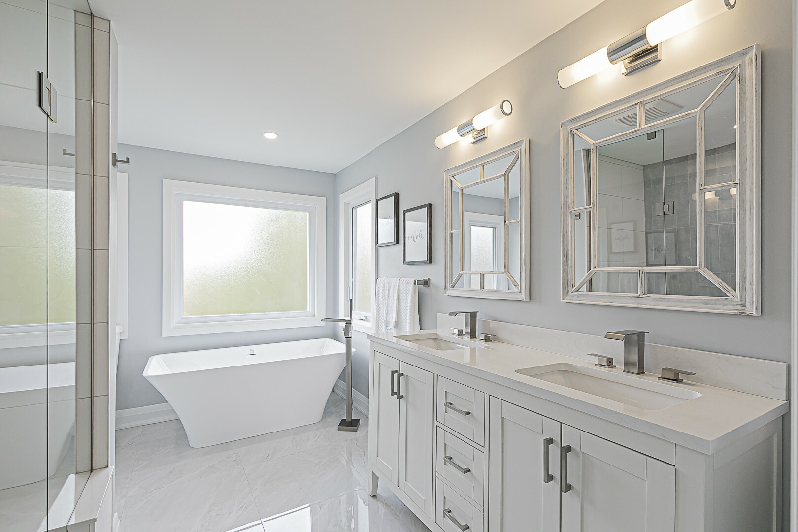 Ascend the staircase to the second floor. The primary bedroom has a walk-in closet and a luxurious ensuite with a double sink vanity, a free standing tub and a glass shower with a rain showerhead and handheld. There is another spacious bedroom with a roomy closet and a walk out to the upper deck overlooking the backyard, as well as two additional bedrooms – Plenty of room for a growing family. A four piece bathroom completes the upper level. Large windows adorn this lovely home.
