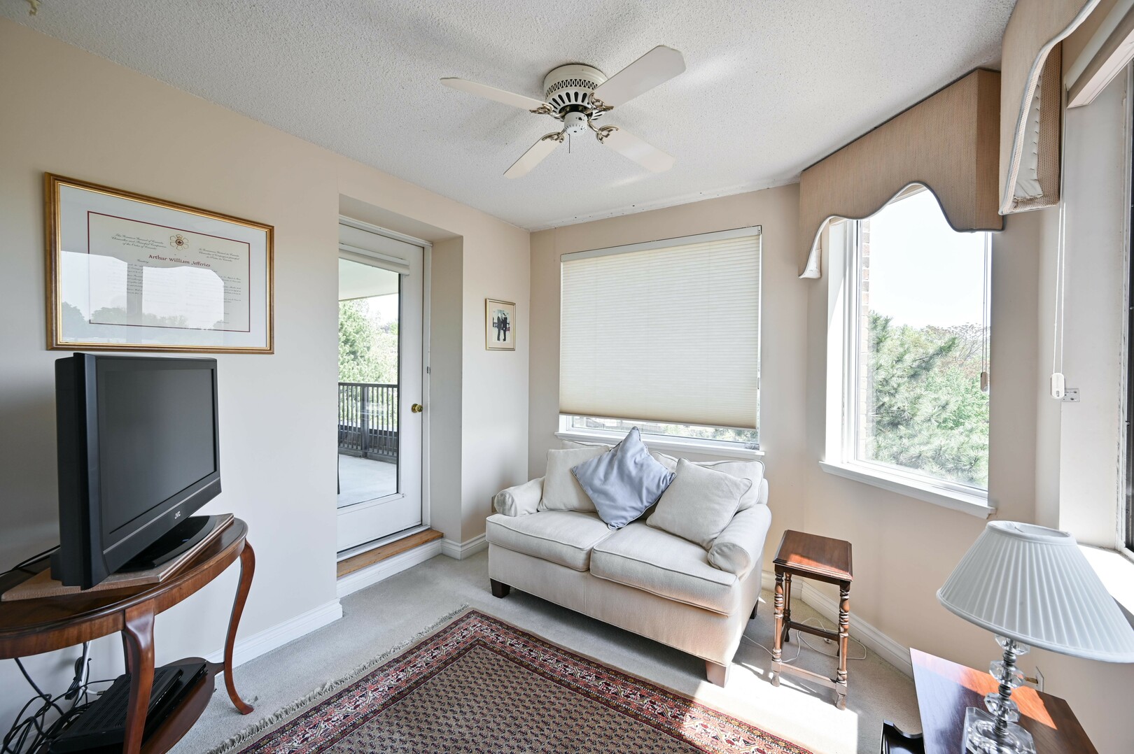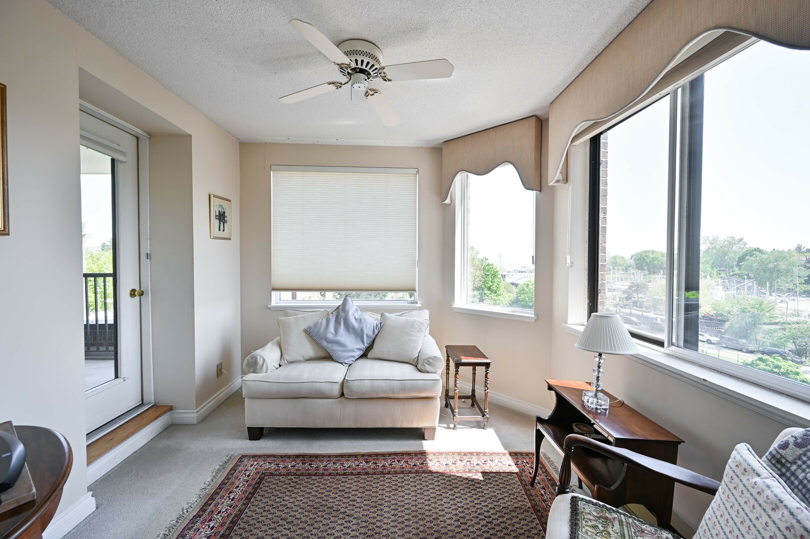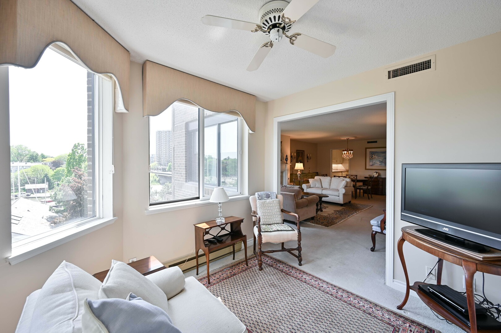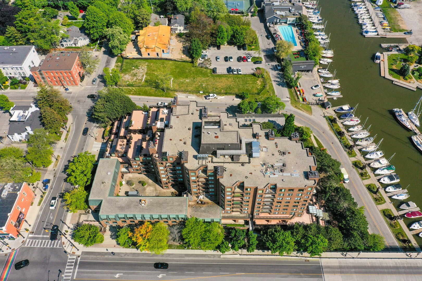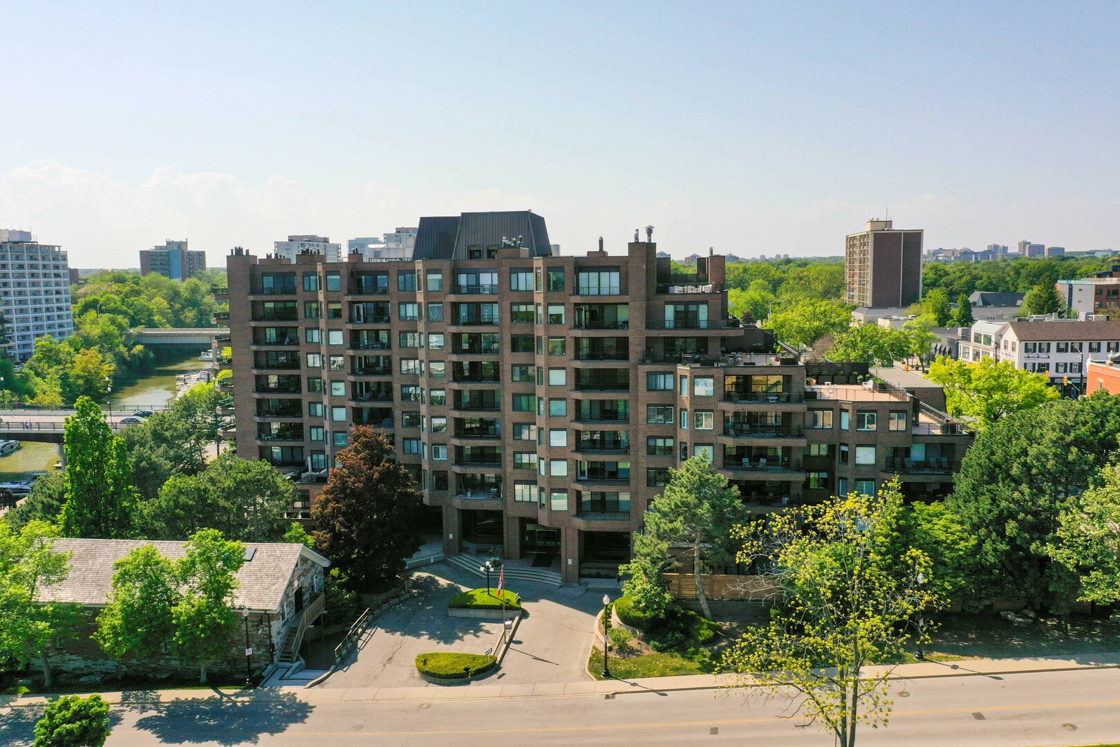 Sophisticated Lake-view suite in Downtown Oakville's ""The Granary"". A highly desirable and sought-after location, this large two bedroom, two bathroom condominium is over 1500 sq ft, spacious and bright, in an unparalleled setting. The sunroom, private balcony, and the living room all boast gorgeous South facing views over Lake Ontario, Old Oakville Heritage District and the Harbour Front. Cozy up by the fireplace in the open concept Living/Dining room. Includes a designated underground parking space, ample visitor parking, a large storage locker, indoor pool and sauna facility, exercise room, 24 hour concierge/security, guest suites, and party room. Stroll to the Lake, Library, Theatre, Museum, Oakville Club, Boutiques and Restaurants all within minutes. The vibrant atmosphere of Downtown Oakville is literally right outside your doorstep.