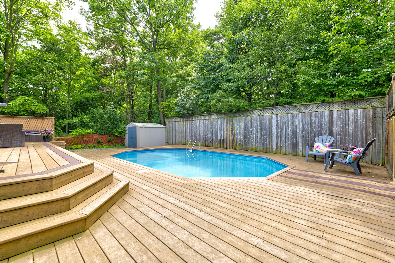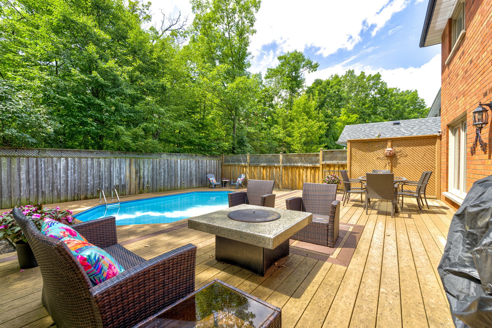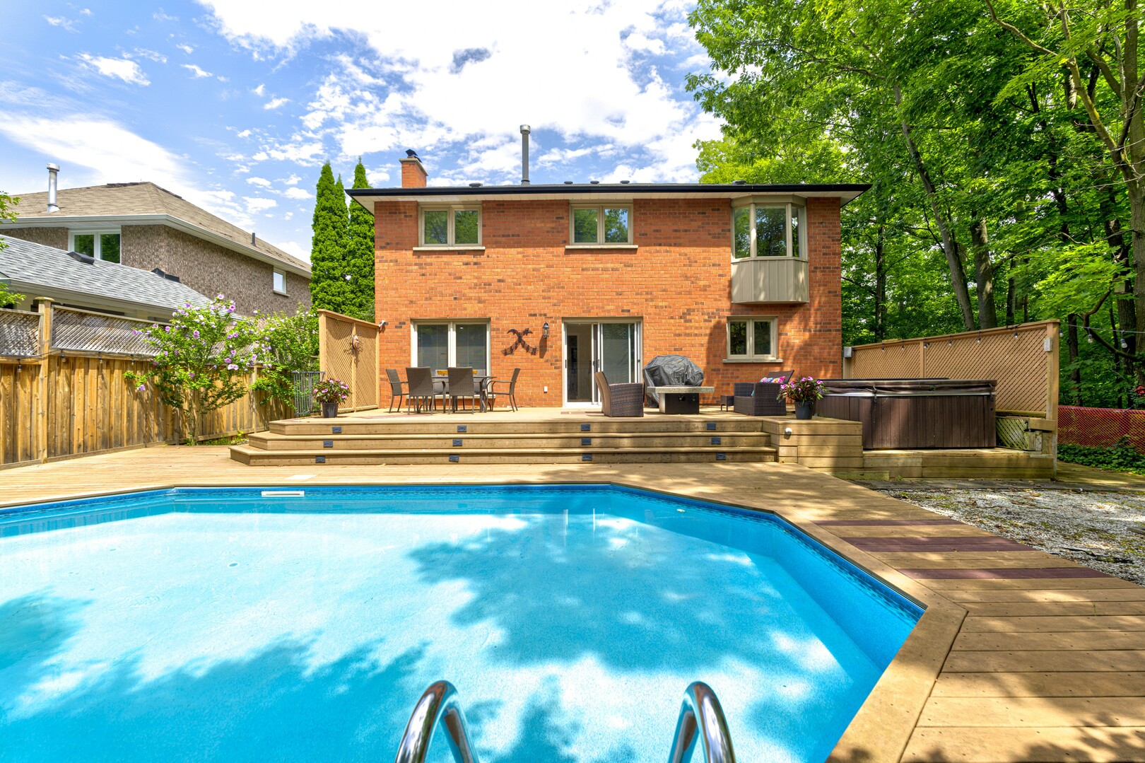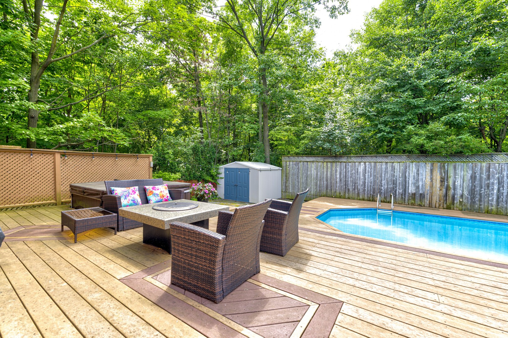 Private backyard oasis! This luxury 4 + 2 Bed, 4 +1 bath home backs on and is beside Oakridge Park with its lush forested walking trails. You will love staying home surrounded by nature. Enjoy swimming in the pool, relaxing in the hot tub or on the beautiful low maintenance composite deck. Inside you will enjoy the chef's dream kitchen with solid wood cabinets, some sparkling glass door cabinets, high-end appliances like Sub-Zero fridge, granite counters, built-in wall ovens and a massive island. Main floor has hardwood throughout, cozy living room with wood burning fireplace, large dining room, convenient main floor office, 2 piece powder room and mud/ laundry room with side door and garage access. Second floor also has hardwood throughout, huge primary bedroom with double closets, beautifully updated 5 piece bathroom with stand alone soaker tub. There are 3 other good sized bedrooms. One bedroom has updated 3 piece ensuite bathroom and there is a gorgeous updated main bathroom with double sinks and glass shower. The basement is completely finished with spacious family room with gas fireplace. There are 2 more very large bedrooms and a 3 piece bathroom.Step outside and you're right next to a forest walk, running, biking trail. Located in desirable River Oaks neighourhood with top ranked public/ private schools, easy highway access and close to shopping