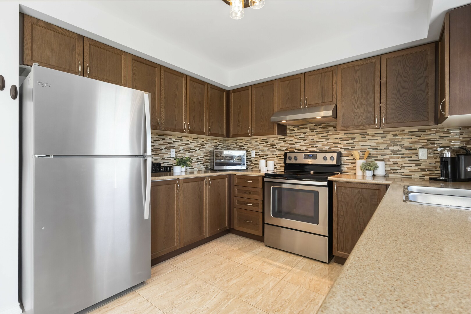 The Spacious Layout has been thoughtfully designed with generous living spaces throughout and offers a versatile layout perfect for any family dynamic. The Eat-In Family Size Kitchen is Bright and airy. It boasts stainless steel appliances and a walkout to a private deck overlooking lush green space, perfect for your morning coffee or evening unwind.