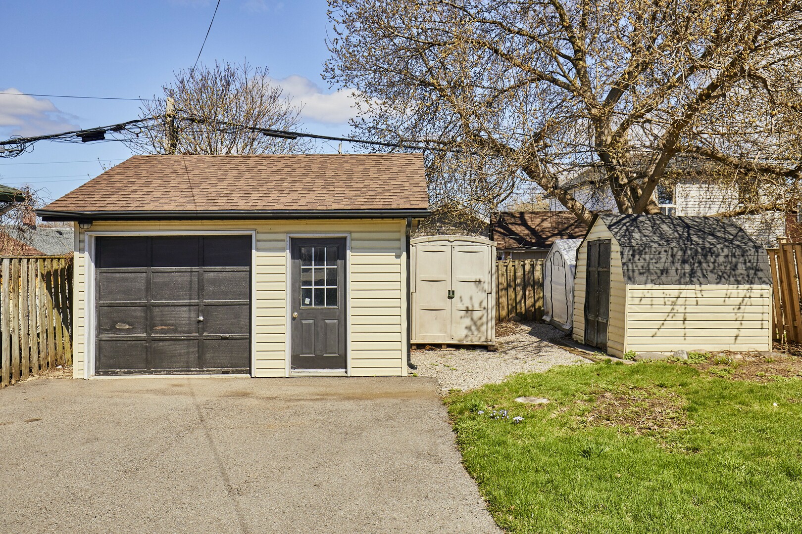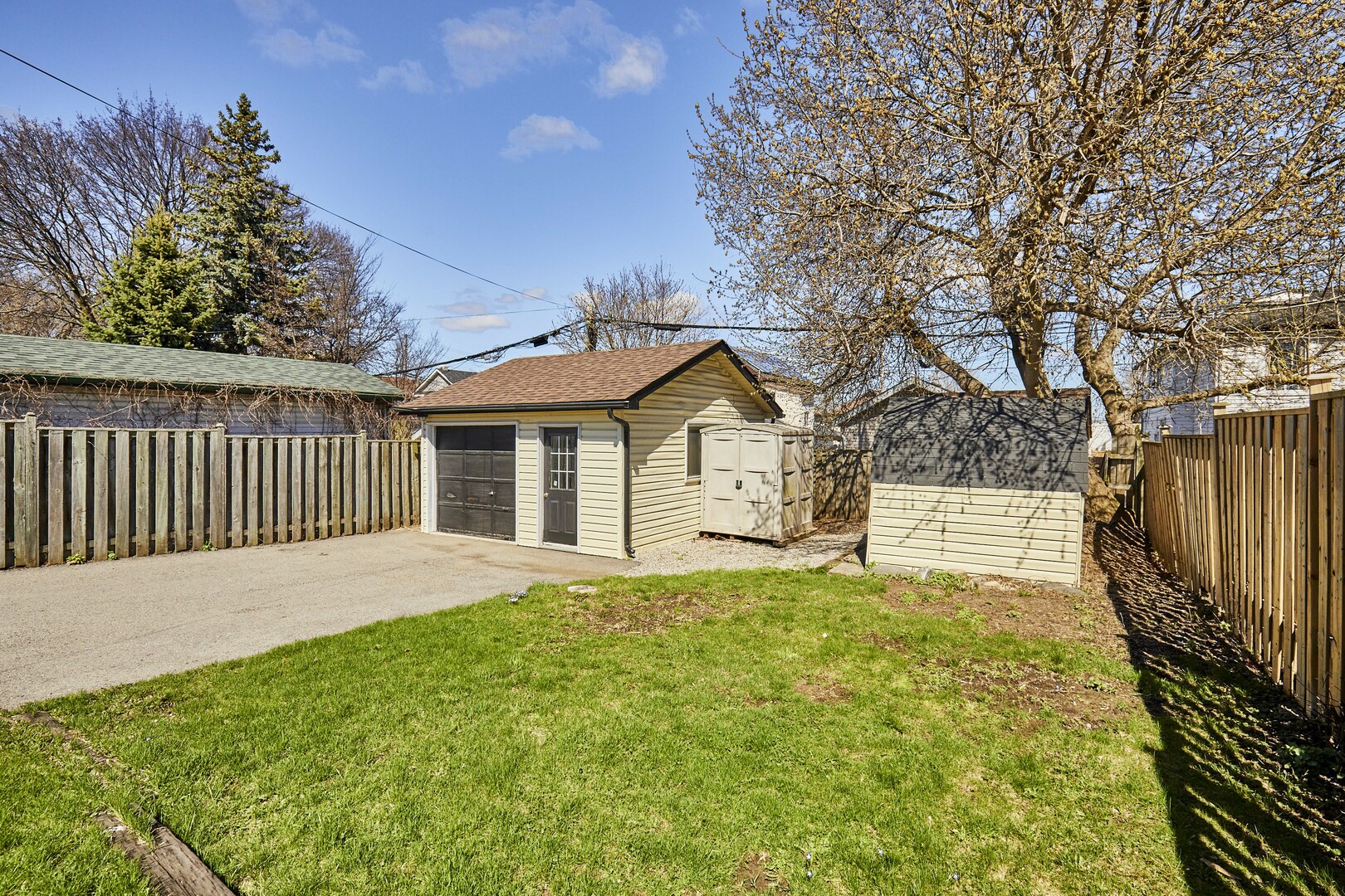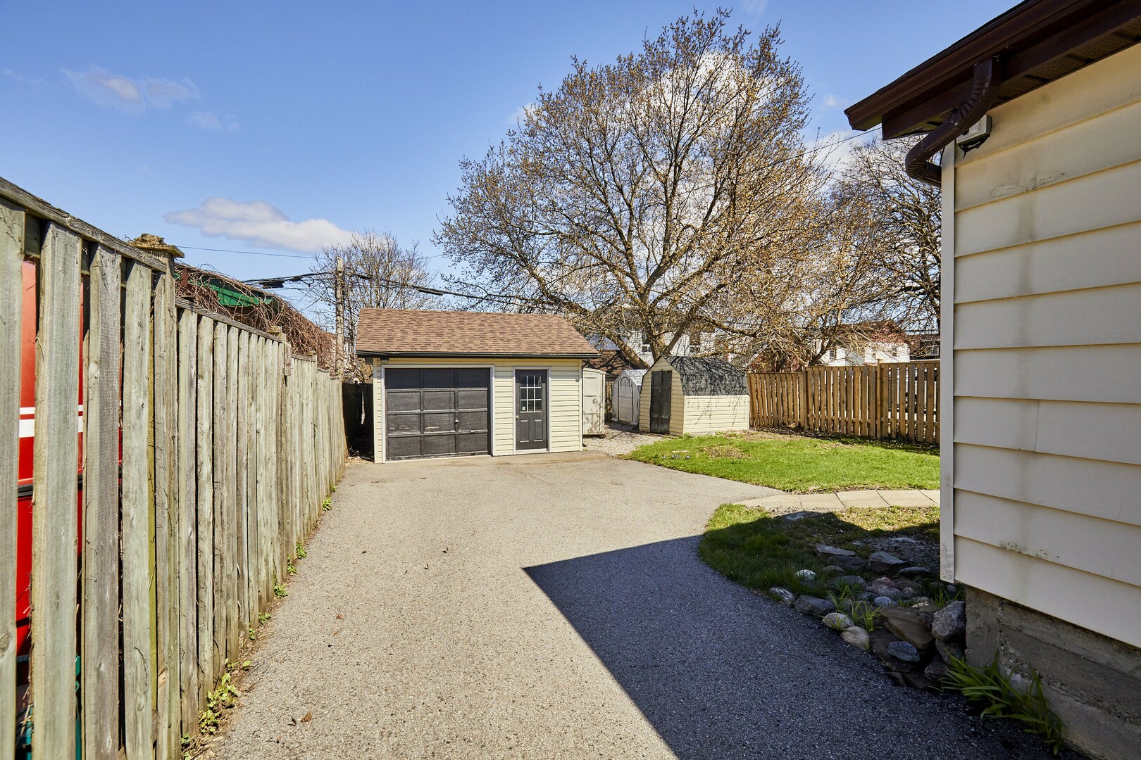 Great fenced in backyard with detached single garage with all new plywood inside and roof.