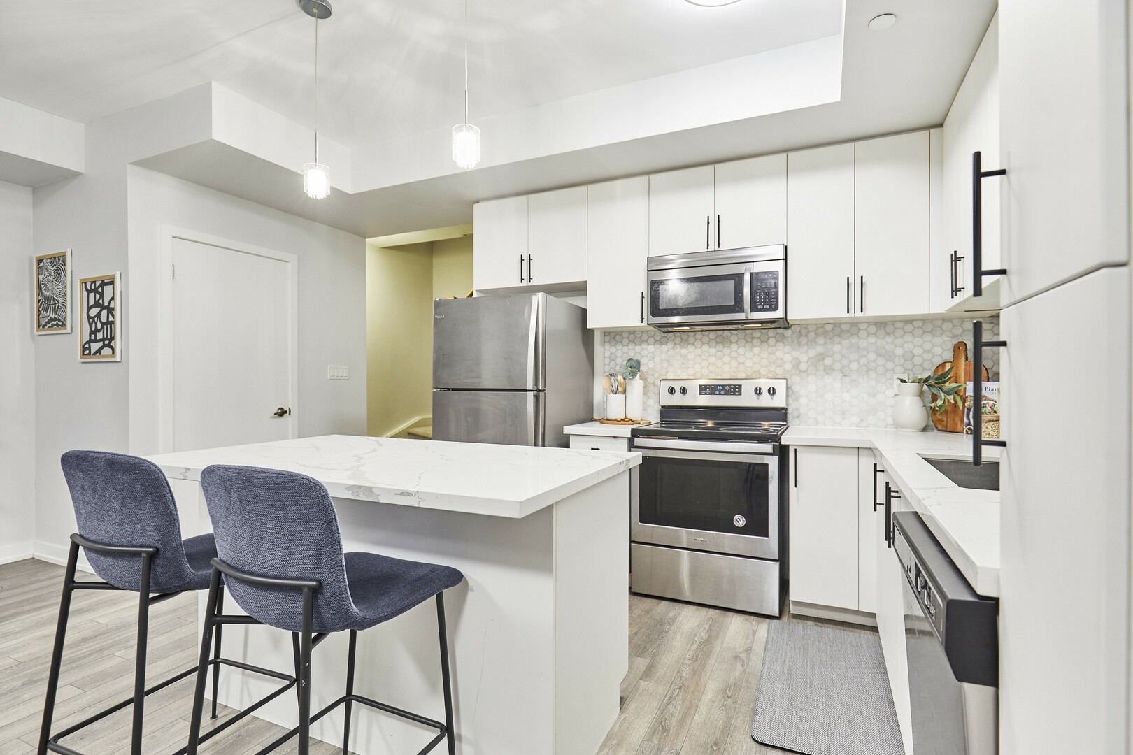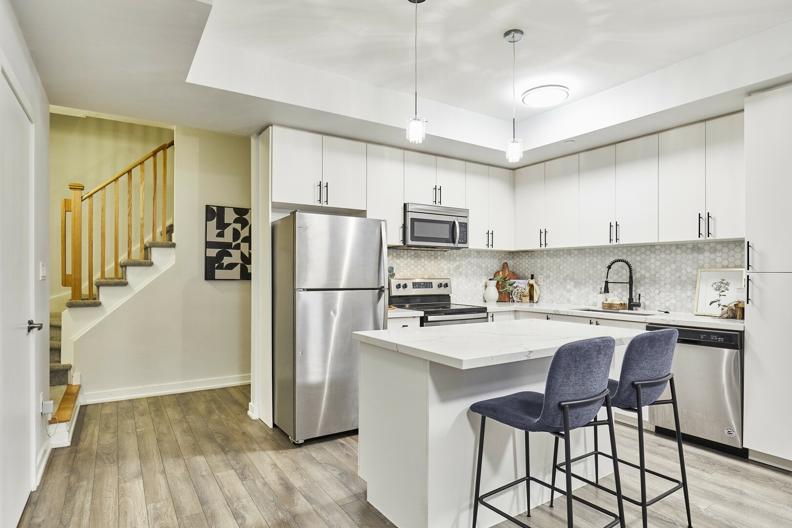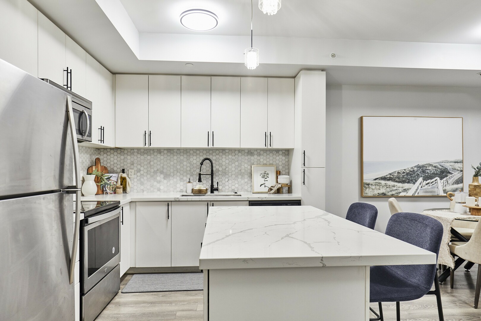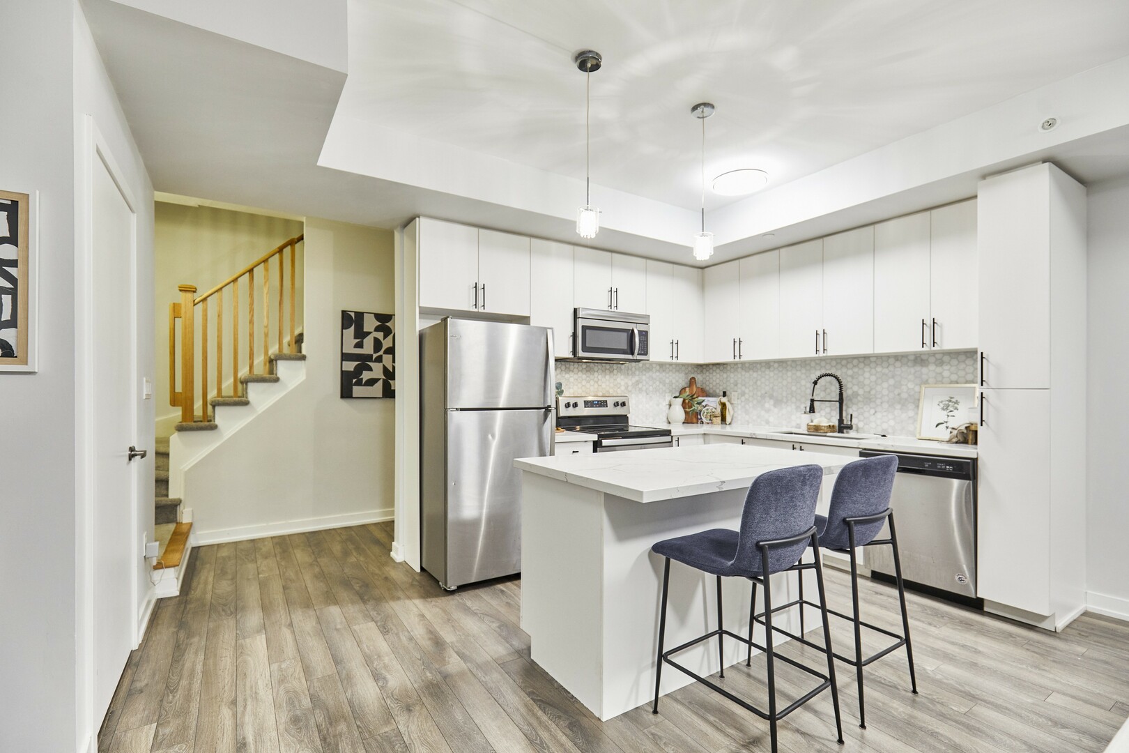 The modern kitchen is perfect for culinary enthusiasts, equipped with stainless steel appliances ,including a fridge, stove, range hood microwave, and dishwasher. The large island with breakfast bar, and quartz countertops with marble backsplash blend functionality with modern flair. Pendant lighting adds a stylish accent, while ample cabinetry and an undermounted double sink with a professional-grade faucet make this a truly efficient workspace.