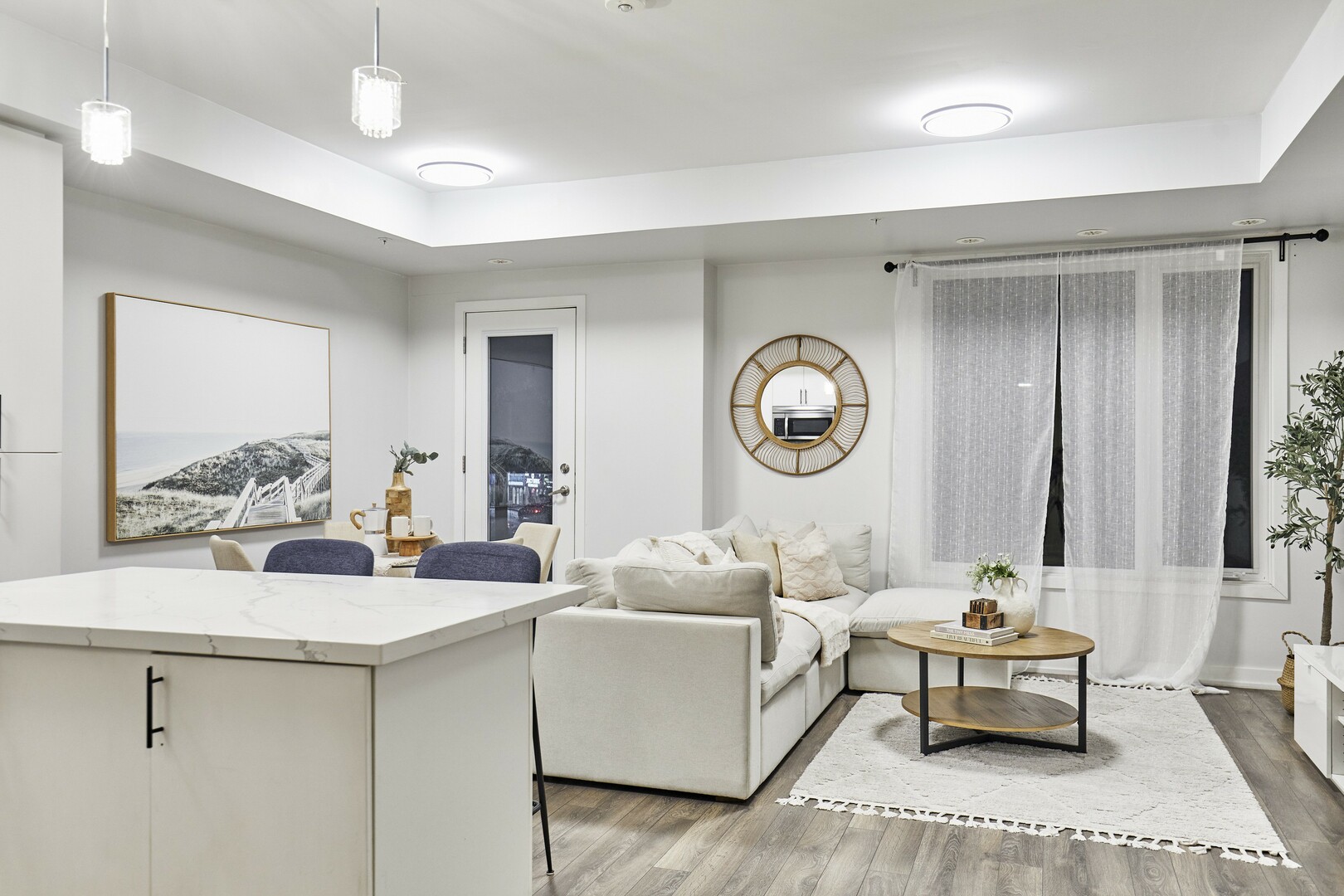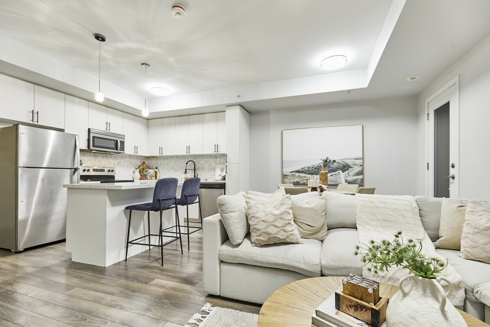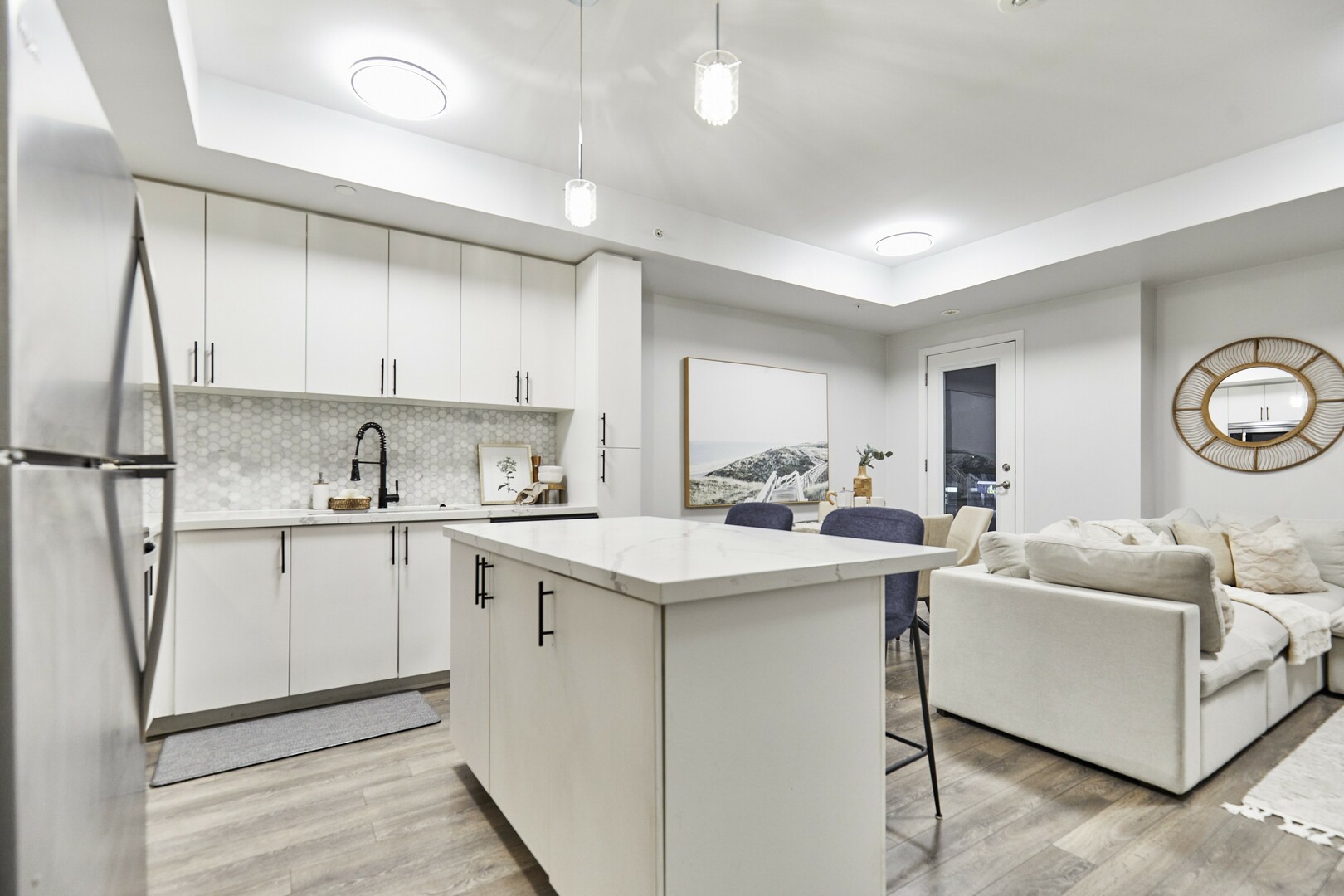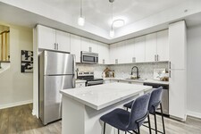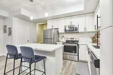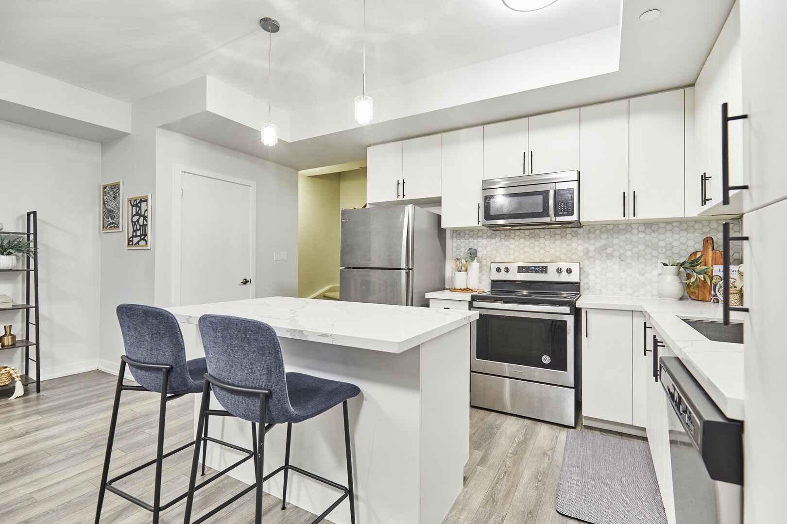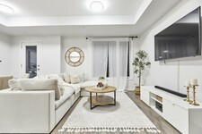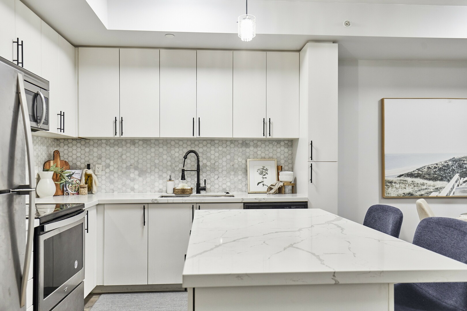 The modern kitchen is perfect for culinary enthusiasts, equipped with stainless steel appliances ,including a fridge, stove, range hood microwave, and dishwasher. The large island with breakfast bar, and quartz countertops with marble backsplash blend functionality with modern flair. Pendant lighting adds a stylish accent, while ample cabinetry and an undermounted double sink with a professional-grade faucet make this a truly efficient workspace.