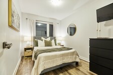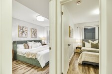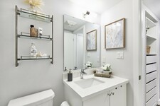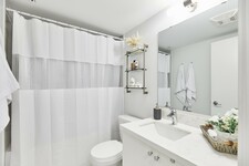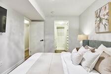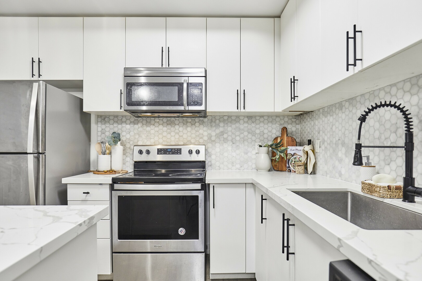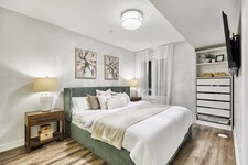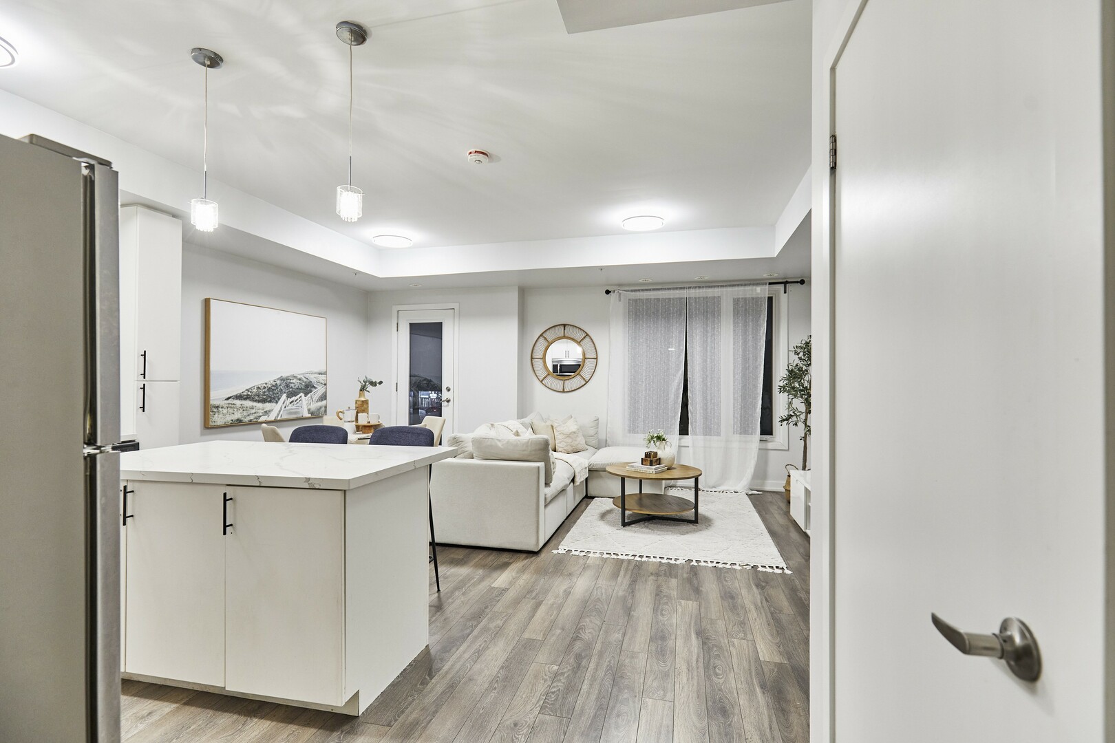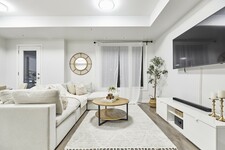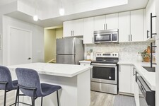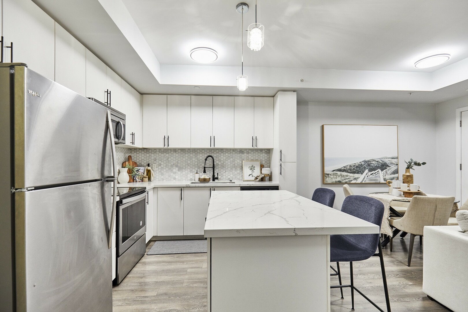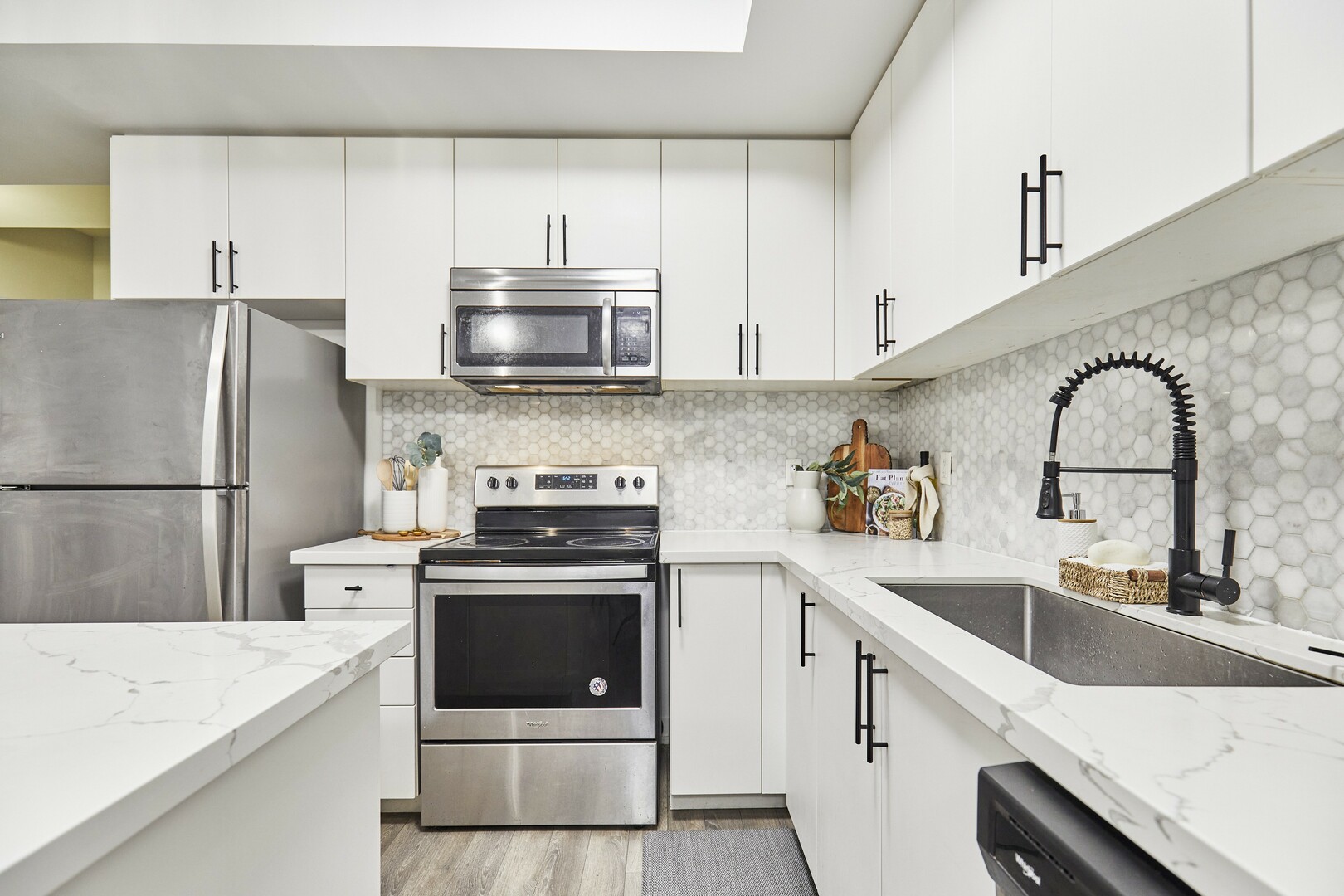 The modern kitchen is perfect for culinary enthusiasts, equipped with stainless steel appliances ,including a fridge, stove, range hood microwave, and dishwasher. The large island with breakfast bar, and quartz countertops with marble backsplash blend functionality with modern flair. Pendant lighting adds a stylish accent, while ample cabinetry and an undermounted double sink with a professional-grade faucet make this a truly efficient workspace.