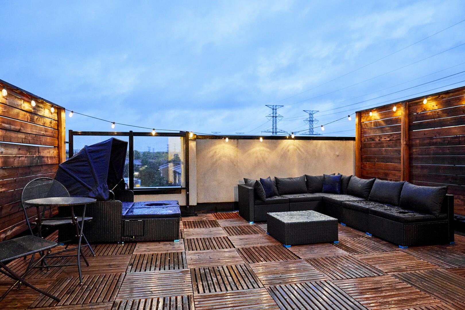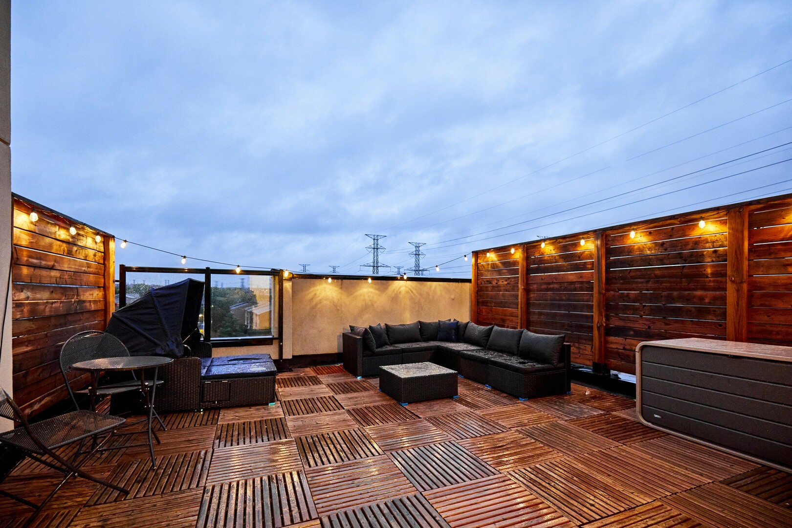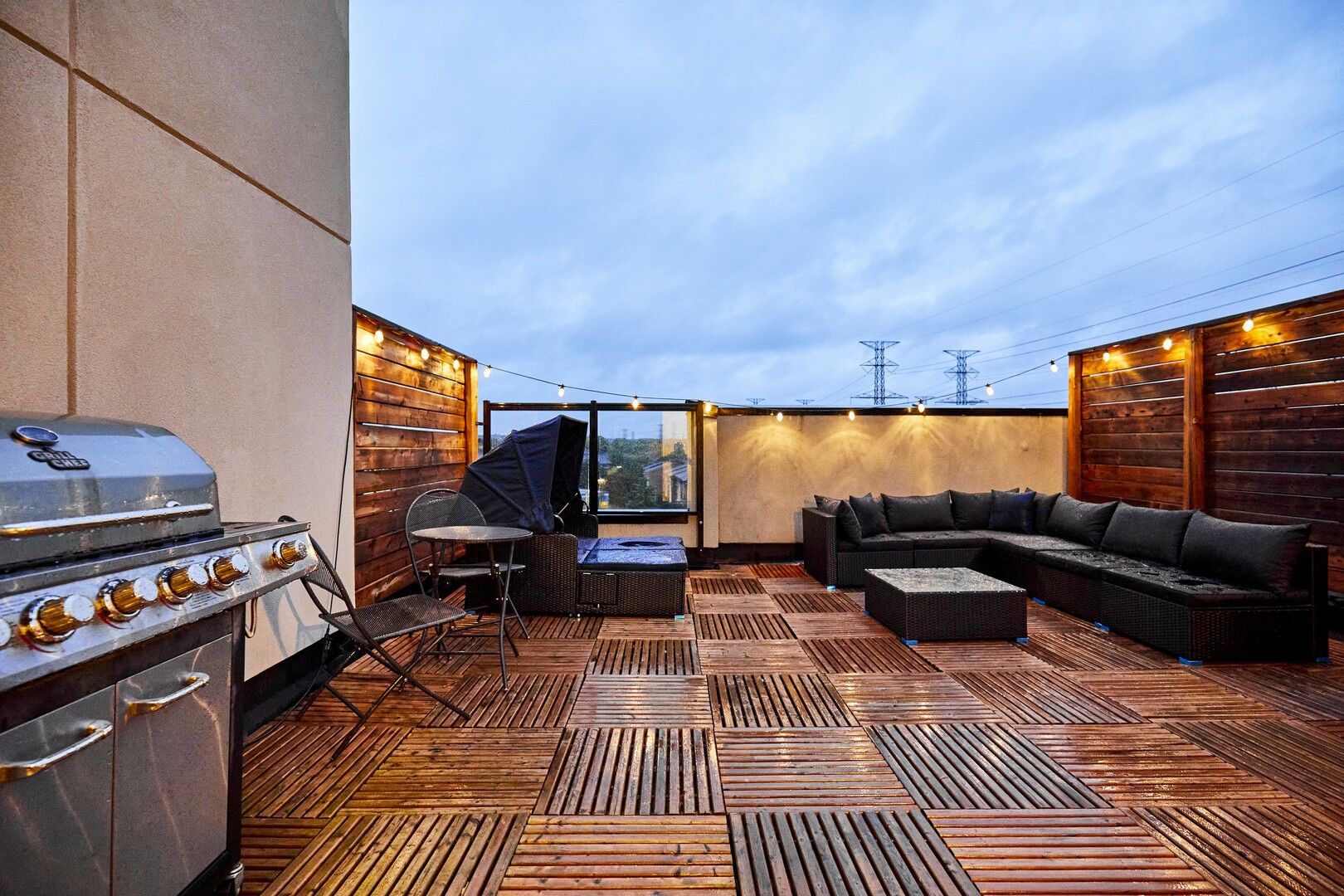 On the third floor, you will access the extra-large terrace ,a private outdoor oasis featuring wooden privacy walls and wooden tile flooring for a touch of luxury and style to the already enjoyable space. It is the perfect spot for entertaining, relaxing, or enjoying quiet evenings under the stars.