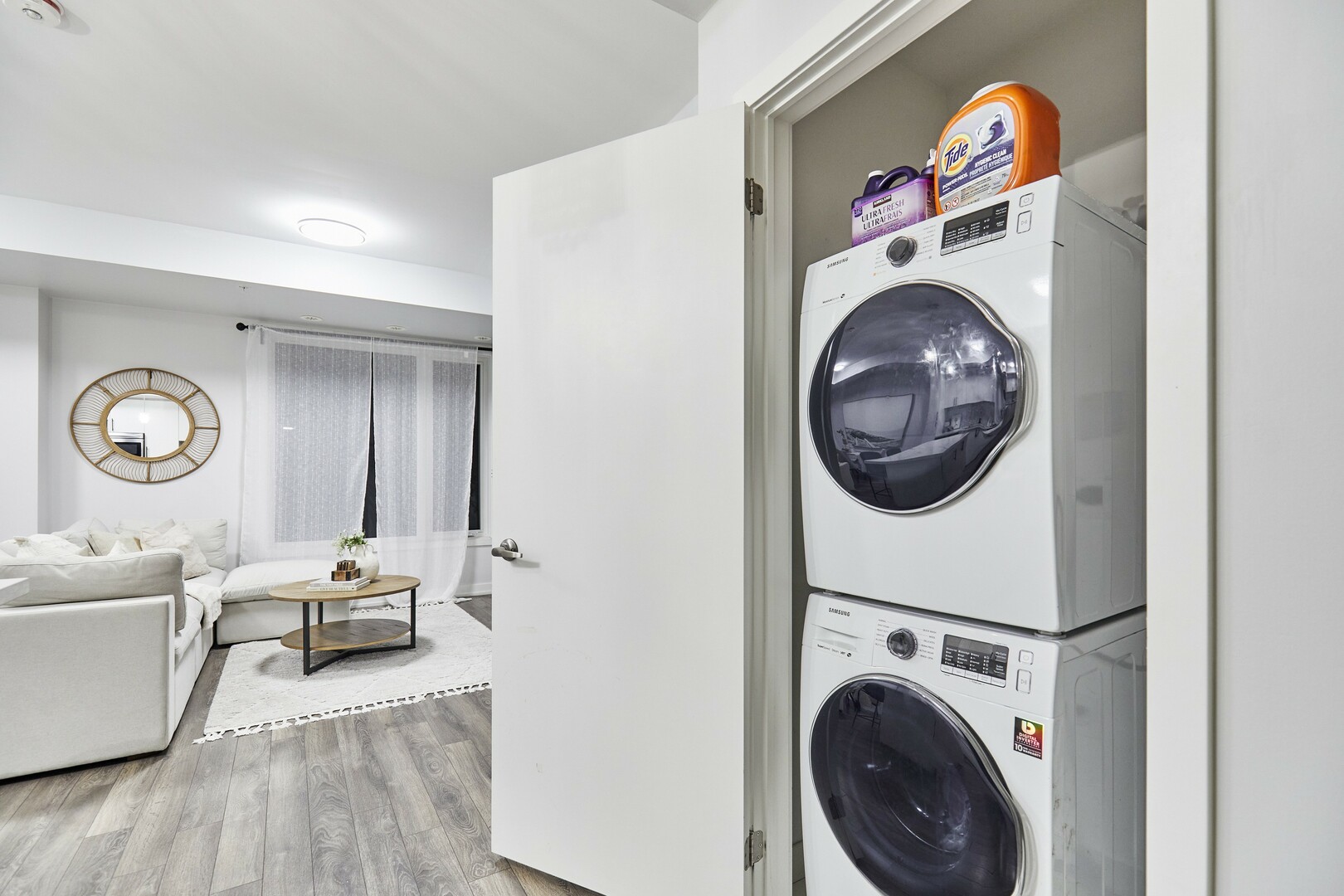 A stacked HE washer and dryer are conveniently located on the main level for added ease.