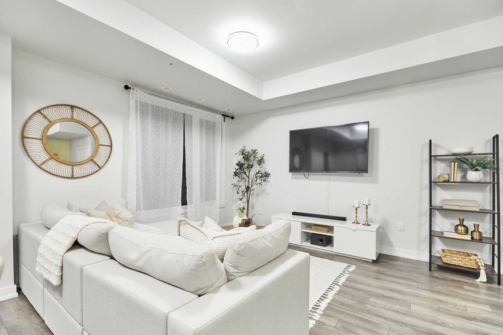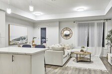 The bright and open living area is bathed in natural light from the oversized window. Smooth ceilings, laminate flooring, and upgraded baseboards enhance the sense of space, creating a warm environment for relaxing or entertaining.