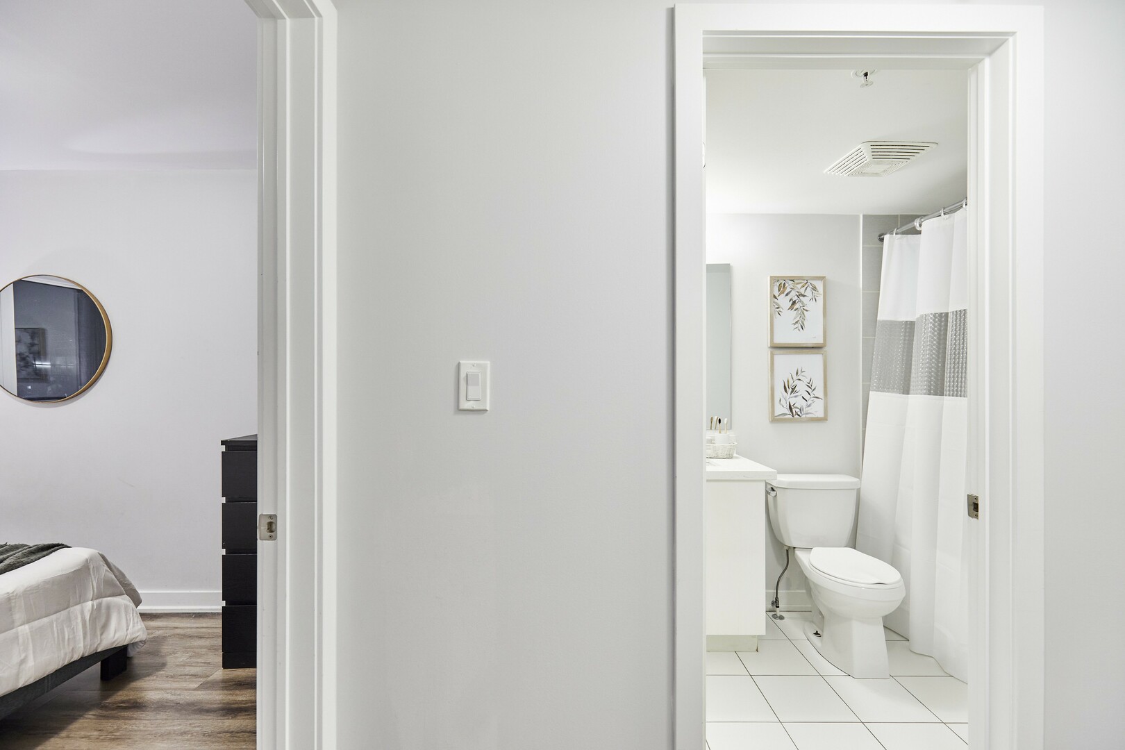The main bathroom mirrors the home’s modern aesthetic, with ceramic tile flooring, a stone-top vanity, and a deep tub-shower combination.