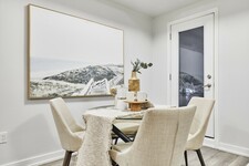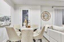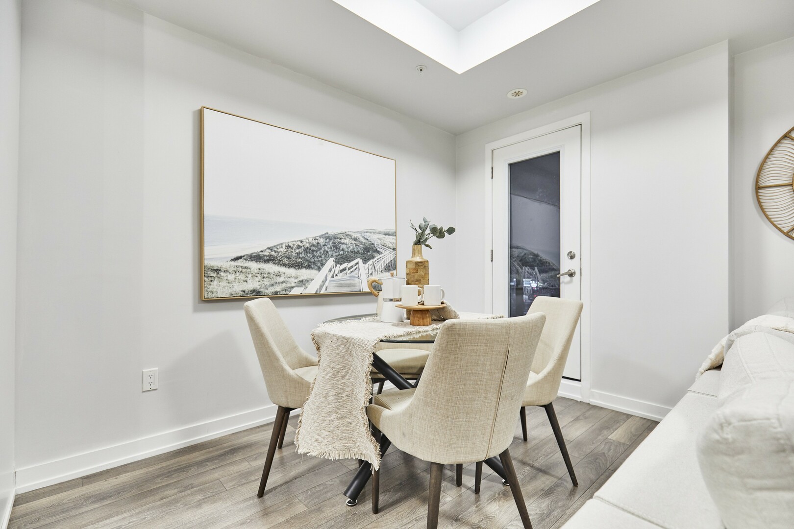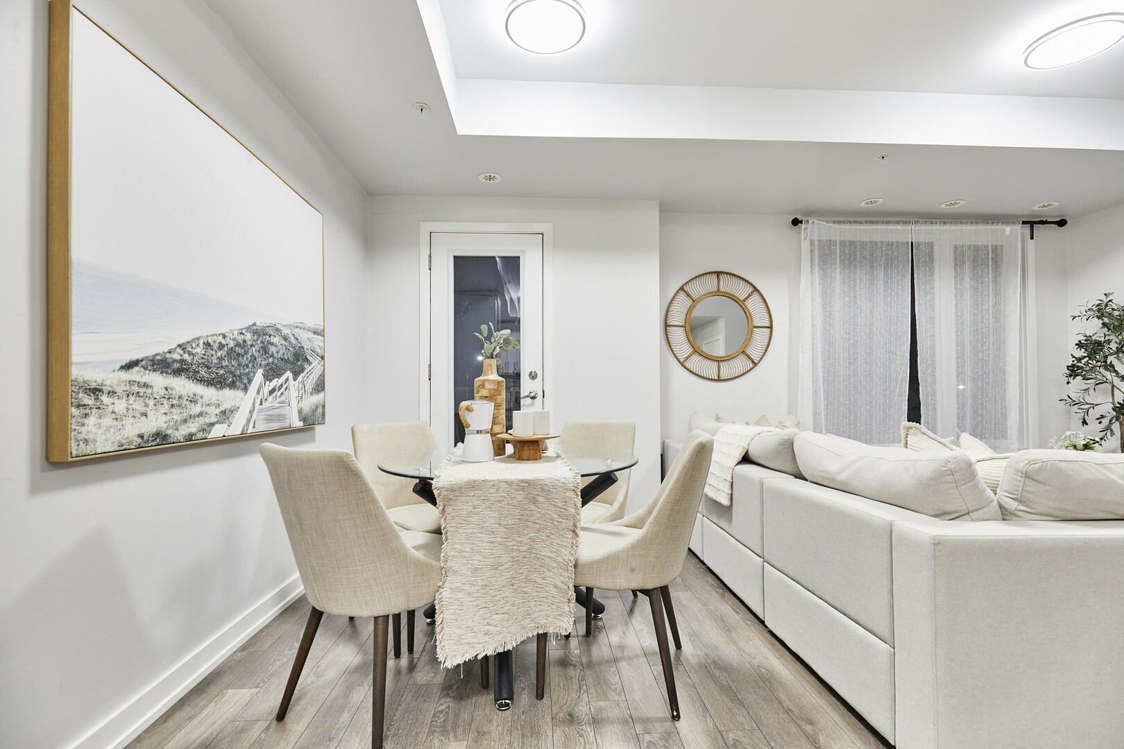 The adjacent dining area features laminate flooring and a walk-out to a Juliet balcony, ideal for morning coffee or evening breezes.