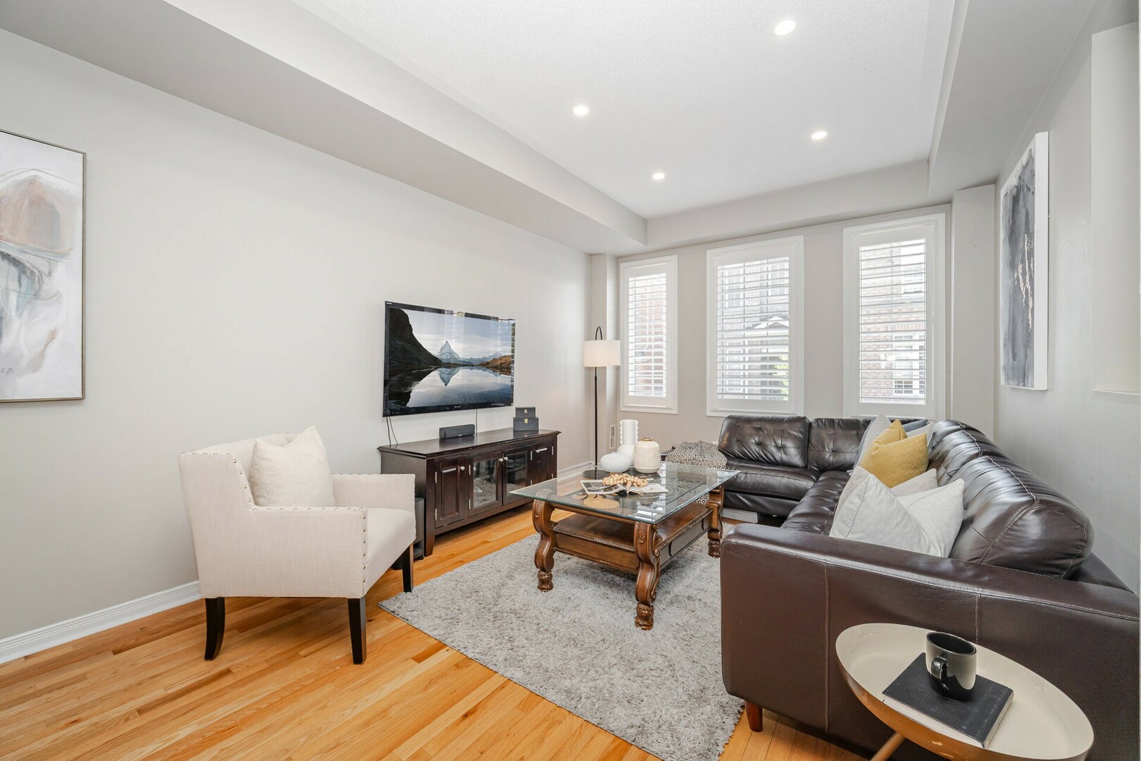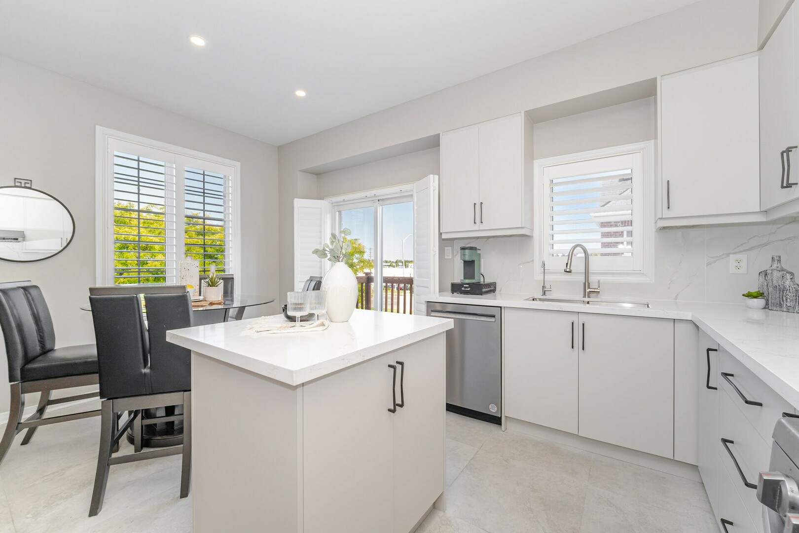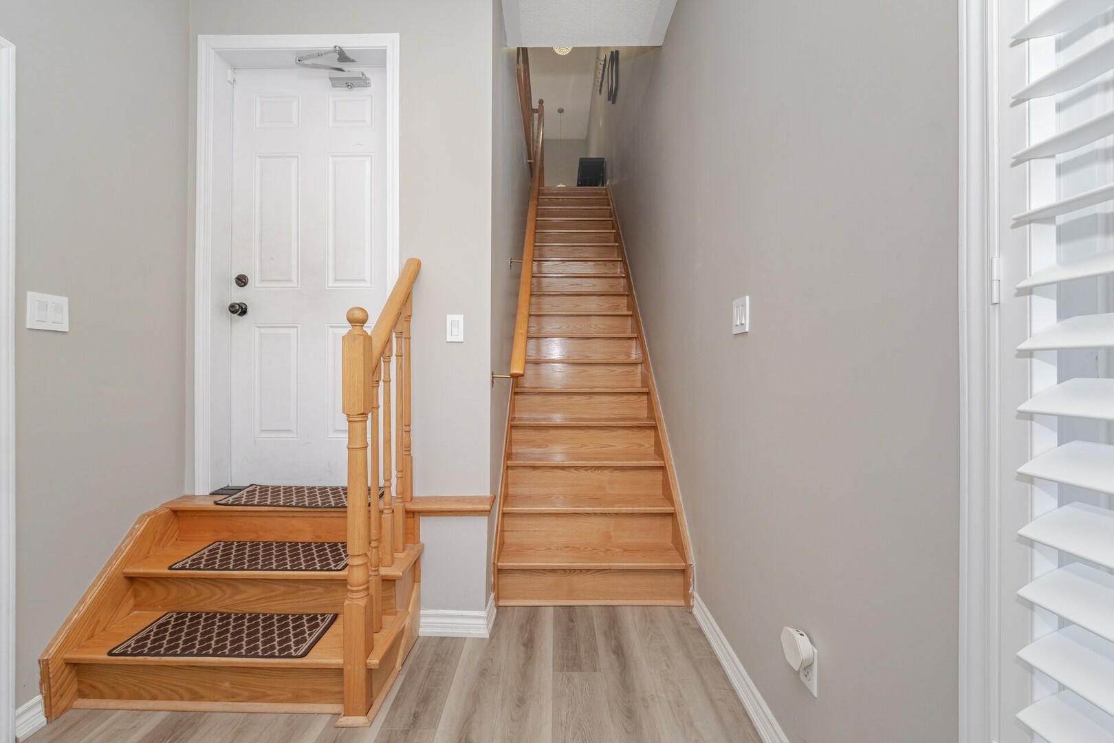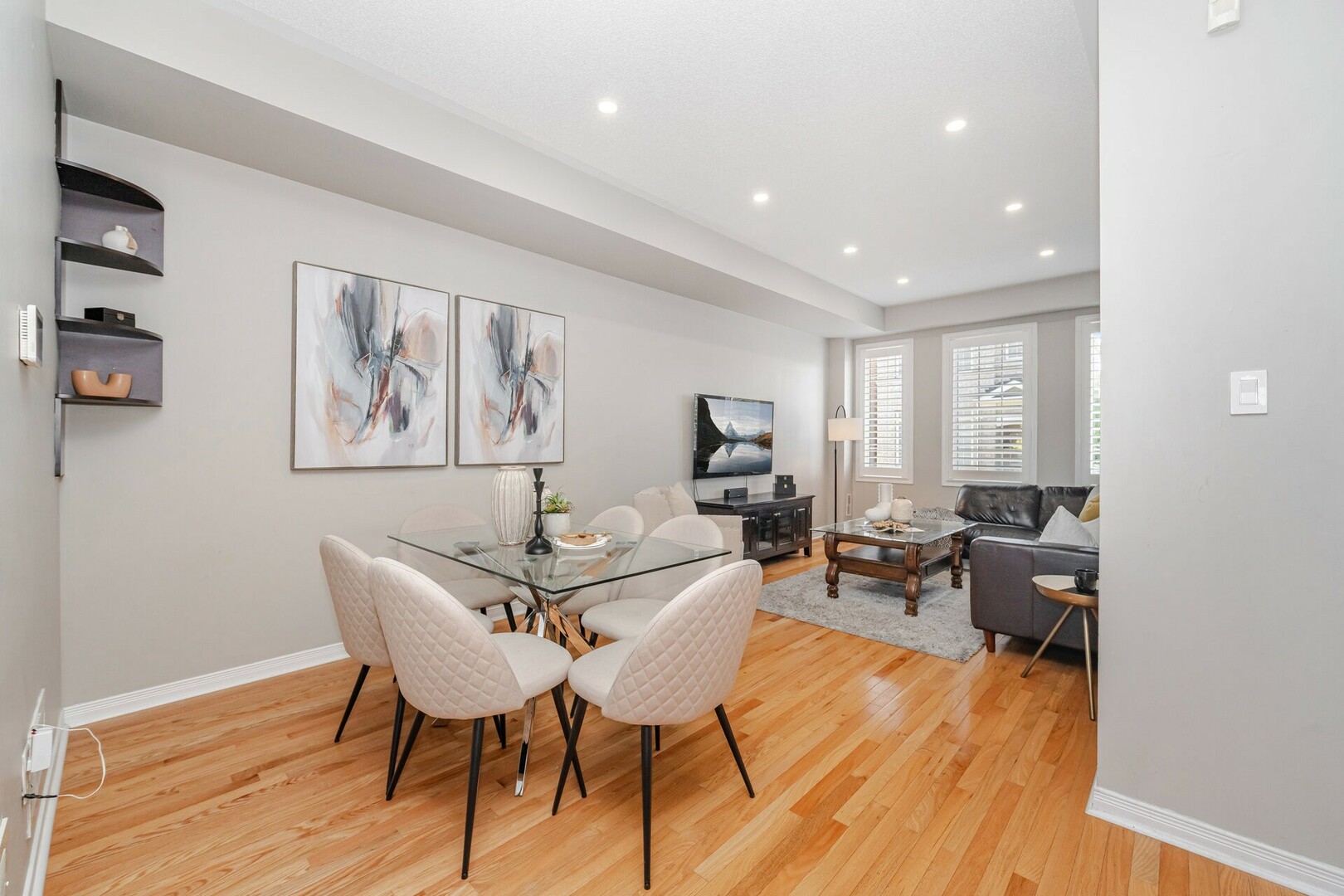 Beautiful 3 Bedroom 3 Bath End Unit Townhome * * Rarely Offered Parking for 5 Cars * * Updated Kitchen with Porcelain Floors, Quartz Counters, and Under cabinet Lighting * Updated Bathrooms with Frameless Showers and Time Controlled Exhaust Fans * 9 Ft. Ceiling on Main Floor * Hardwood Floors * No Carpet * Oak Stairs * California Shutters * Primary Bedroom with Custom Closet and 6 Pc. Ensuite ** Interlock Driveway * Entrance from Garage * New Roof * Furnace ('19) * Close to Shopping, Transit, Hwy 401, Places of Worship