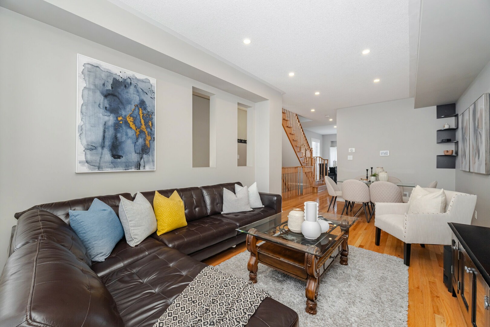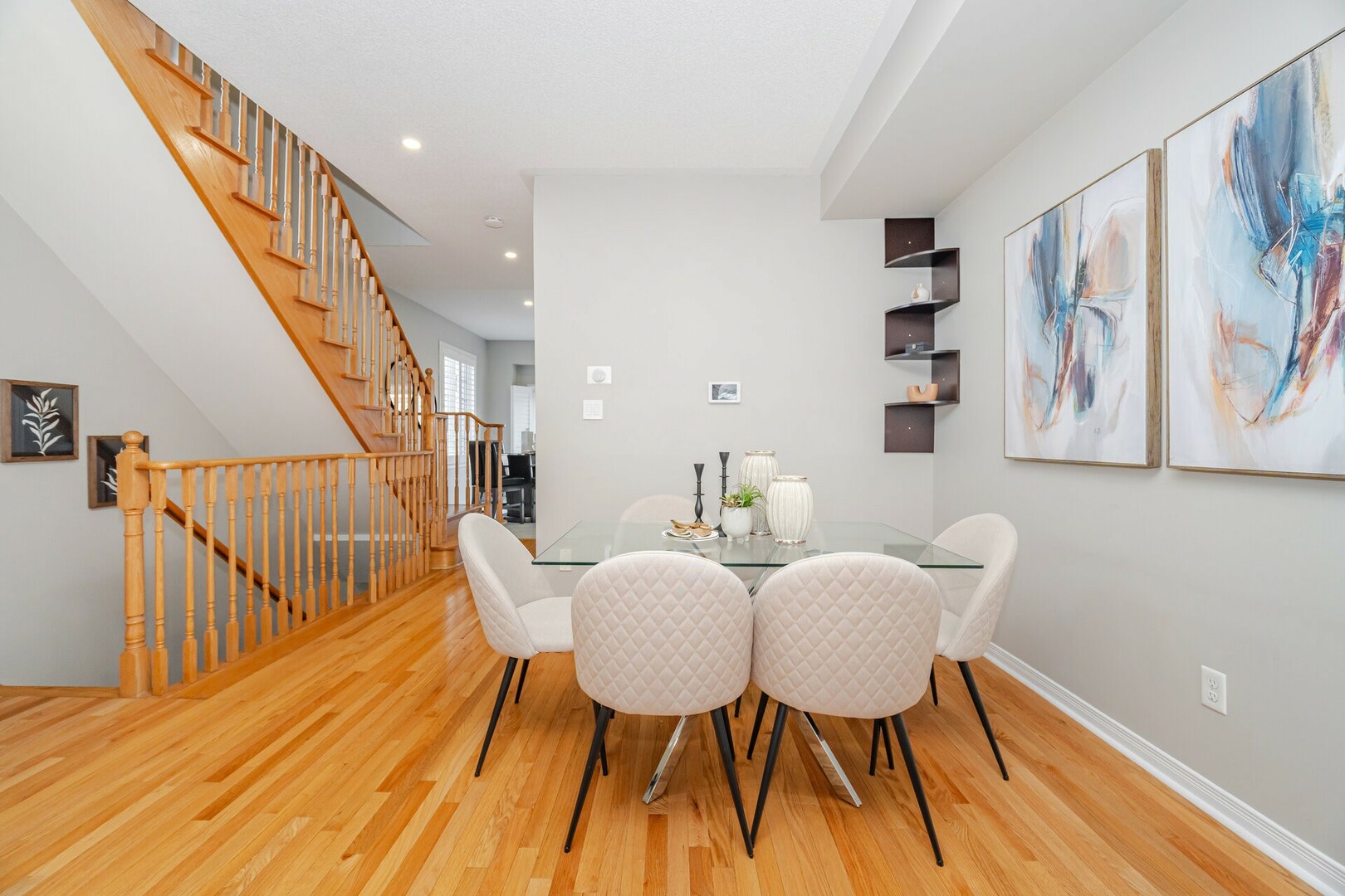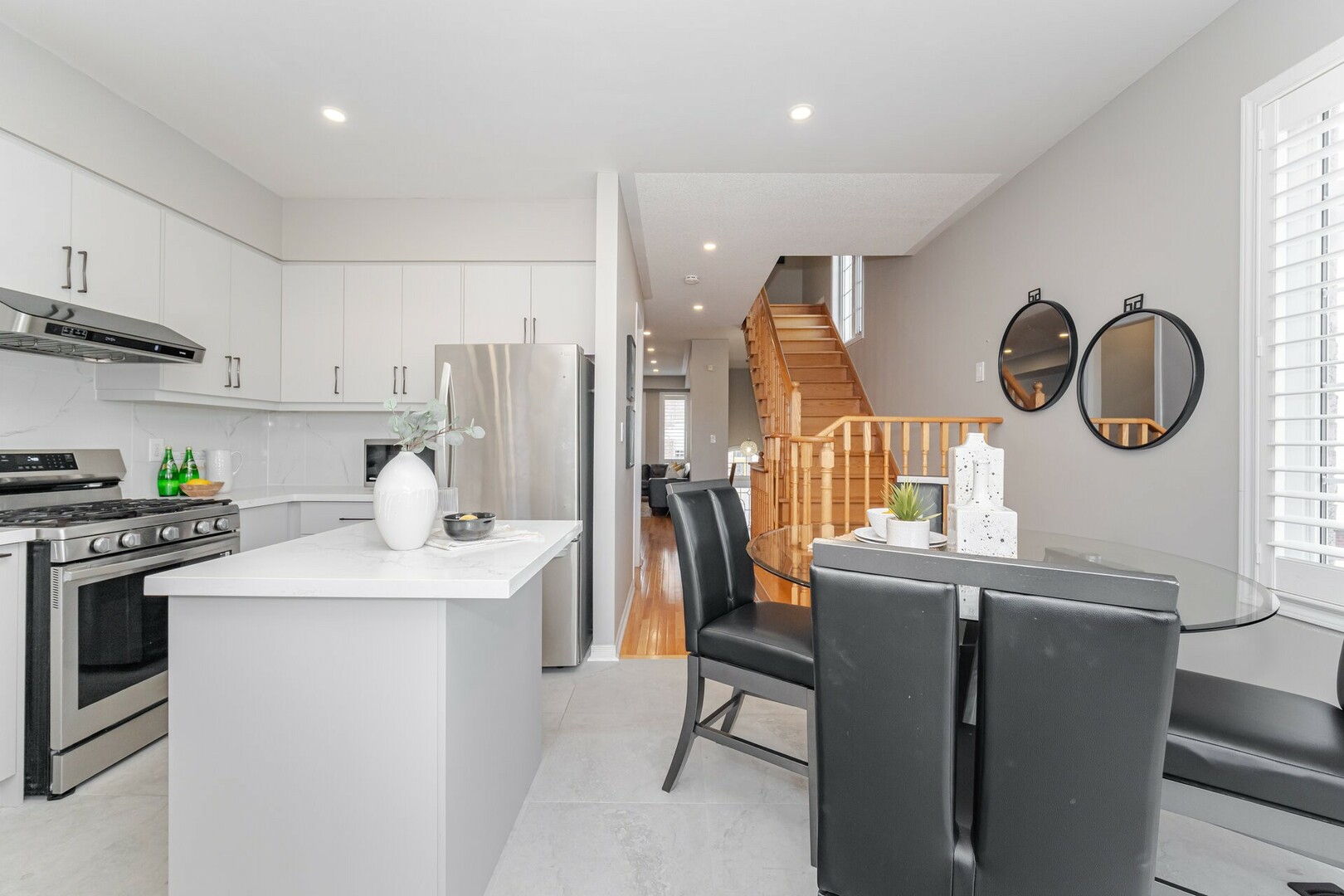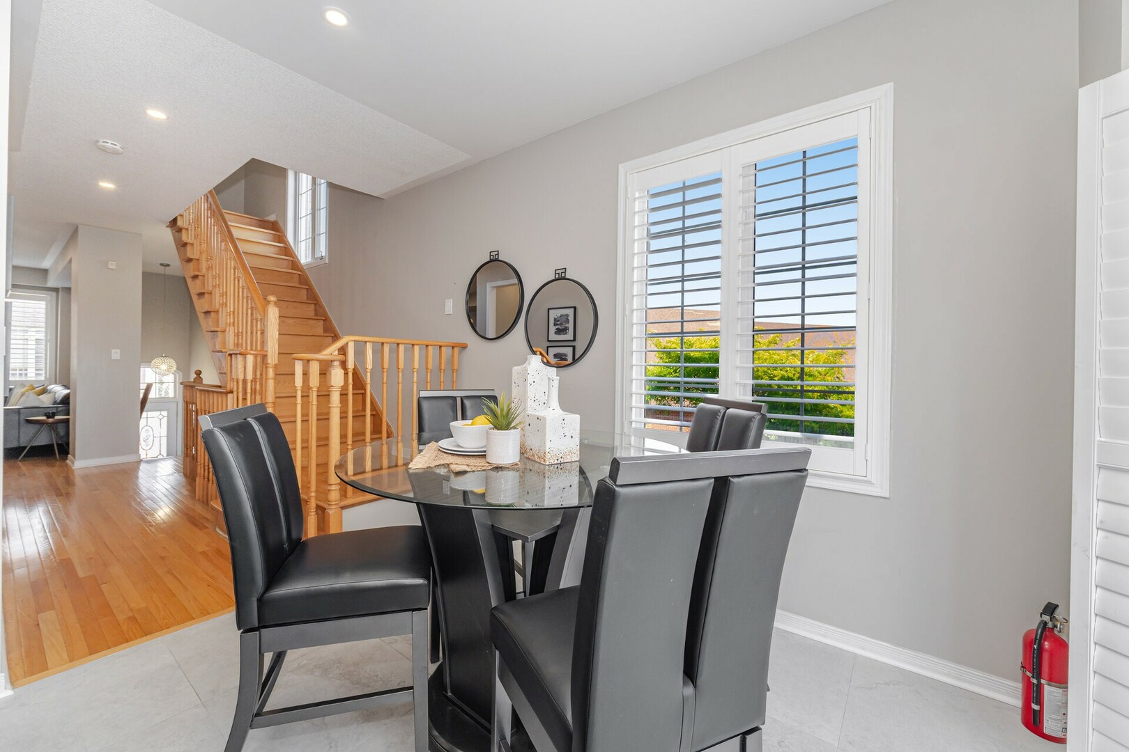 Beautiful 3 Bedroom 3 Bath End Unit Townhome * * Rarely Offered Parking for 5 Cars * * Updated Kitchen with Porcelain Floors, Quartz Counters, and Under cabinet Lighting * Updated Bathrooms with Frameless Showers and Time Controlled Exhaust Fans * 9 Ft. Ceiling on Main Floor * Hardwood Floors * No Carpet * Oak Stairs * California Shutters * Primary Bedroom with Custom Closet and 6 Pc. Ensuite ** Interlock Driveway * Entrance from Garage * New Roof * Furnace ('19) * Close to Shopping, Transit, Hwy 401, Places of Worship