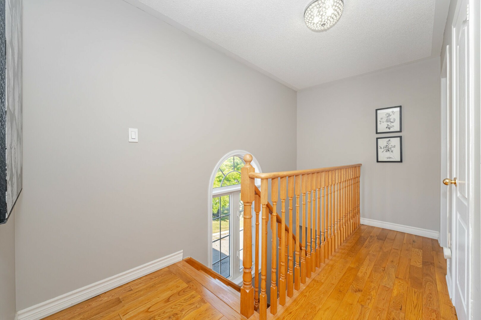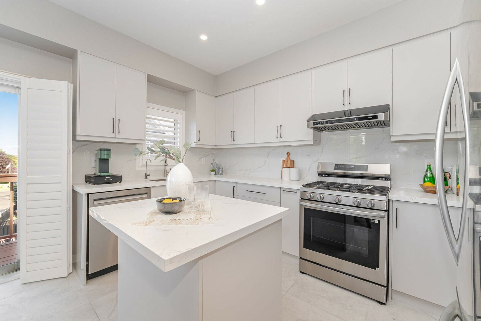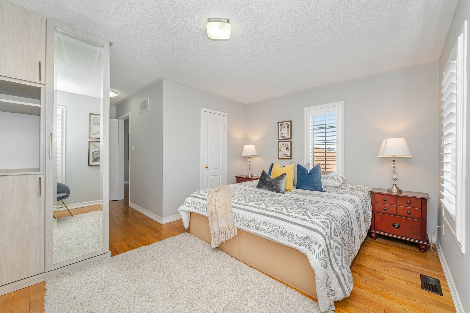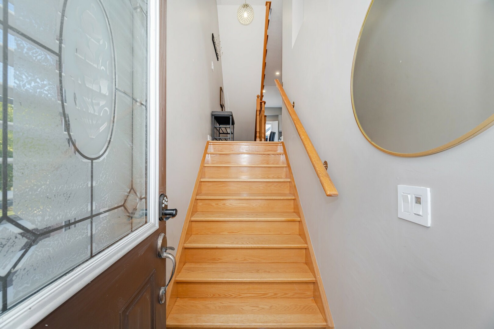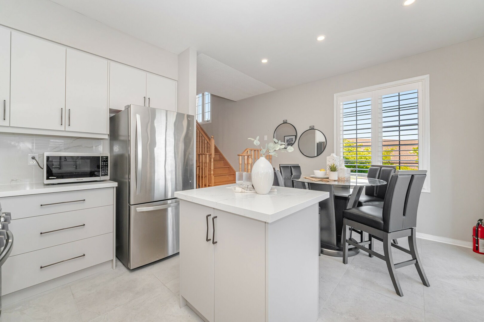 Beautiful 3 Bedroom 3 Bath End Unit Townhome * * Rarely Offered Parking for 5 Cars * * Updated Kitchen with Porcelain Floors, Quartz Counters, and Under cabinet Lighting * Updated Bathrooms with Frameless Showers and Time Controlled Exhaust Fans * 9 Ft. Ceiling on Main Floor * Hardwood Floors * No Carpet * Oak Stairs * California Shutters * Primary Bedroom with Custom Closet and 6 Pc. Ensuite ** Interlock Driveway * Entrance from Garage * New Roof * Furnace ('19) * Close to Shopping, Transit, Hwy 401, Places of Worship
