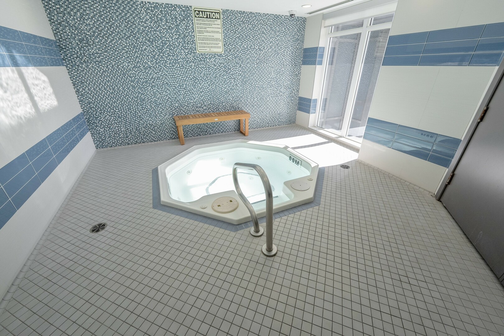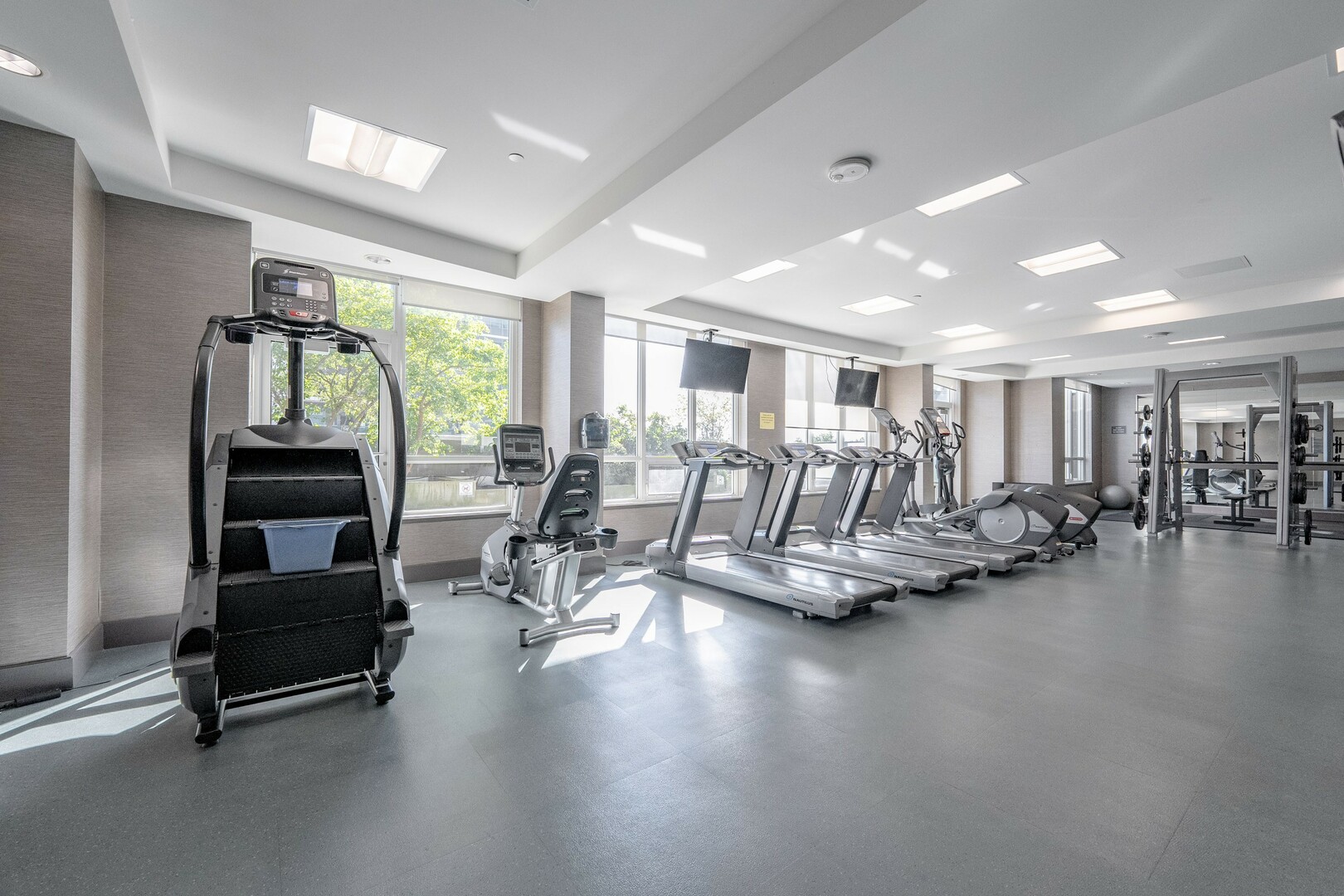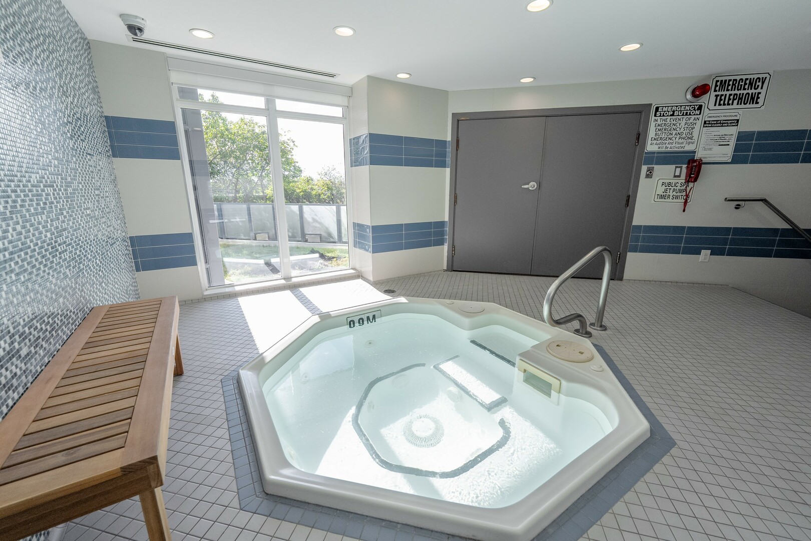 The unit has 10-foot ceilings, stainless steel appliances, granite countertops, and updated lighting. The building offers great amenities like a fitness center, indoor pool, sauna, media room, and more, plus direct access to shops and services on the ground floor. One parking space and a locker are included.
