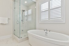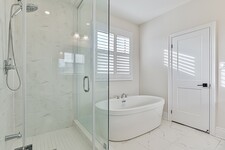 The upgraded kitchen is every chef’s dream, featuring quartz countertops, a ceramic backsplash, and under-cabinet lighting. A center island provides plenty of room for meal prep and social gatherings, while California shutters offer a refined touch to the window.