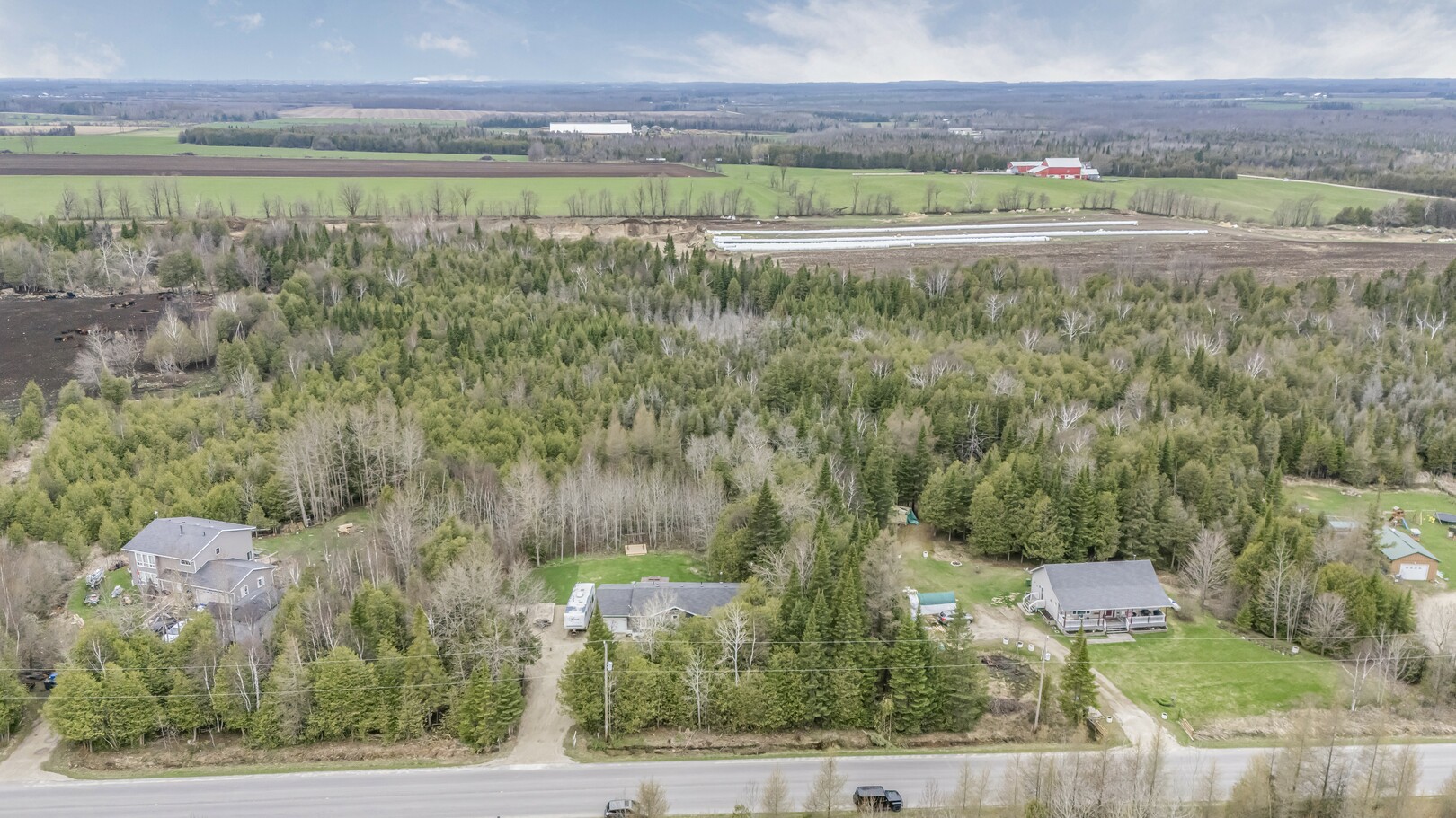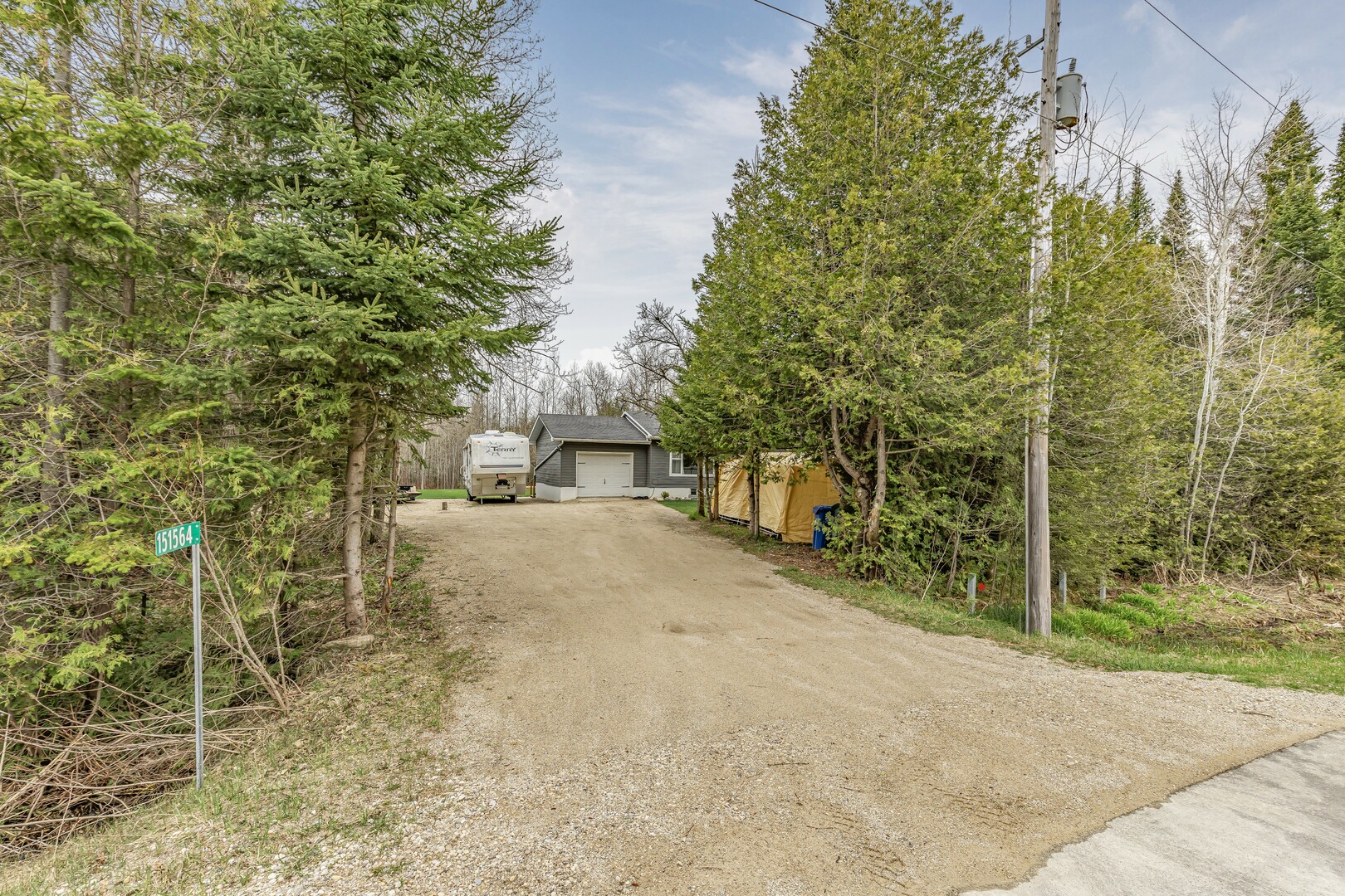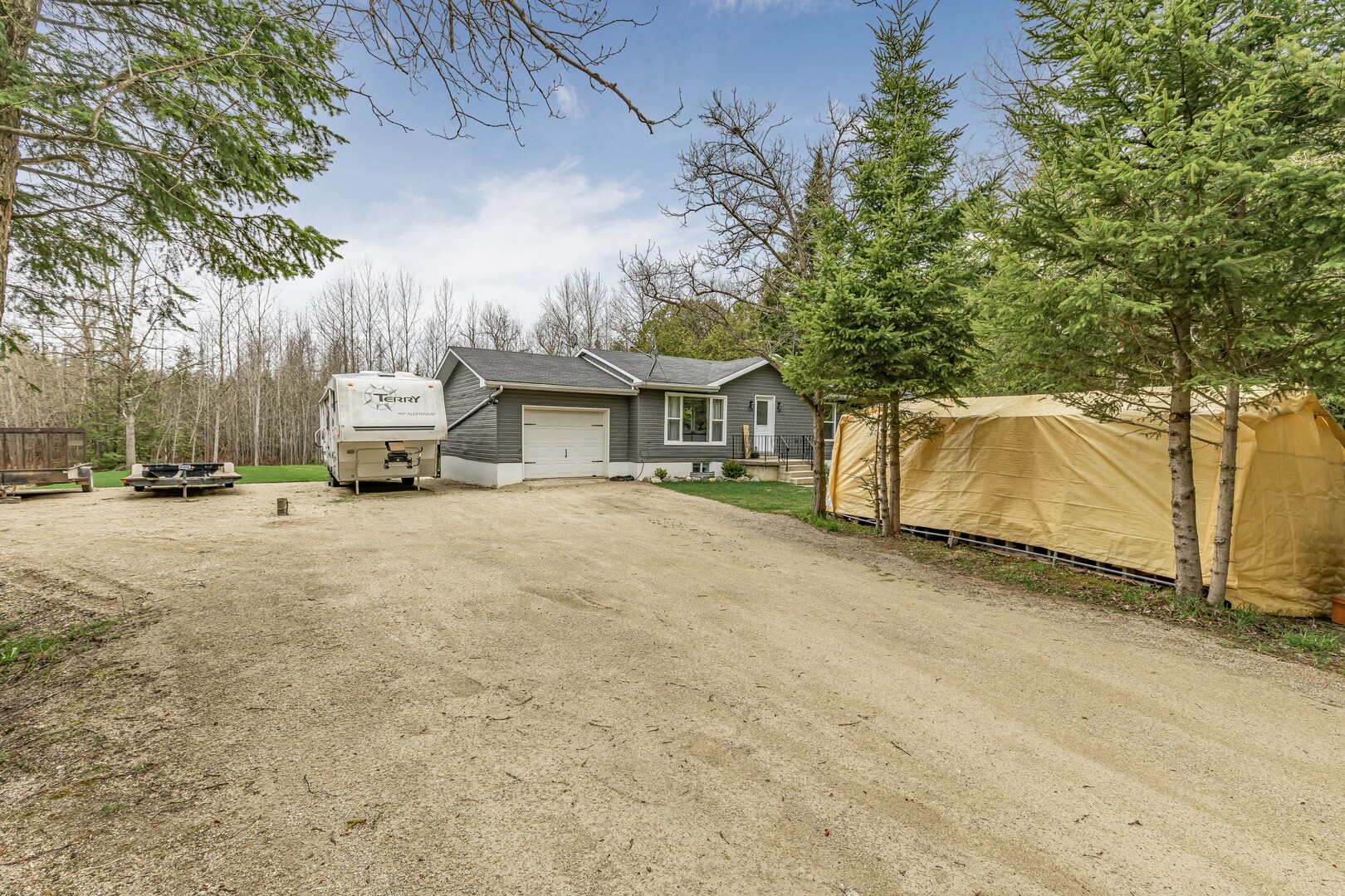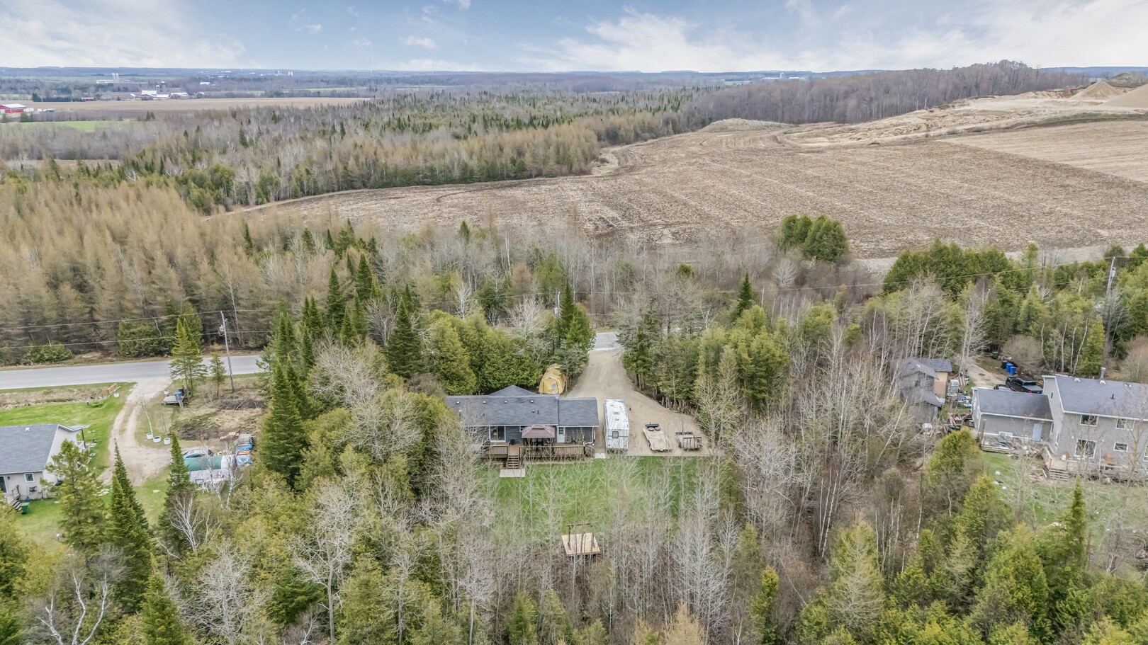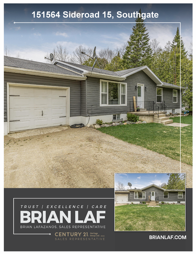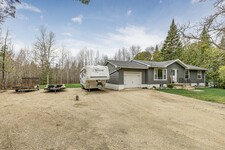 Nestled in a scenic area of beautiful farms, this updated home sits on a 203ft x 219ft lot surrounded by mature trees for ultimate privacy. Located on a paved road, it offers ample parking for vehicles and trailers, plus a 13ft x 23ft attached garage with 9ft ceilings and a walkout to the 36ft x 10ft west-facing deck—perfect for enjoying sunsets.