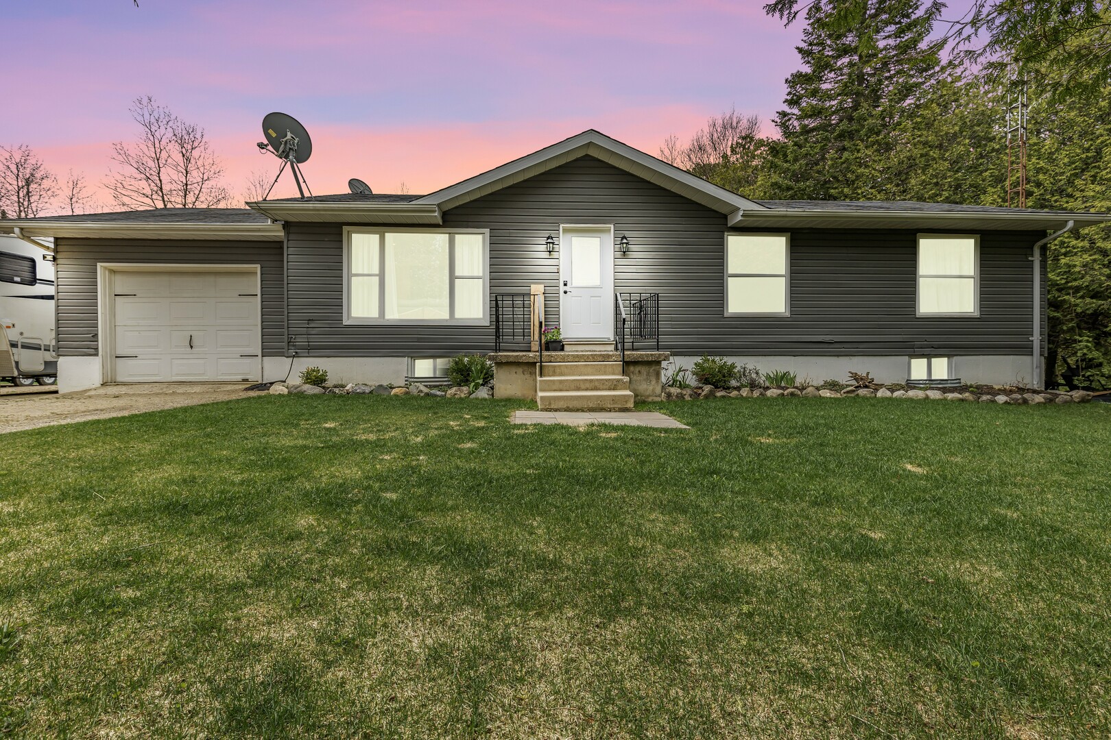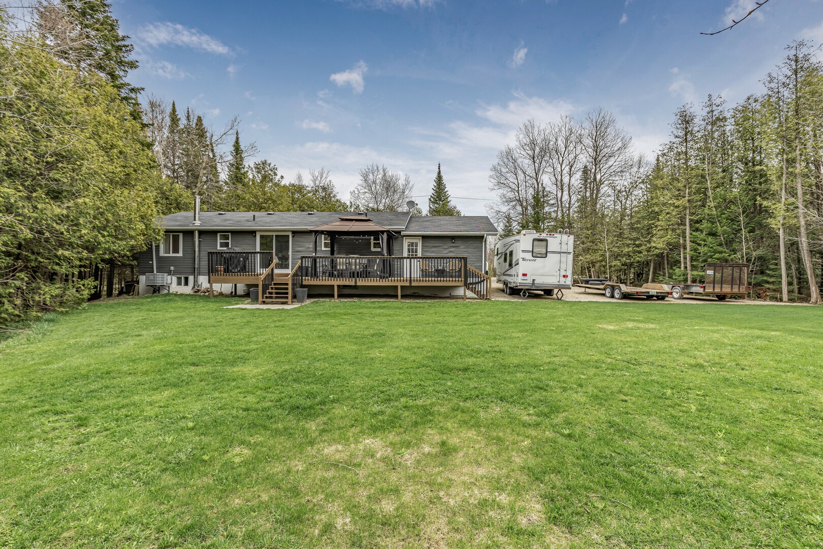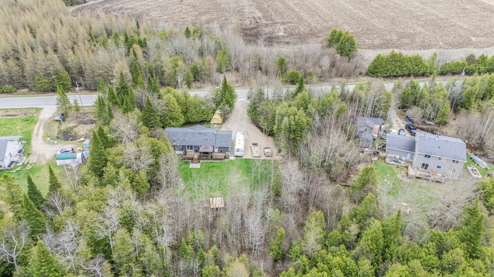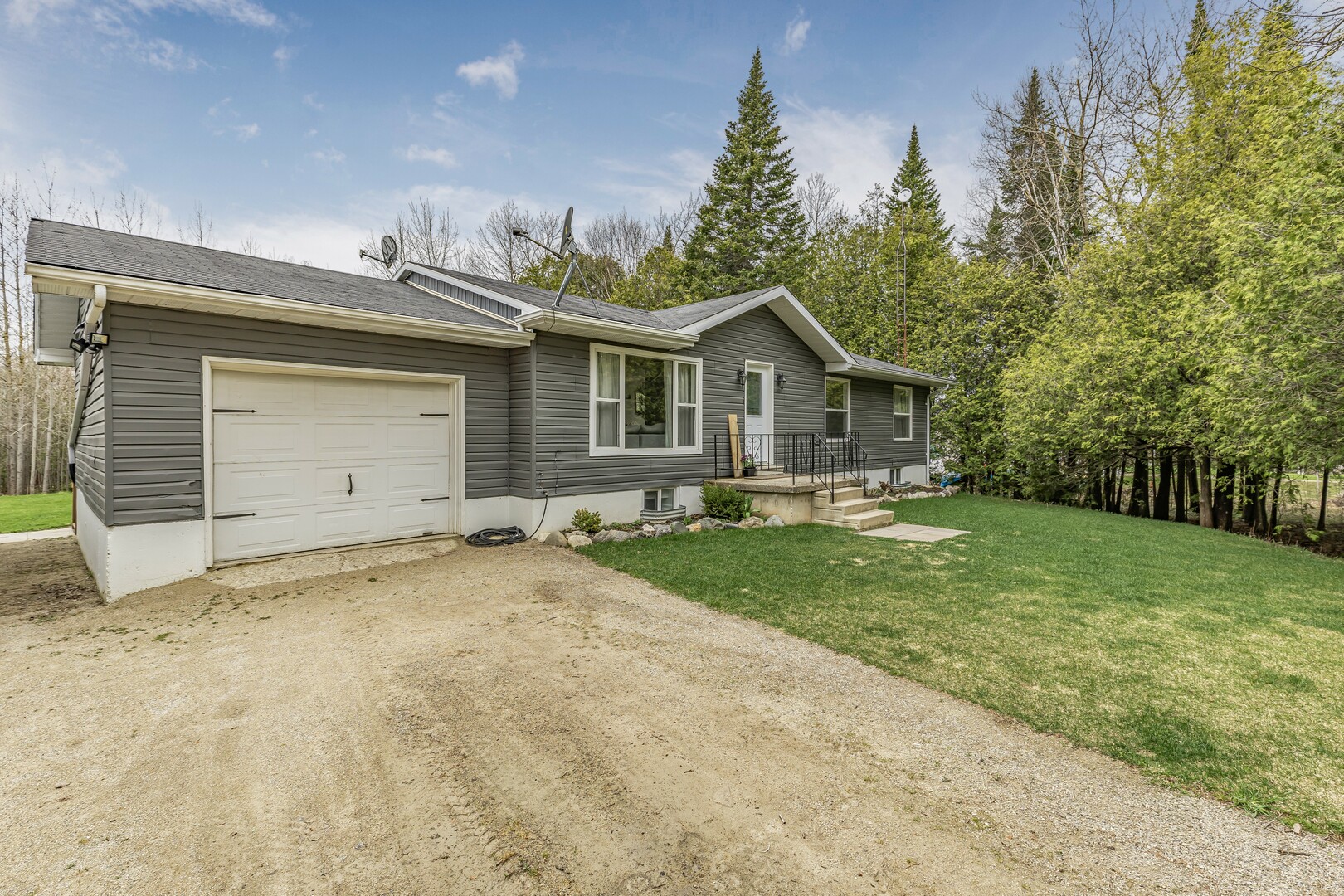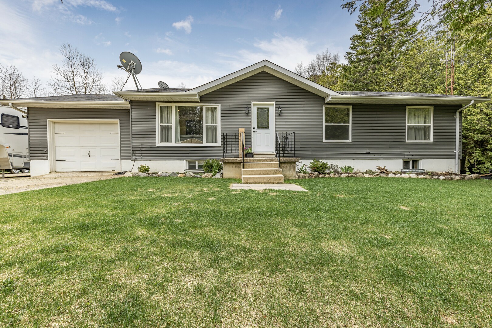Nestled in a scenic area of beautiful farms, this updated home sits on a 203ft x 219ft lot surrounded by mature trees for ultimate privacy. Located on a paved road, it offers ample parking for vehicles and trailers, plus a 13ft x 23ft attached garage with 9ft ceilings and a walkout to the 36ft x 10ft west-facing deck—perfect for enjoying sunsets.