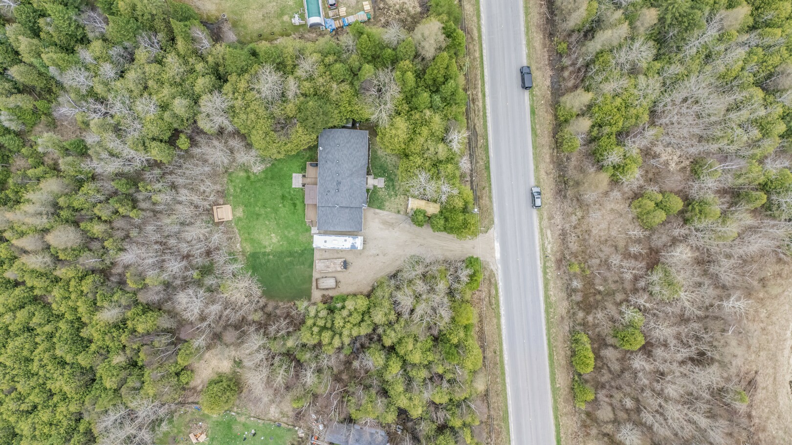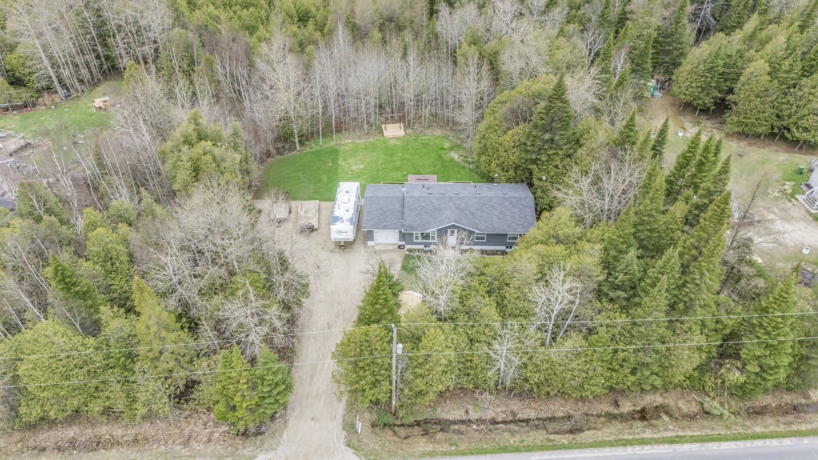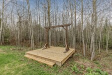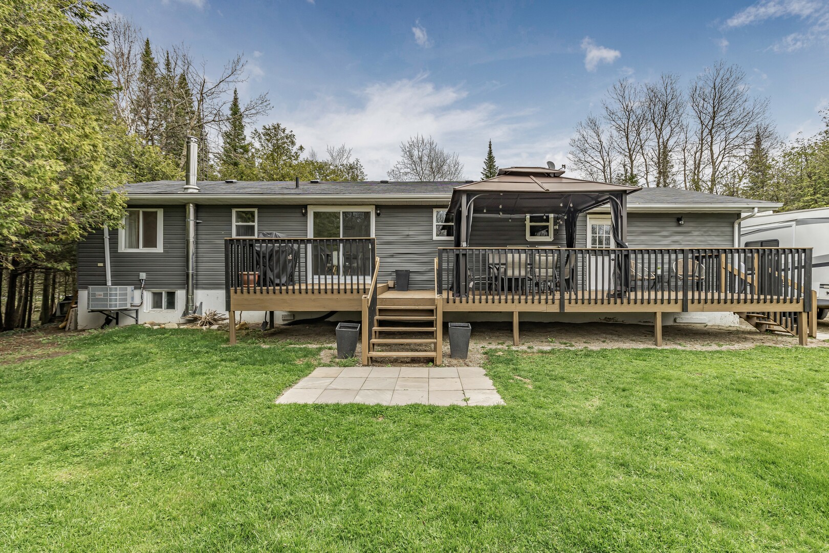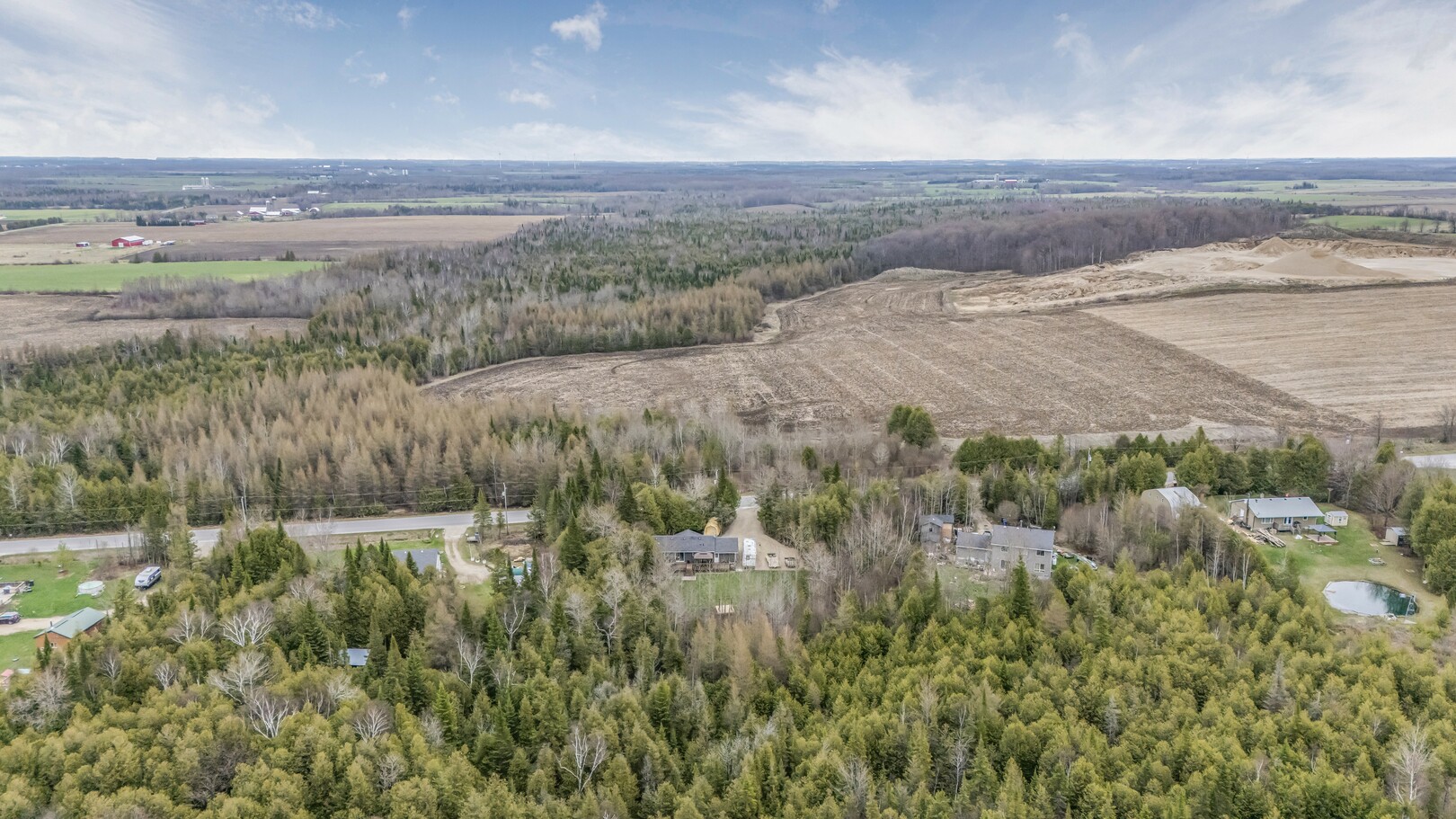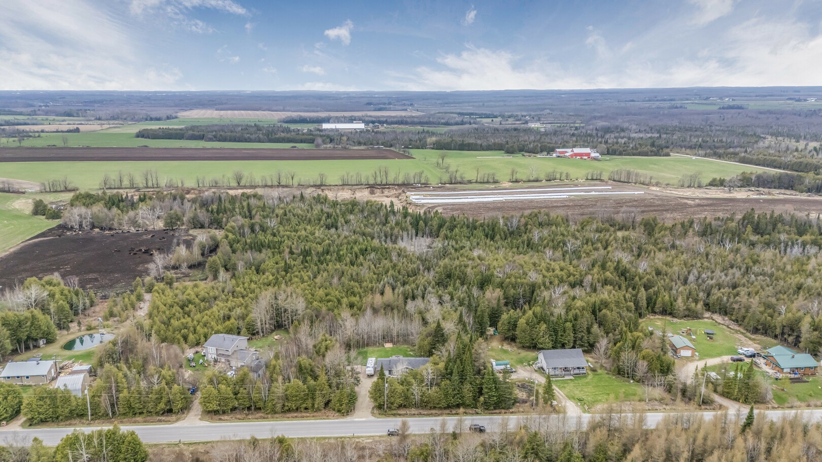 Nestled in a scenic area of beautiful farms, this updated home sits on a 203ft x 219ft lot surrounded by mature trees for ultimate privacy. Located on a paved road, it offers ample parking for vehicles and trailers, plus a 13ft x 23ft attached garage with 9ft ceilings and a walkout to the 36ft x 10ft west-facing deck—perfect for enjoying sunsets.
