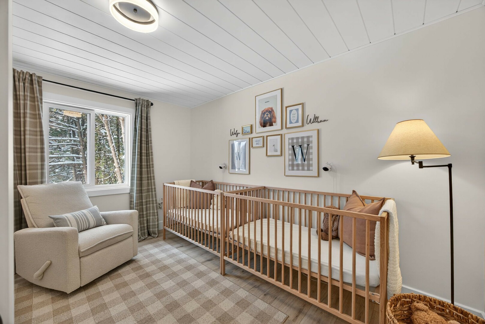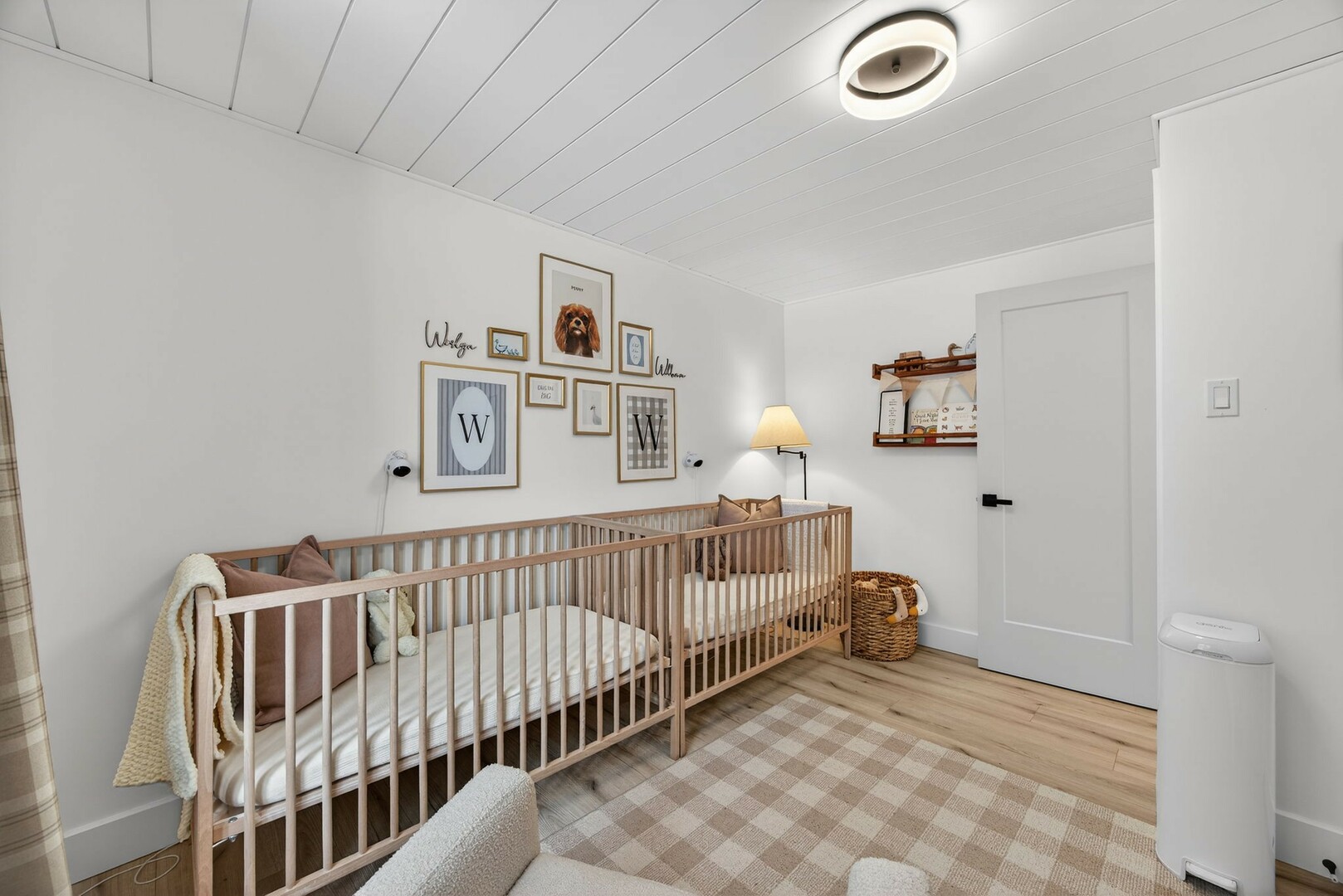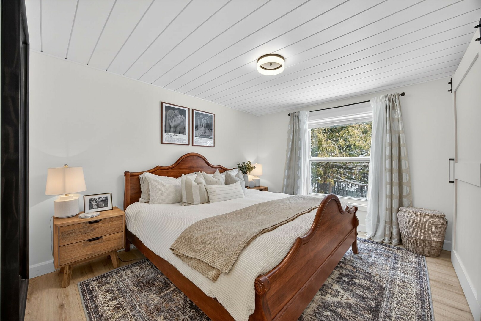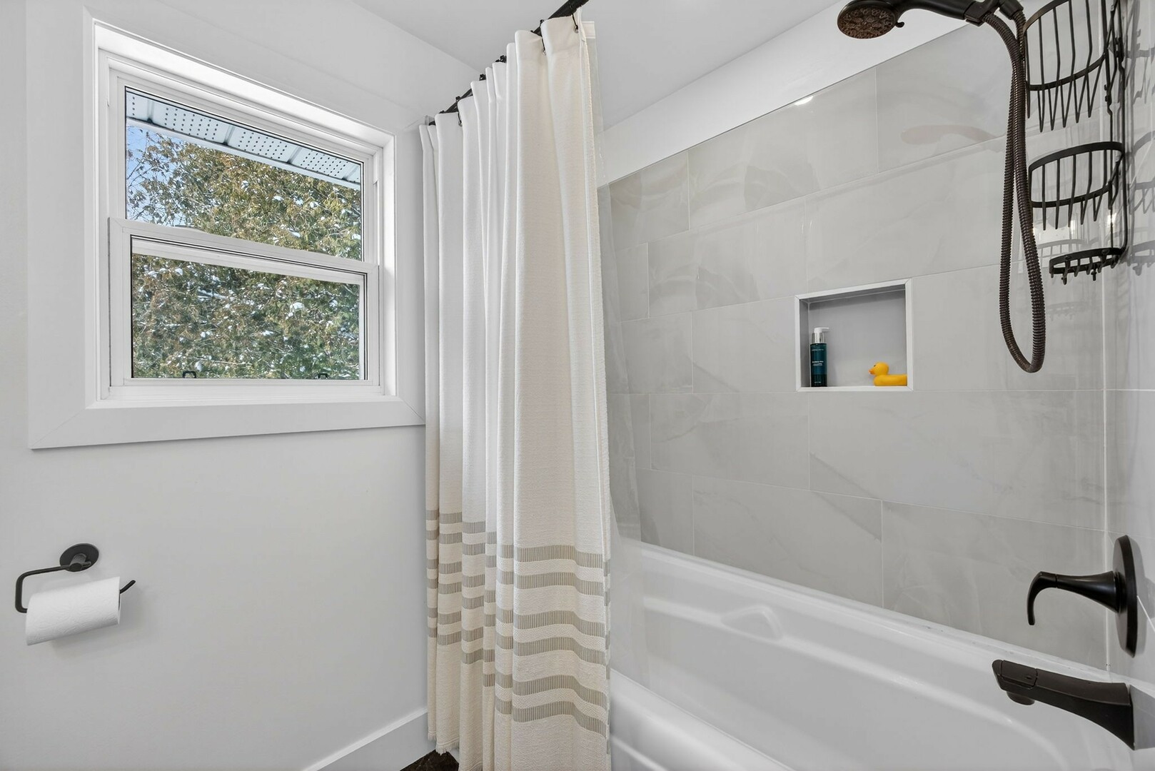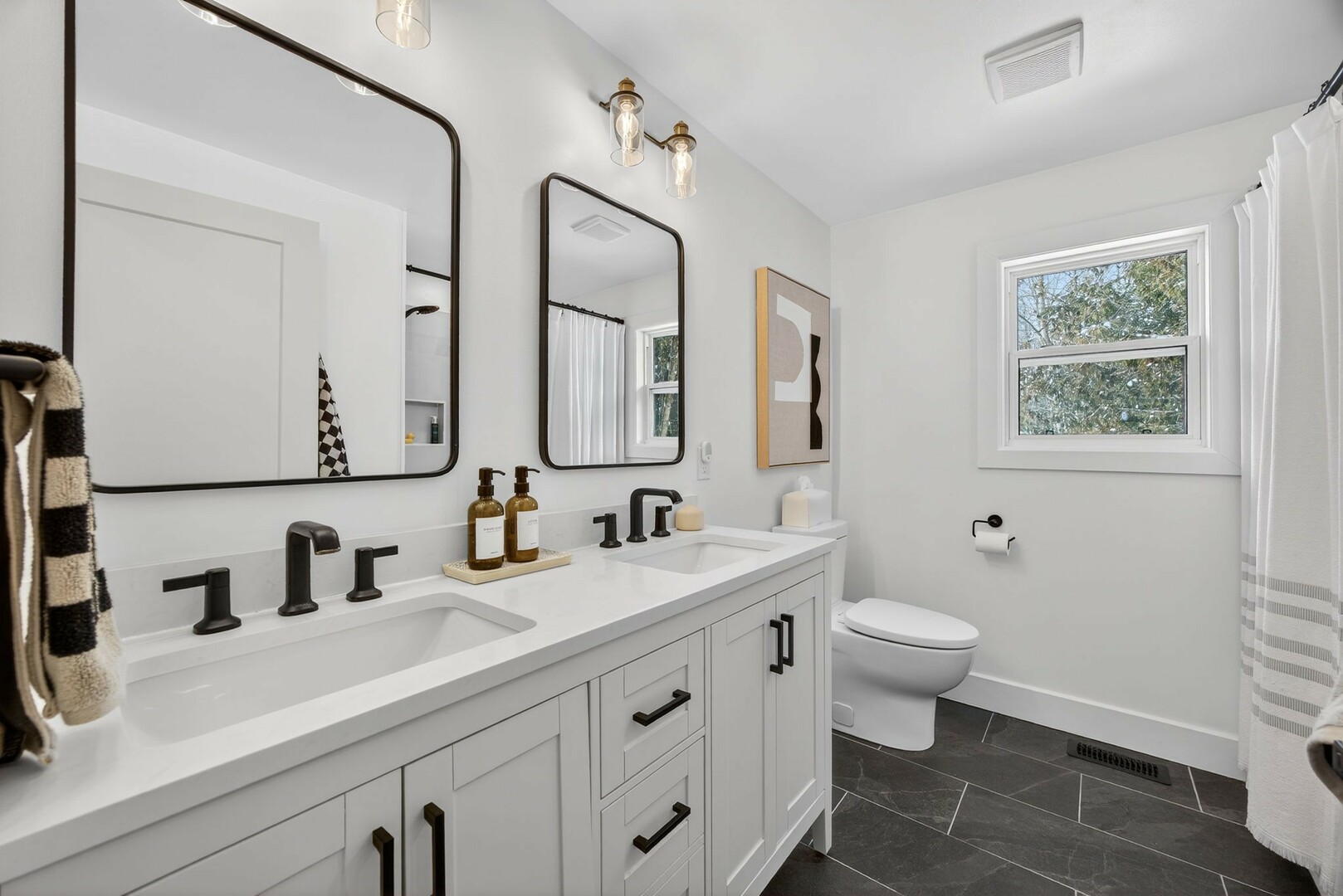 The main bathroom features a custom tiled shower and a double-sink vanity, while the bedrooms offer large windows, generous closets, and excellent natural light. A convenient powder room completes the main level.