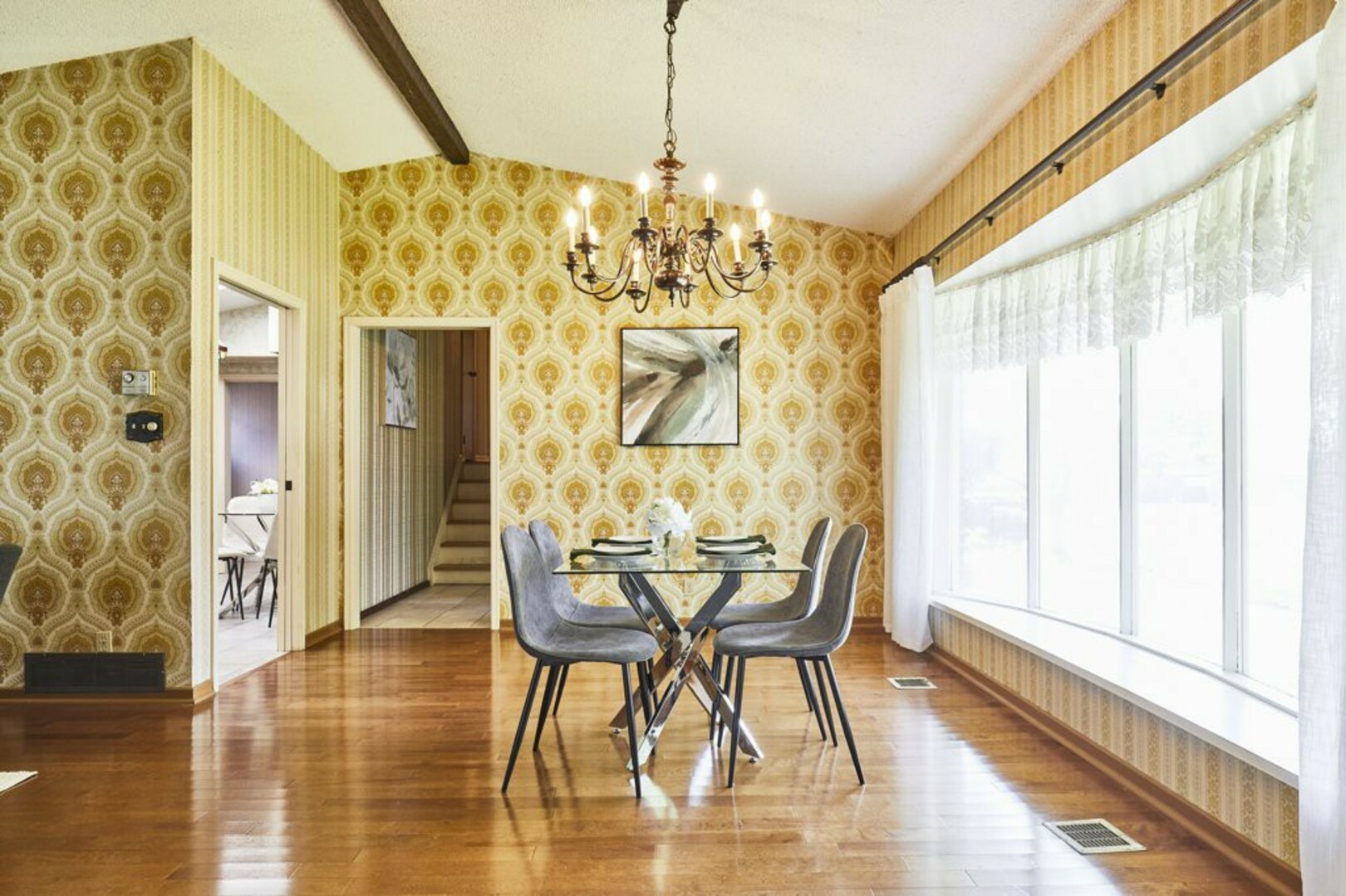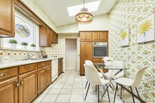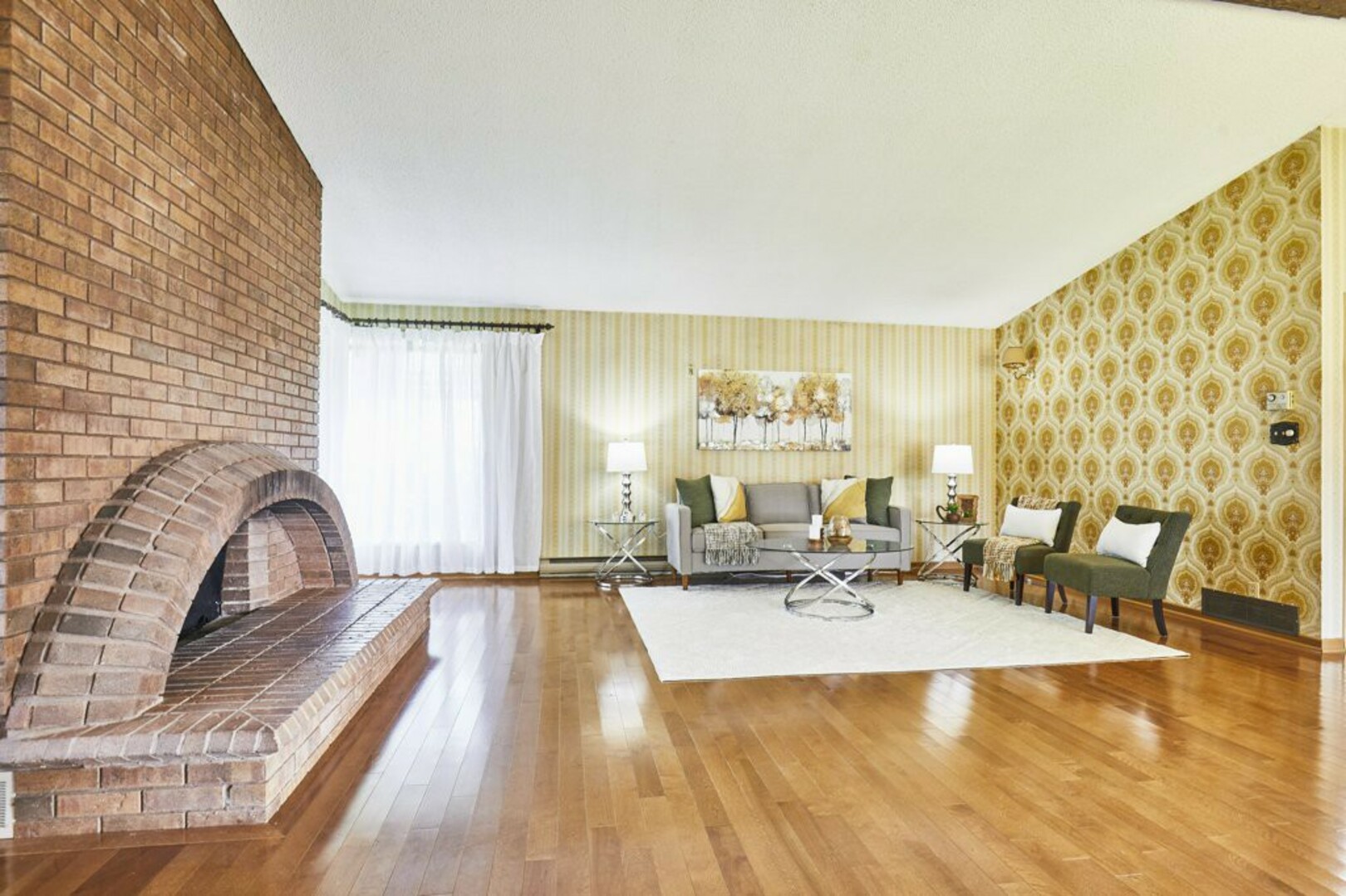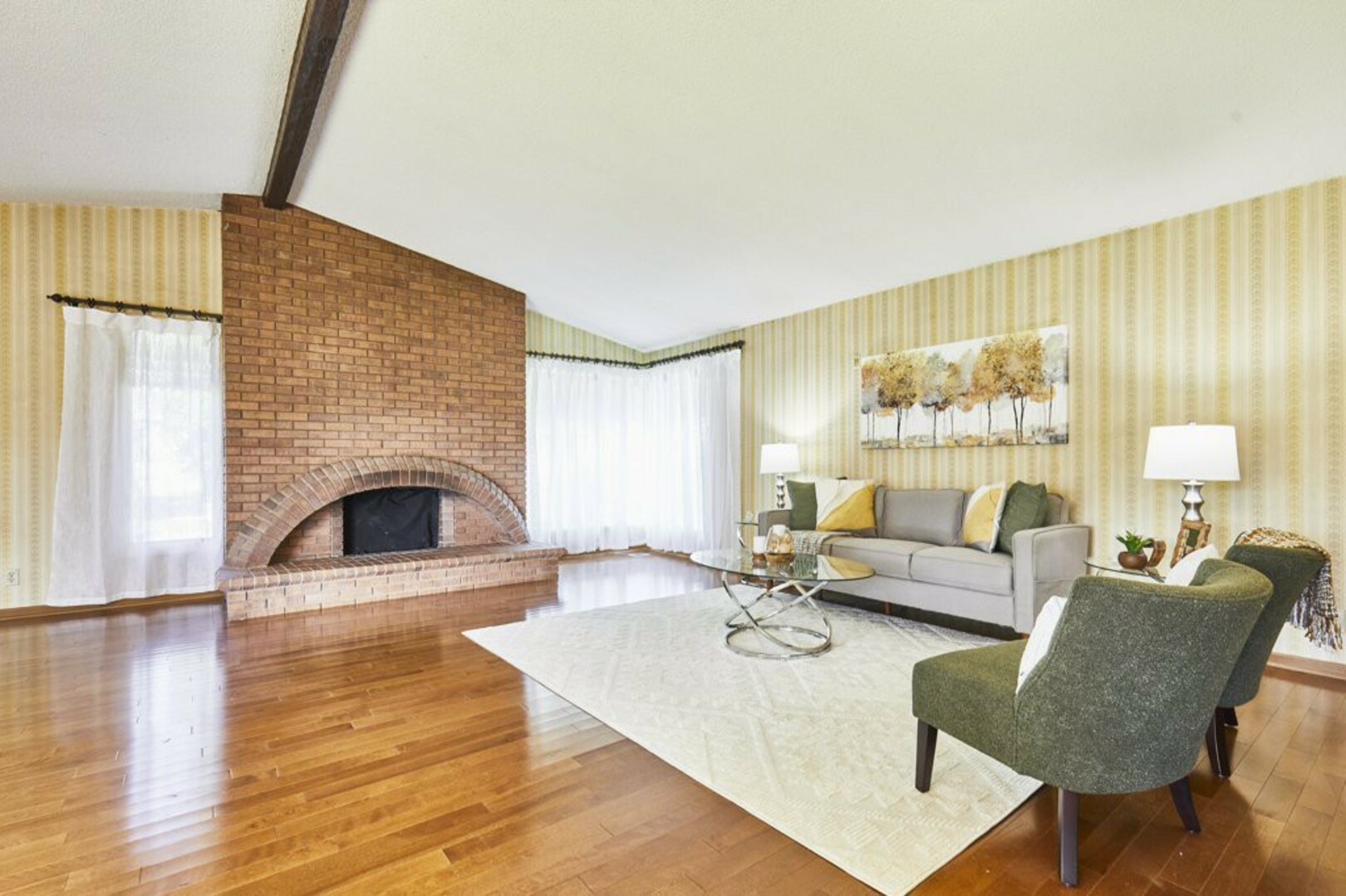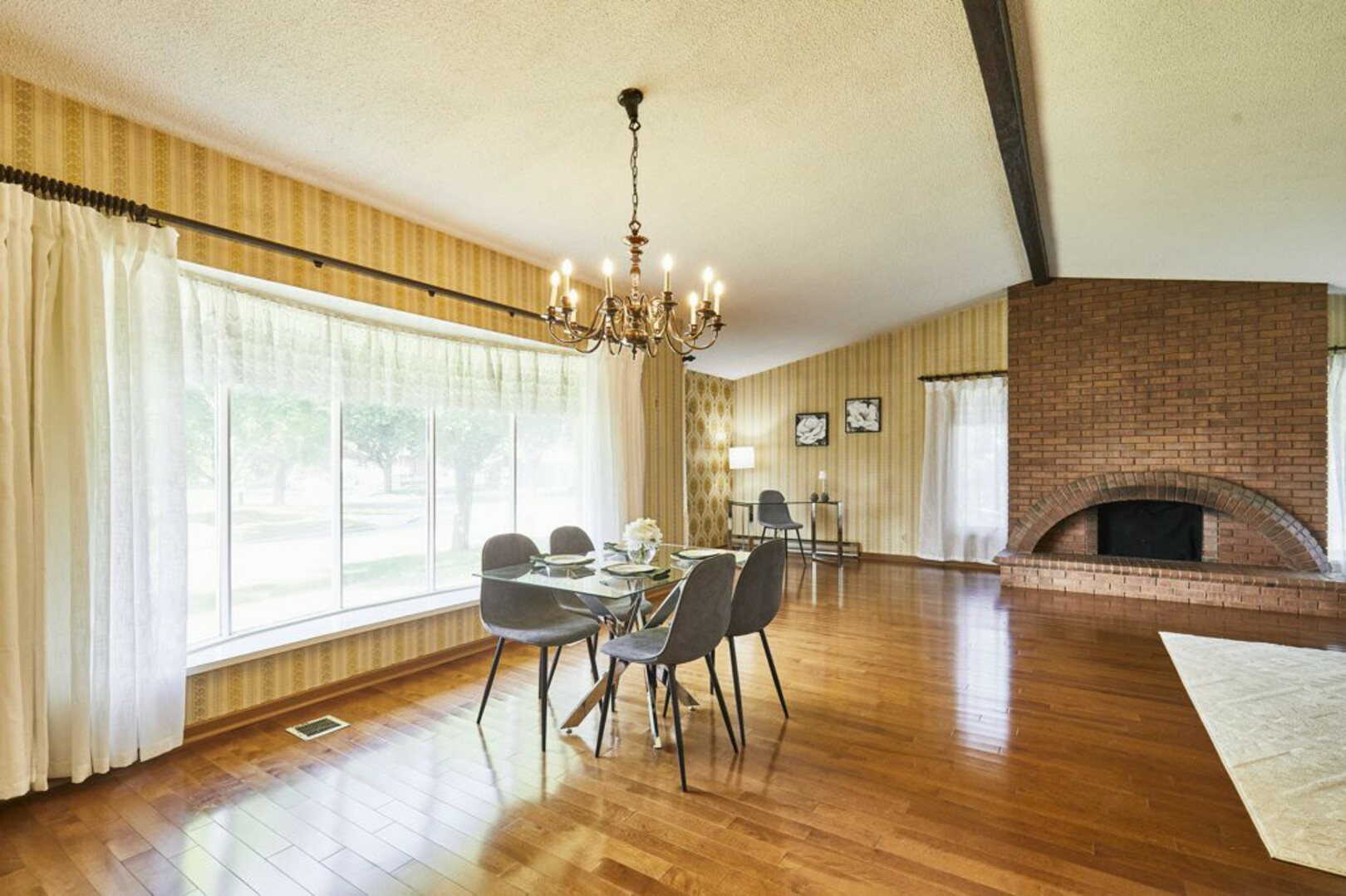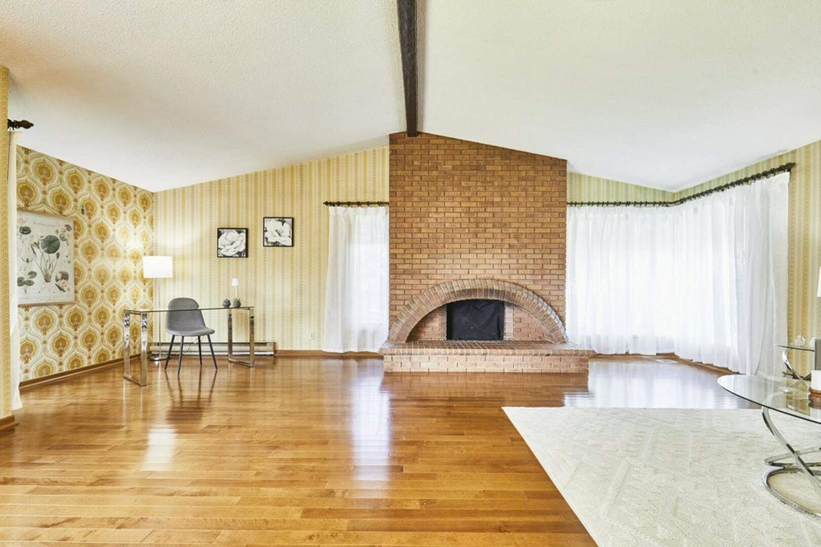 With 5 spacious bedrooms and 2 bathrooms, this residence offers an impressive 2,103 square feet of above-grade living space. The main floor showcases a breathtaking open-concept great room featuring gleaming hardwood floors, soaring vaulted ceilings, and a striking floor-to-ceiling oversized brick wood-burning fireplace. This versatile space combines the living room, dining area, and an optional home office nook—perfect for today's lifestyle. The bright and spacious eat-in kitchen is equipped with tiled floors, high ceilings, and a skylight, adding to the home’s charm. A separate side entrance to the basement is conveniently located just off the kitchen.
