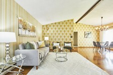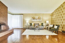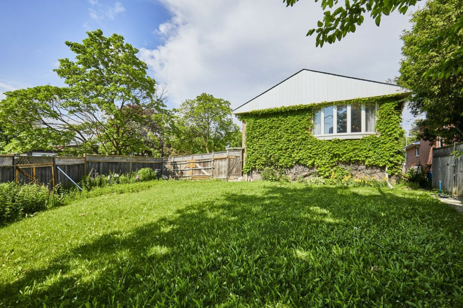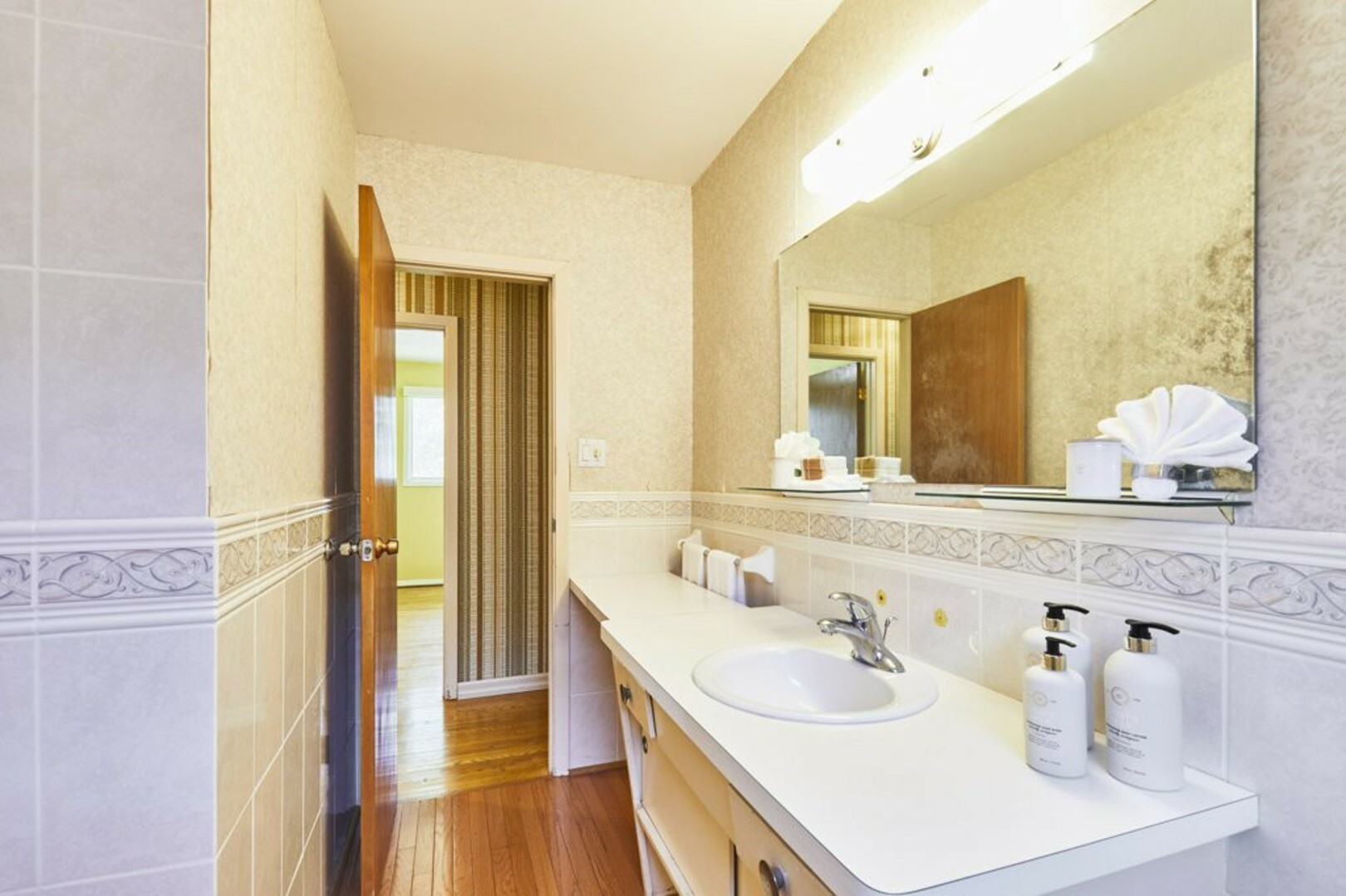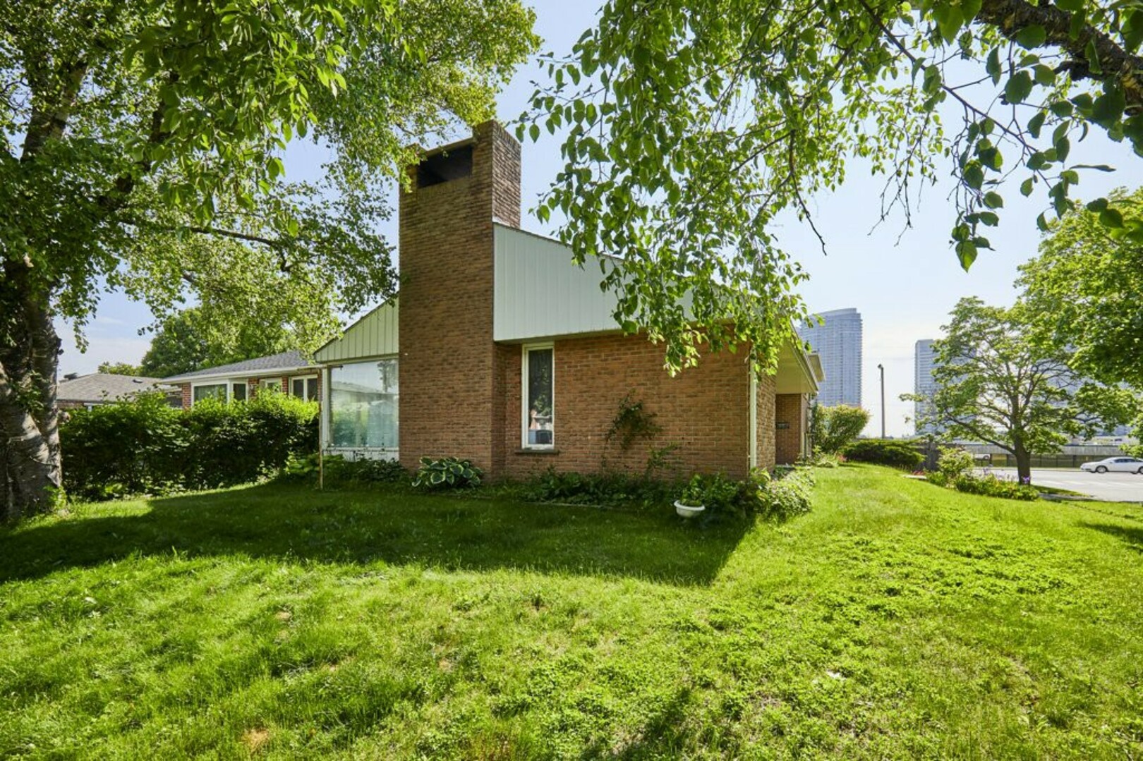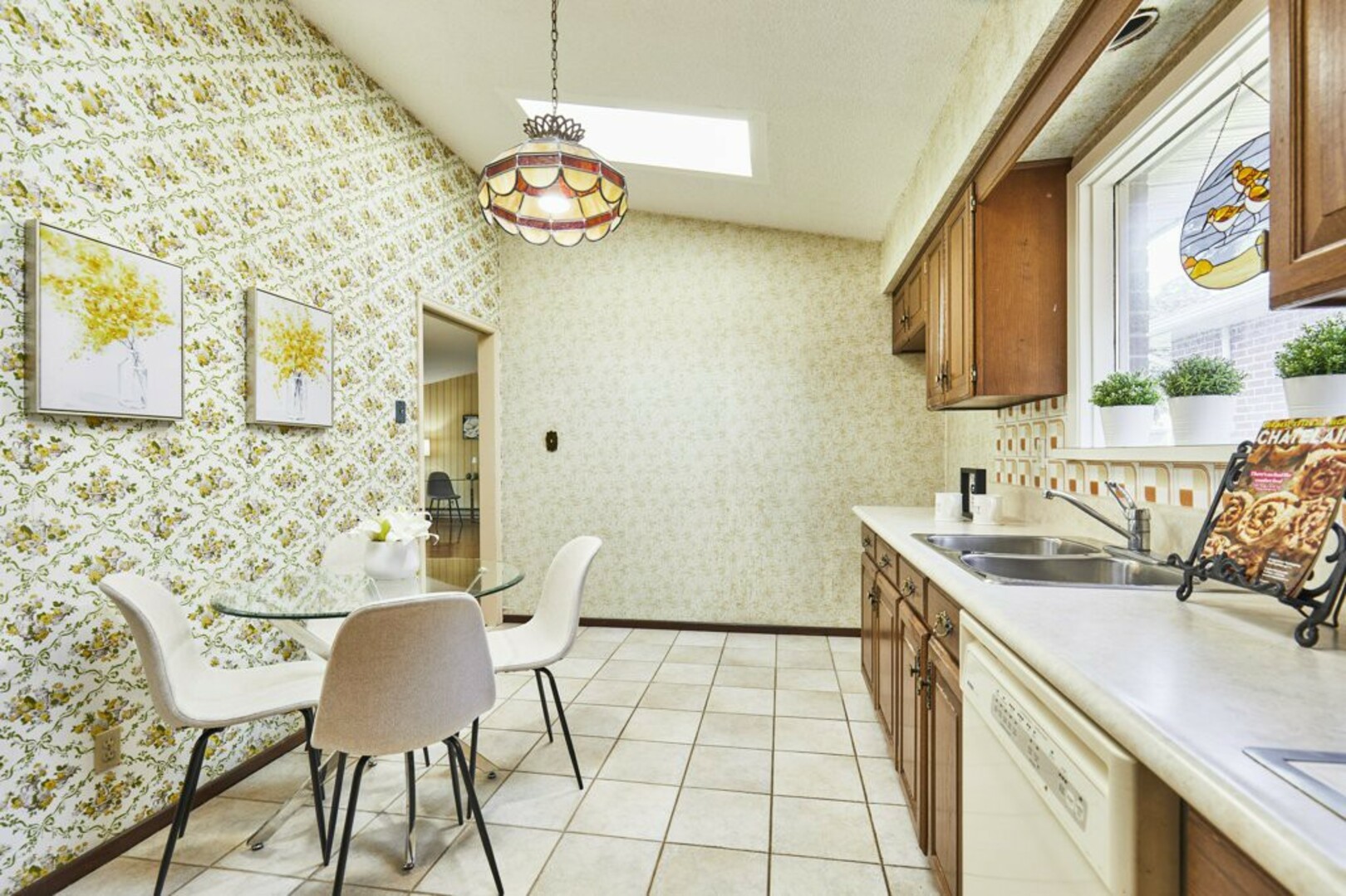 With 5 spacious bedrooms and 2 bathrooms, this residence offers an impressive 2,103 square feet of above-grade living space. The main floor showcases a breathtaking open-concept great room featuring gleaming hardwood floors, soaring vaulted ceilings, and a striking floor-to-ceiling oversized brick wood-burning fireplace. This versatile space combines the living room, dining area, and an optional home office nook—perfect for today's lifestyle. The bright and spacious eat-in kitchen is equipped with tiled floors, high ceilings, and a skylight, adding to the home’s charm. A separate side entrance to the basement is conveniently located just off the kitchen.
