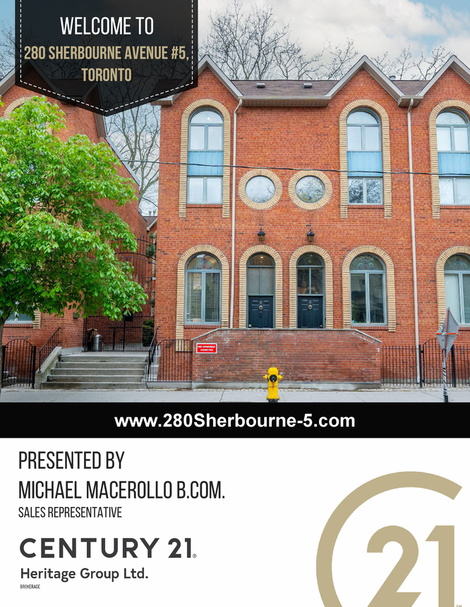 Welcome to Suite 5 at 280 Sherbourne Ave. A Rare Urban Oasis in the Heart of Downtown. Exceptional Value at $1,049,000 just $595 per sq ft.This stunning 1,764 sq ft multi-level end-unit Victorian townhome, offered at an unbelievable price. Tucked quietly within an exclusive, well managed 18-unit condo community, this hidden gem is nestled in a peaceful courtyard surrounded by mature trees and tiered stone pathways. A rare retreat in the middle of the city. Drenched in natural light, this home is perfect for entertaining or serene everyday living. The chef-inspired kitchen impresses with soaring ceilings, expansive quartz counters, and sleek modern fnishes. Elegant glass railings, a cozy wood-burning freplace, and authentic stained glass windows blend style with character. A dramatic wall of windows opens onto your private 285 sq ft backyard terrace; a lush garden space ideal for outdoor dining and relaxation. Upstairs, you'll find two generous bedrooms with spaciious closets, while the top-floor primary suite is a true sanctuary with a 5-piece ensuite, walk-in closet, and tranquil treetop balcony. Leave the car behind with a near-perfect 97 Walk Score and excellent transit access, you're minutes to College Station, the Dundas streetcar, and multiple bus routes.Steps to Bay Street, St. Michaels Hospital, the Eaton Centre, Distillery District, St. Lawrence Market, Toronto Metropolitan University, George Brown College, and more. A rare opportunity to own a downtown freehold-style space at a condo price. This is sophisticated urban living without compromise.