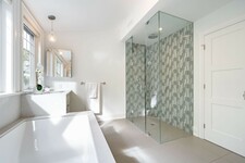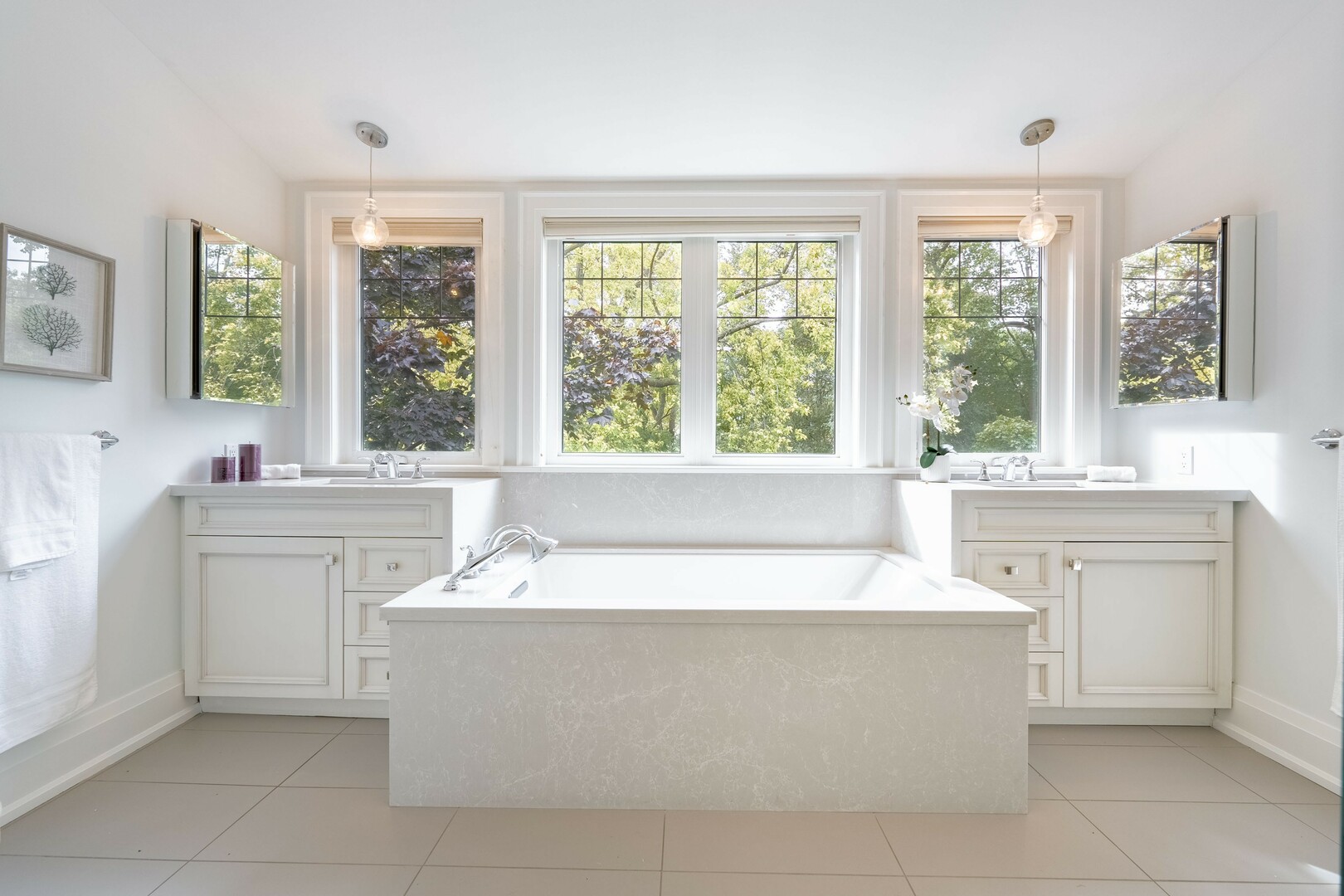 a luxurious ensuite featuring Kohler fixtures, quartz countertops, heated floors, and a serene