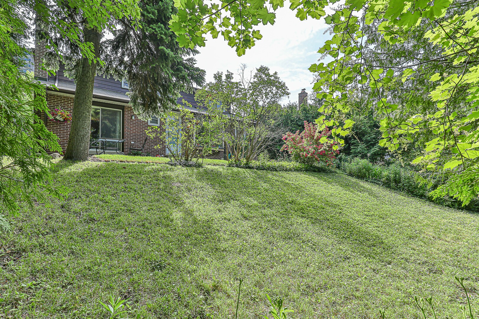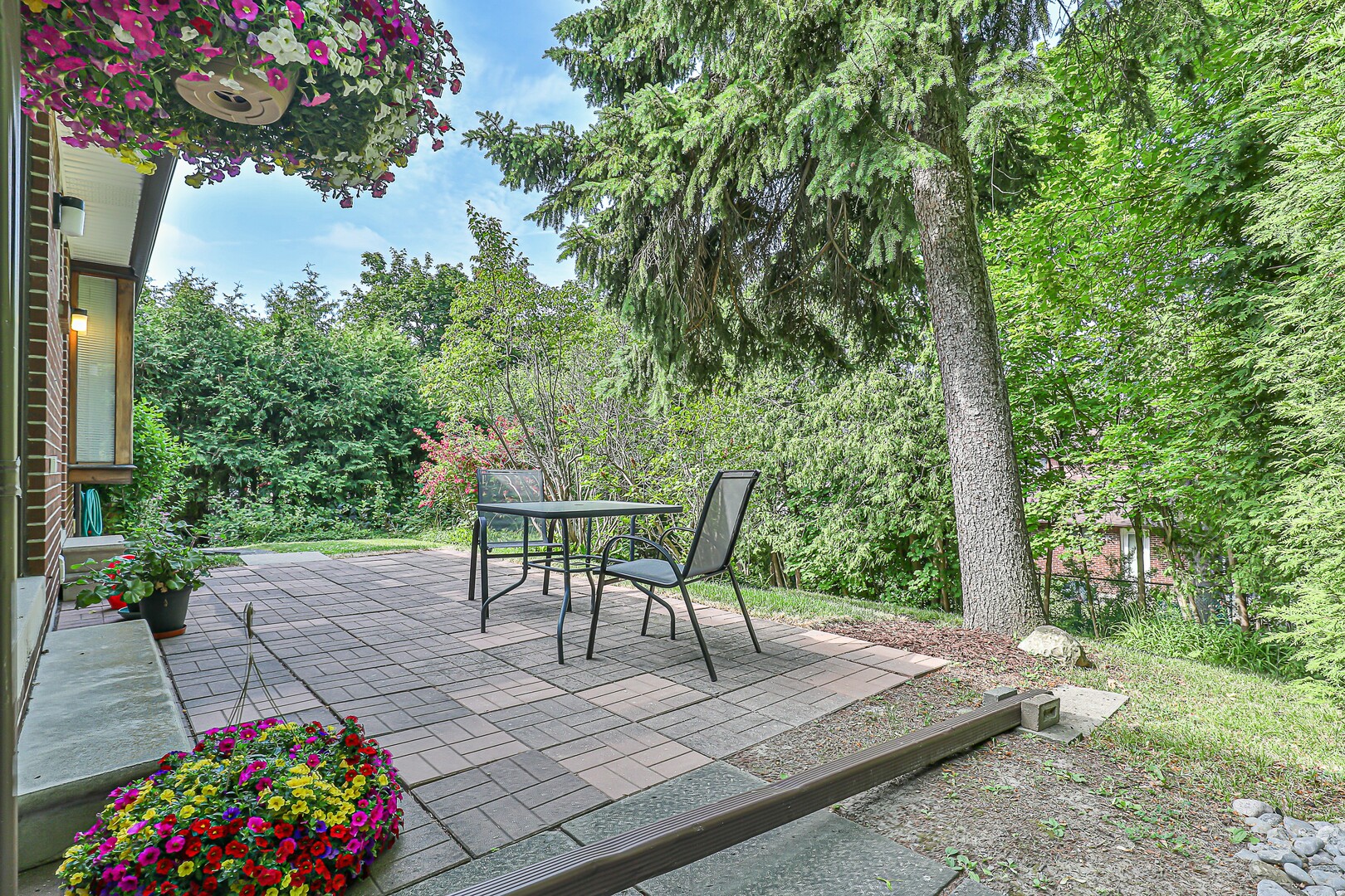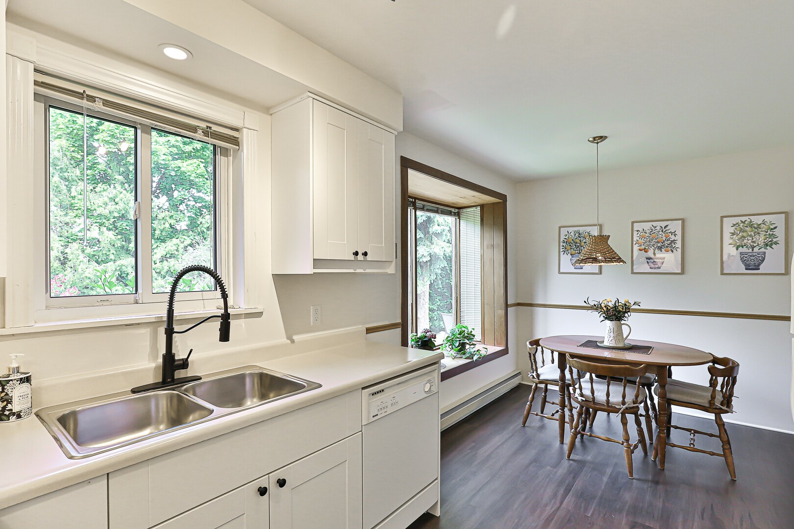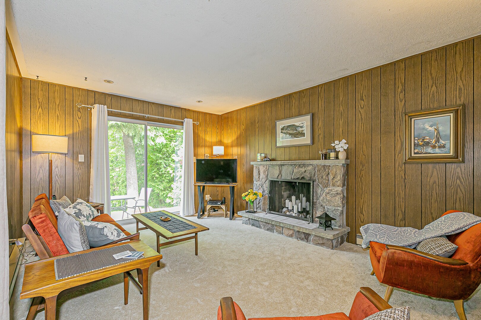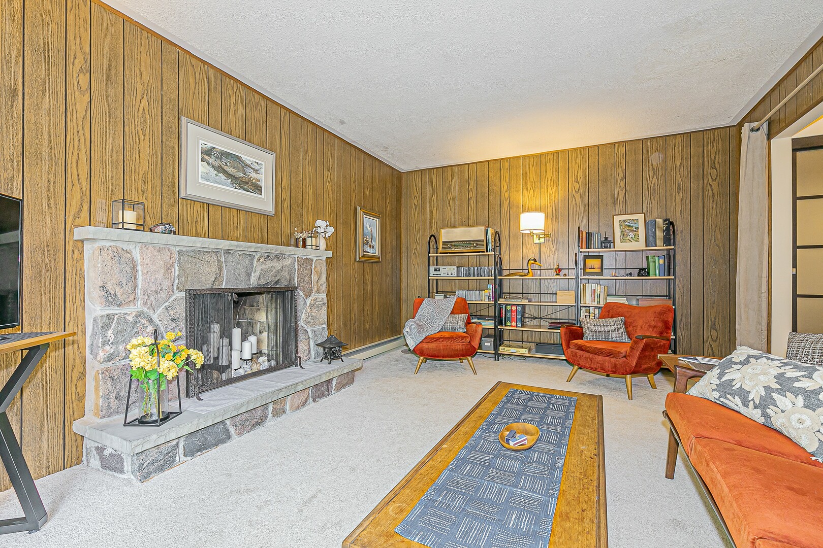 The family-sized kitchen is well-equipped with abundant cabinetry, a double sink, ample counter space, pantry, two windows, new flooring, and an eat-in area—ideal for everyday meals. Adjacent to the kitchen is a cozy family room with a wood-burning fireplace and sliding glass doors leading to a private backyard patio. A second walk-out and a convenient 2-piece powder room offer added accessibility. The stone patio is perfect for outdoor entertaining, and the landscaping ensures privacy.