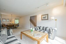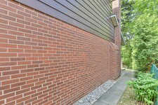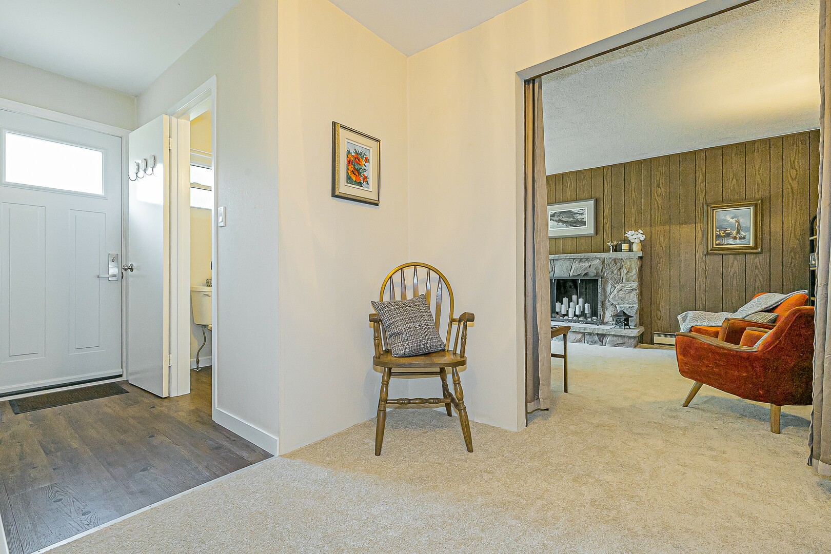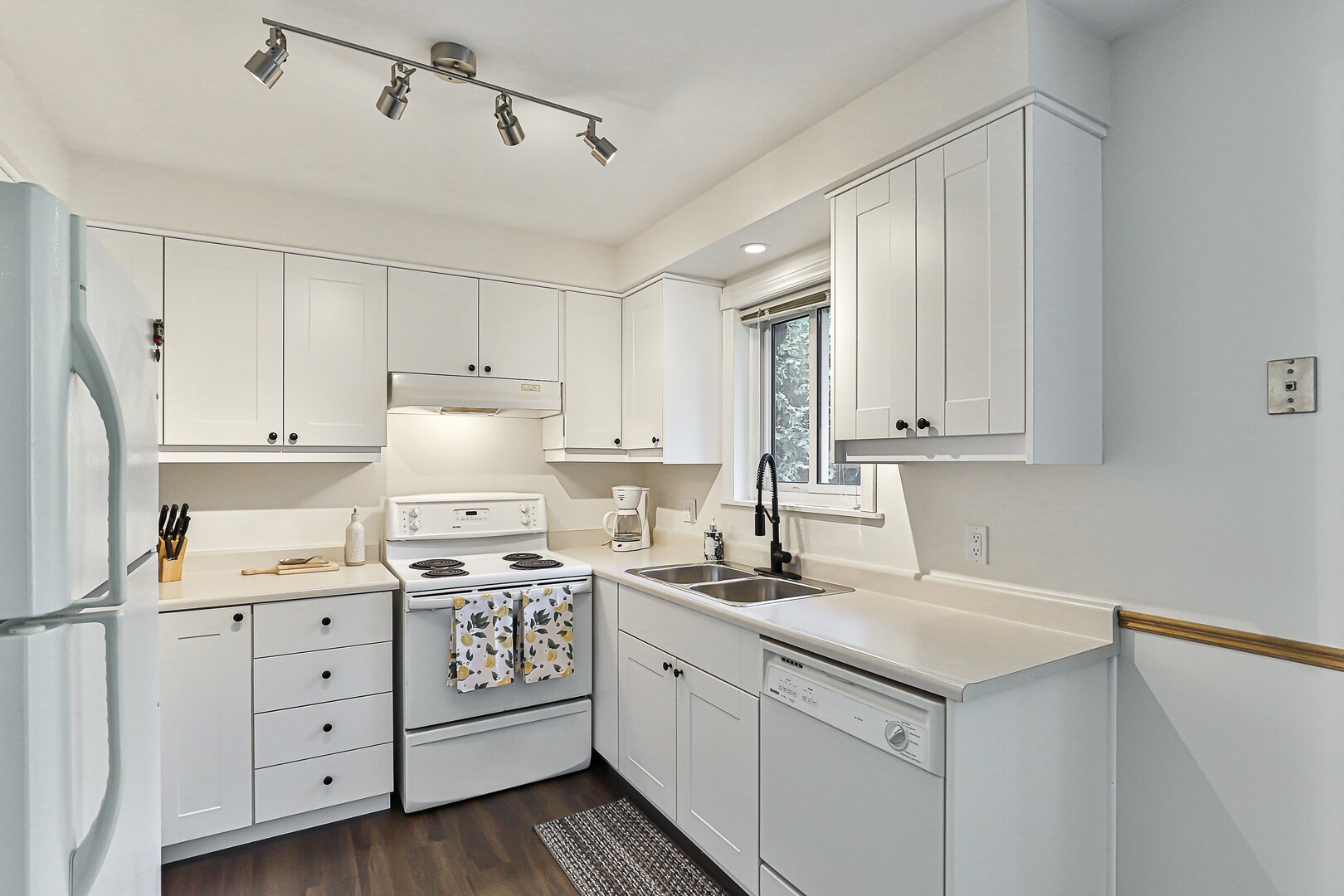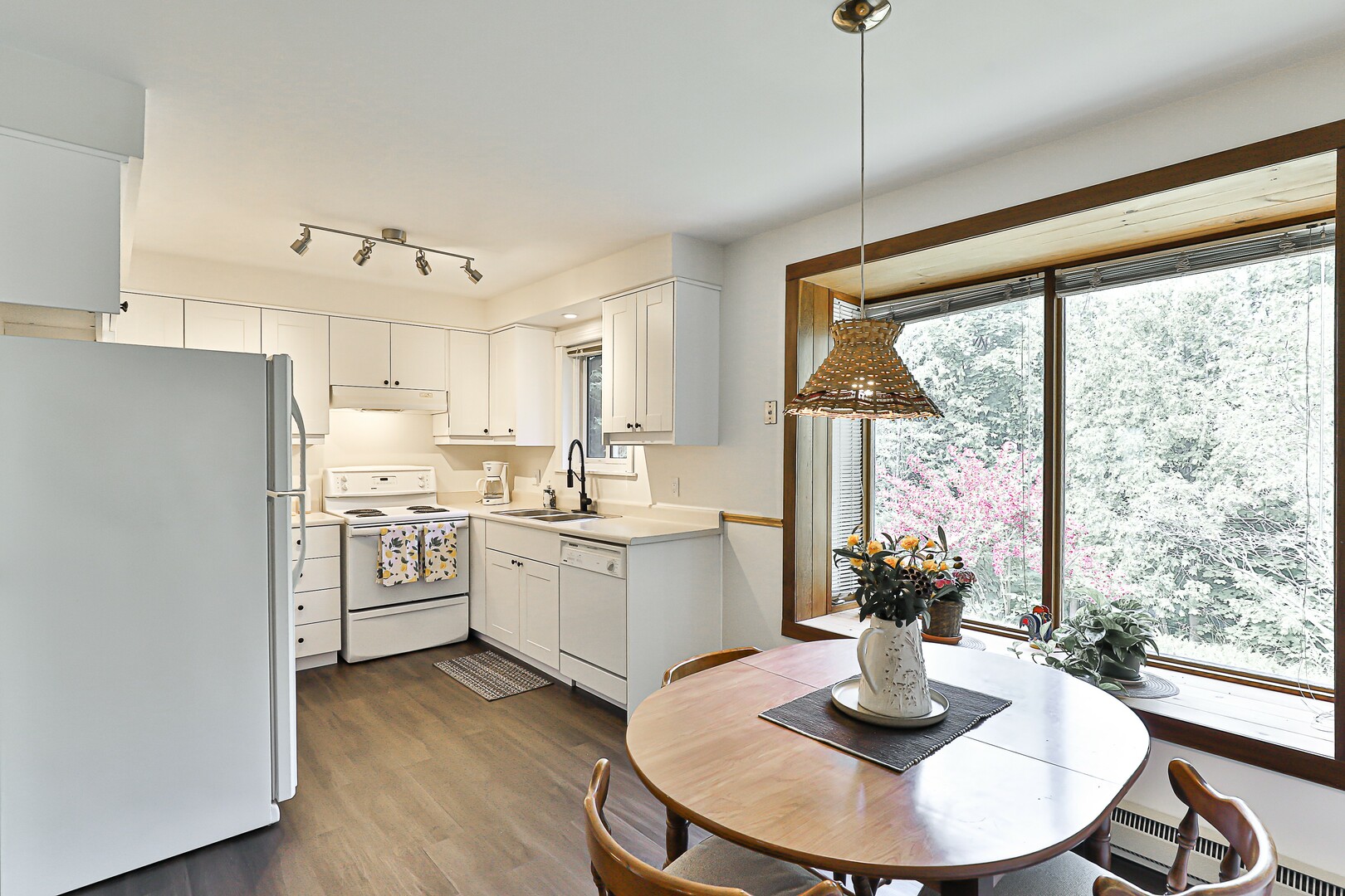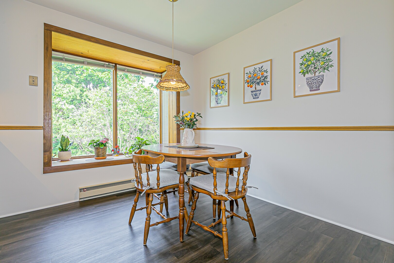 The family-sized kitchen is well-equipped with abundant cabinetry, a double sink, ample counter space, pantry, two windows, new flooring, and an eat-in area—ideal for everyday meals. Adjacent to the kitchen is a cozy family room with a wood-burning fireplace and sliding glass doors leading to a private backyard patio. A second walk-out and a convenient 2-piece powder room offer added accessibility. The stone patio is perfect for outdoor entertaining, and the landscaping ensures privacy.