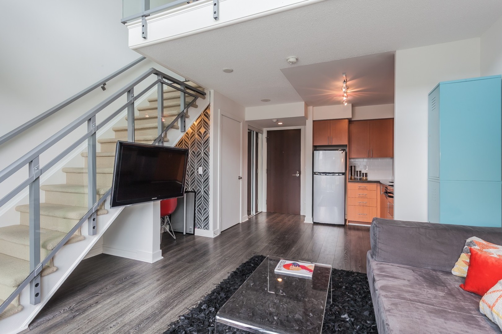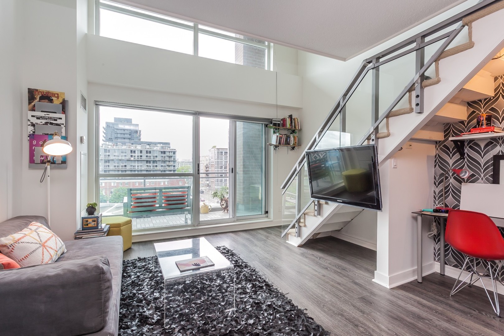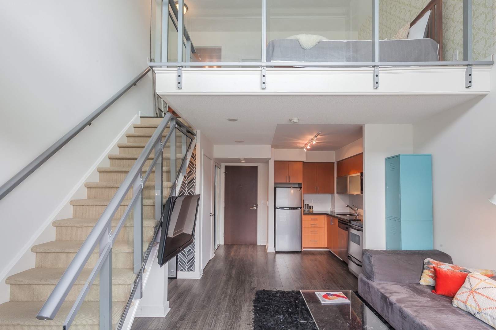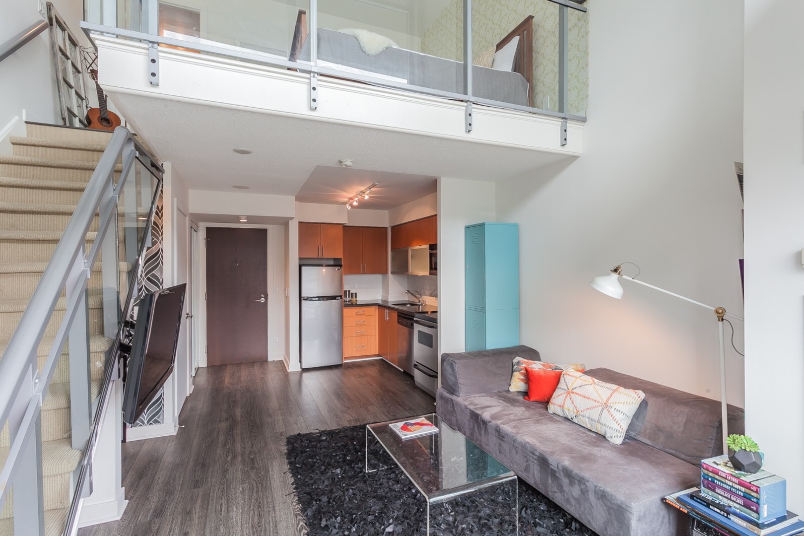 Live In The Heart Of Liberty Village! This Hard To Find Sun Filled Modern 2 Story Loft Has Sleek, Clean Finishes With A Great View Through Large Windows. Master W/I Closet, W/4Pc Ensuite. Lofted Bdrm Overlooking The Main Floor. Wall-To-Wall Balcony Great For Entertaining. Creative Space Underneath Stairs To Be Utilized As Your Own! Walking Distance To Shops, Lcbo, Restuarants/Cafes. King St. Car And All That The West Has To Offer! This Unit Is A Must See.