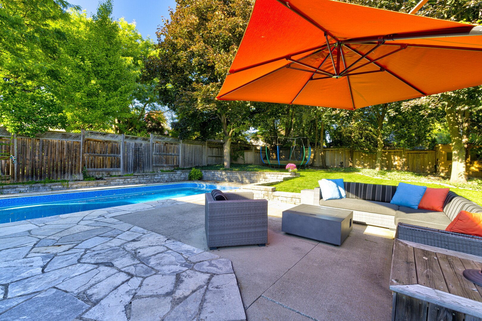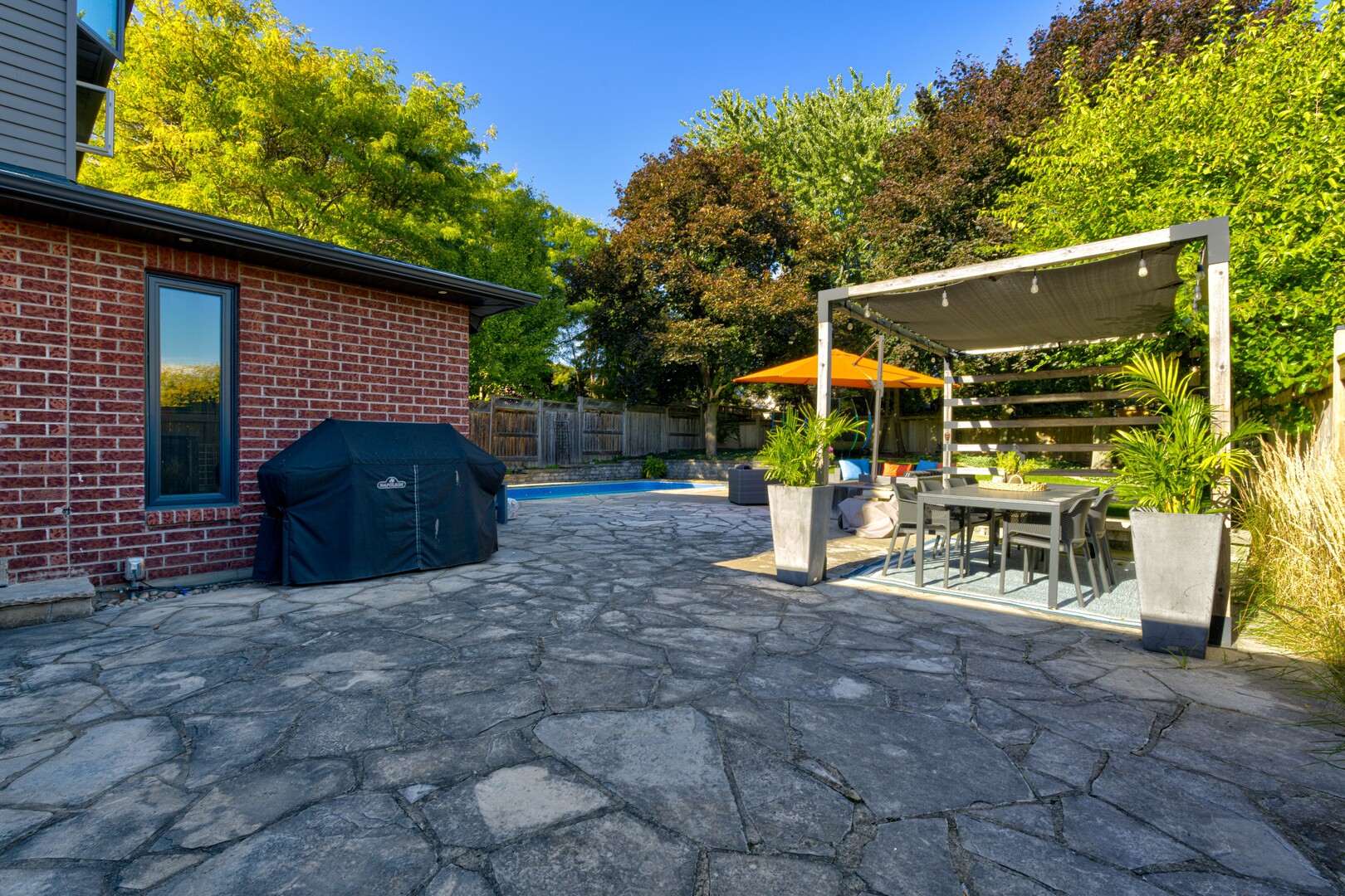 The fully finished basement (2024) with a separate side entrance adds tremendous versatility, featuring a wired home theatre with Dolby Atmos ceiling speakers, speaker hardwired to outdoors, a stylish rec room with built-in PAX storage, a home gym area, and powder room. Every detail has been carefully updated: all windows and doors replaced in 2024 (except backyard walkouts), garage ceiling spray-foamed for superior insulation, freshly painted siding/soffits, 200-amp service, and a chimney brick rebuild with metal insert to name just a few. But the true showstopper lies outdoors—an expansive 59x150-foot professionally landscaped yard that feels like your own private resort. A pergola-covered dining area, natural gas hook of the a BBQ, saltwater pool with safety cover, large grassy play space complete with a "tree house", and a thoughtfully installed Rainbird irrigation system (with Rachio smart controller) make it effortless to relax, garden, or entertain. Whether hosting a summer BBQ, enjoying a late-night swim, or kicking off an impromptu soccer game, this space adapts to every lifestyle.