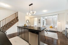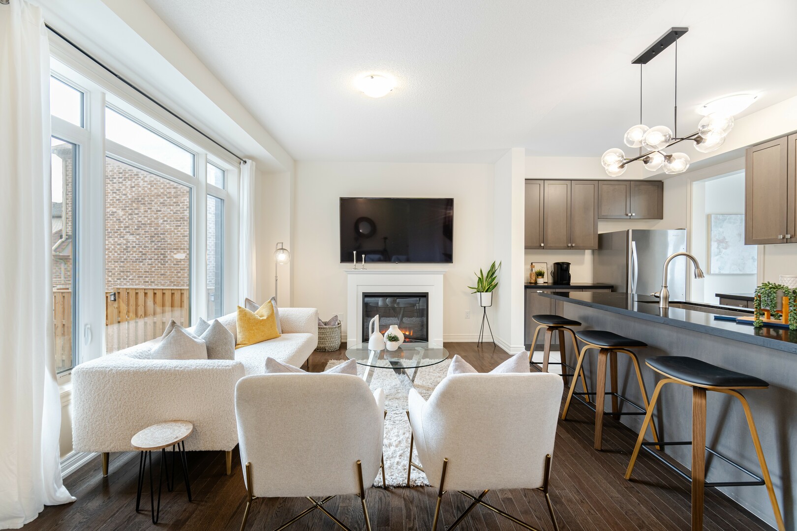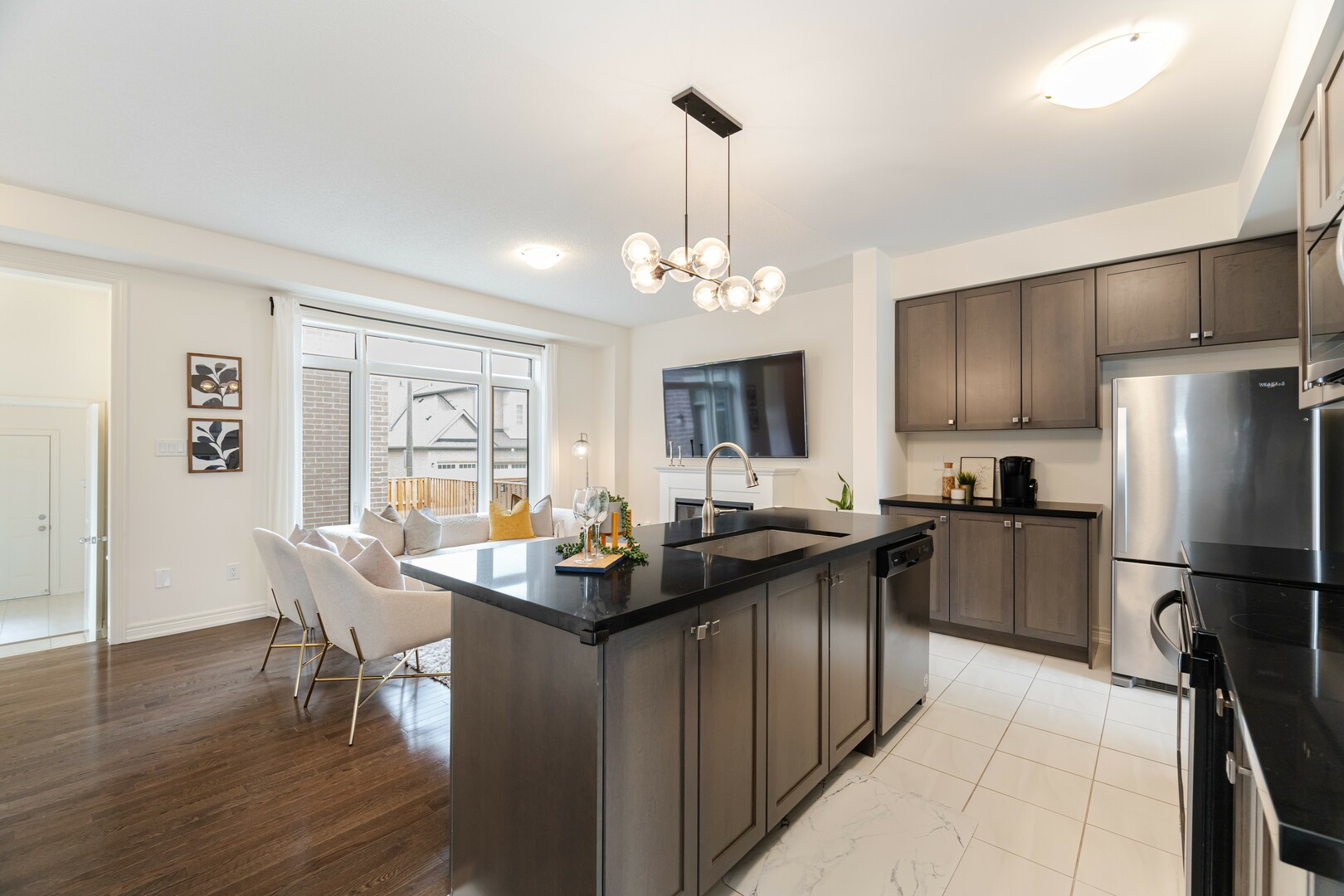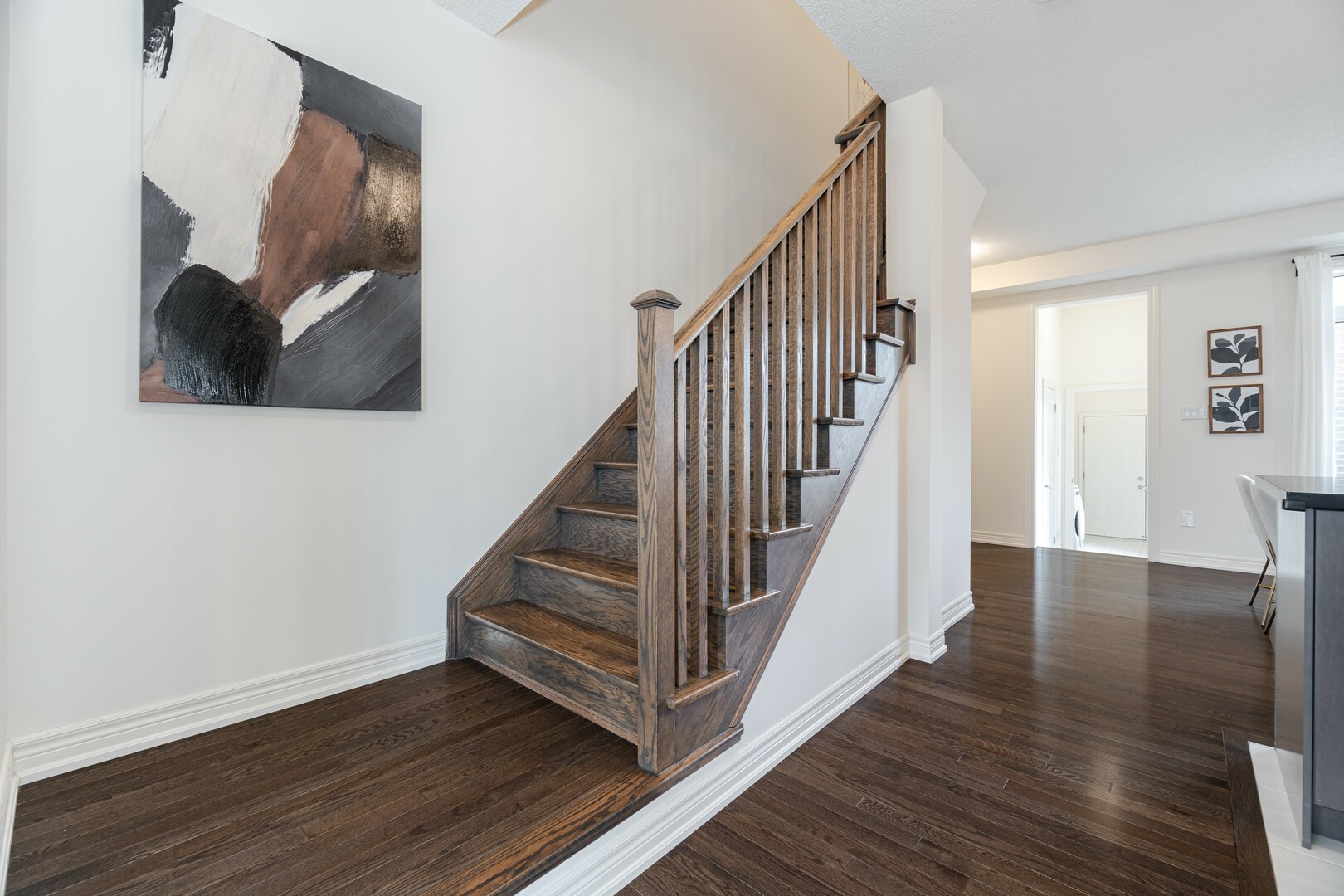 The open-concept kitchen is perfect for entertaining, showcasing sleek quartz countertops and ample cabinetry. Oak stairs lead you to the upper level where the luxurious primary suite awaits—complete with a large walk-in closet, a spa-like 5-piece ensuite, and a cozy sitting area.