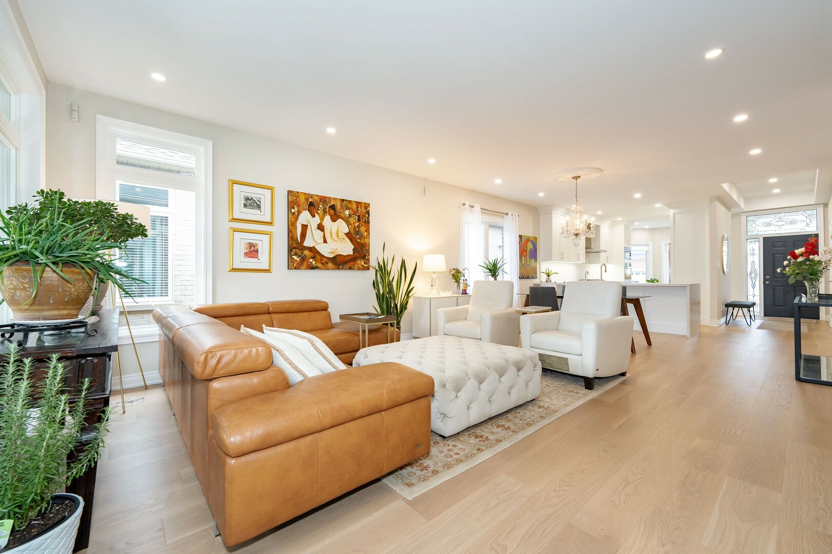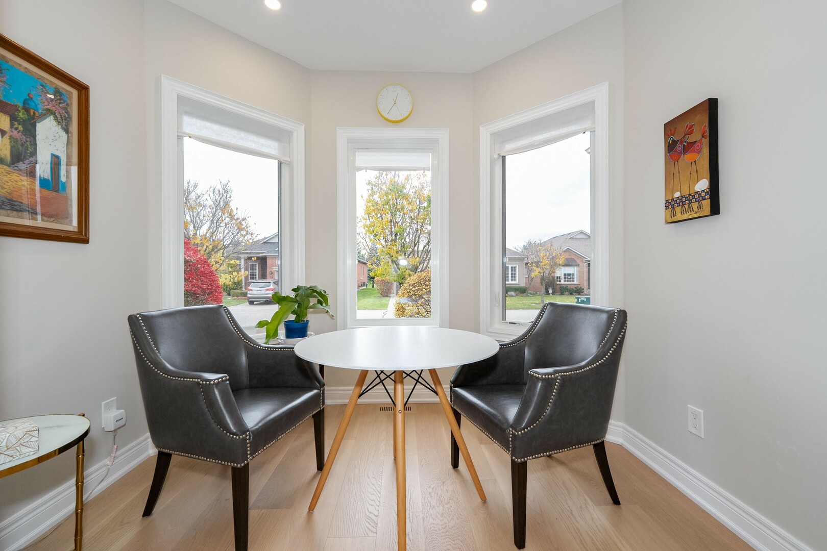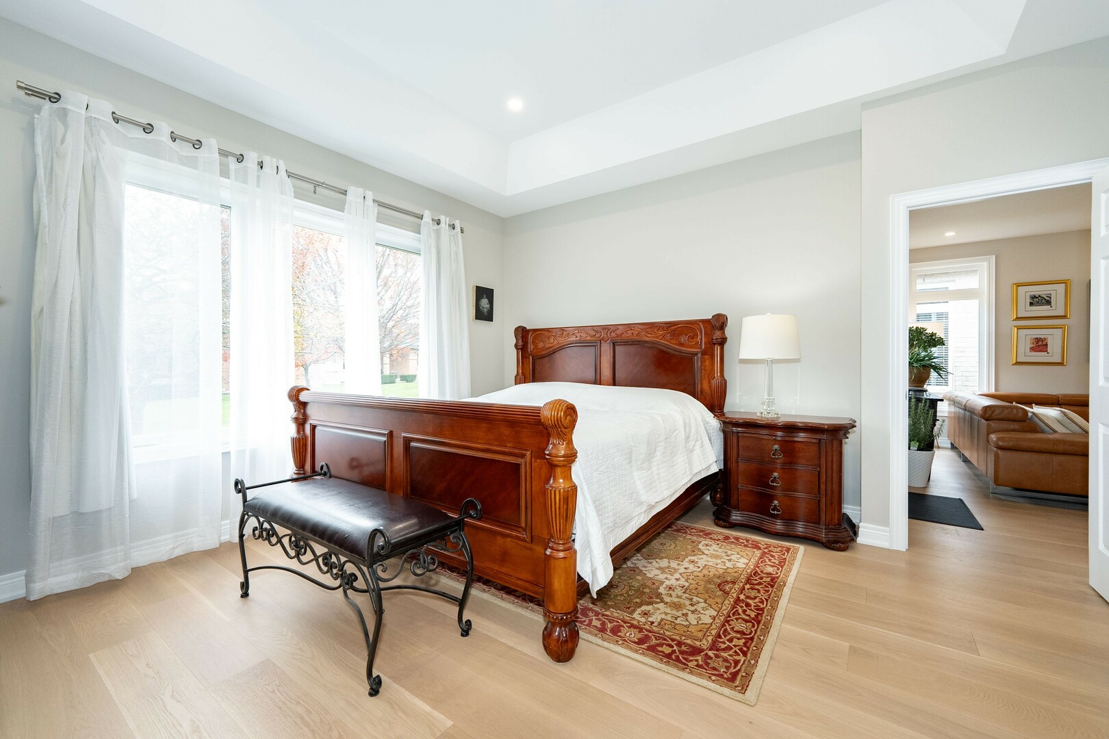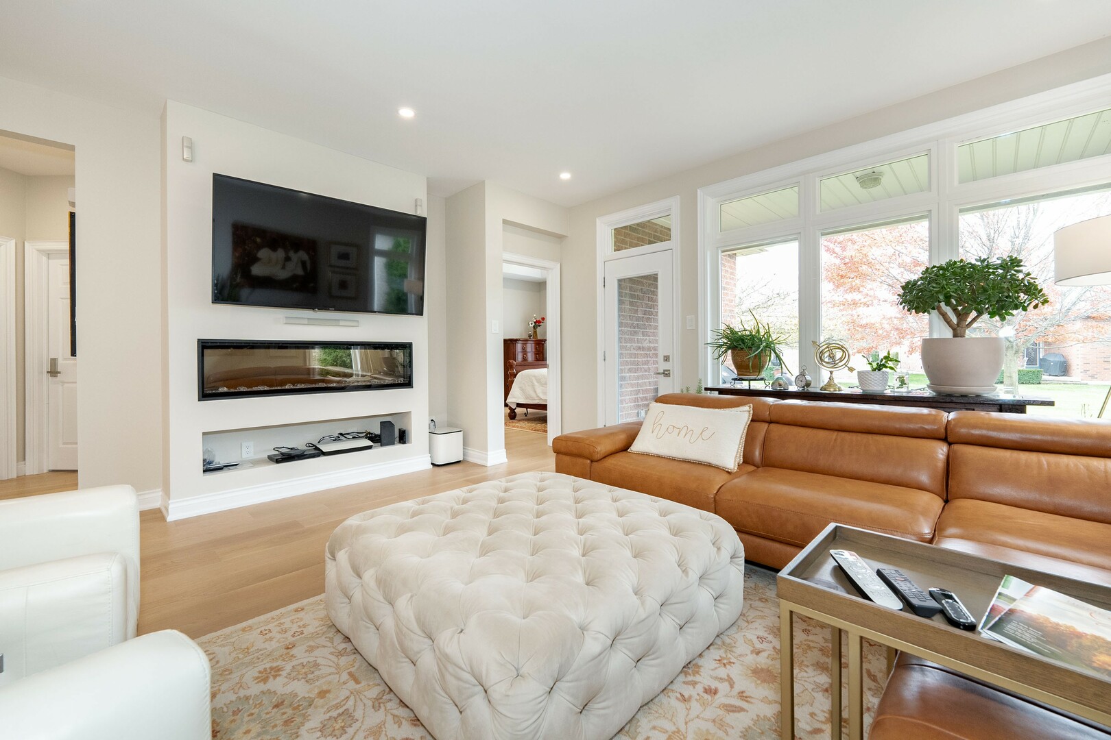 A Real Showstopper! Beautifully renovated 2023-2024 Pinehurst Model 1700 sf. Turn key condition. Modern, Contemporary, Elegant, Open concept floorplan. 9 ft smooth ceilings, LED pot lites, 7.5 inch Canadian Vintage Solid White Oak plank flooring through out the main floor (except bathrooms). Must see! New Designer Kitchen, Modern Built in Cabinetry, under cabinet LED lighting, Quartz Counter, Backsplash/Waterfall, all created for modern accessibility and upmost functionality, Blum metal pull outs, soft close drawers/doors, pantry. Spice pullout and tray holders. Top of the line built in Miele appliances, Frigidaire Professional Series Counter Depth Fridge. Bungalow sits on a Quiet street, backing south/west to a serene, natural private setting. Patio has a covered roof and BBQ area to enjoy entertaining, step out to enjoy Ballentrae sunsets and the outdoors.Enjoy the bright Living Room, electric fireplace/heat comfort feature, amazing space for your enjoyment and entertaining family & friends.Two full unique luxurious baths on main floor, one with walk in shower and the other, Bain Ultra Air Jetted Spa Tub and Shower both with porcelain tiles, imported vanities, medicine chest to maximize storage space, tempered glass dividers, accessories. Enjoy the lifestyle within the Ballentrae Golf & Country Club, surrounded by the quiet beauty of the golf course setting, recreation centre, indoor hot tub/salt water swimming pool, gym , tennis and bocce courts. Close to Musselman's Lake, Main St Stouffville and the convenience of Aurora/Newmarket nearby. Pls see: Inclusions, Upgrades & Maintenance Info attached with feature sheet to listing. You will love it ! **EXTRAS** 9 ft ceilings main floor, custom built closets with organizers, luxury spa-like baths, save on electric bills with new LED lighting and 60in electric fireplace/heat, Coffered ceilings front entry and Primary bdrm